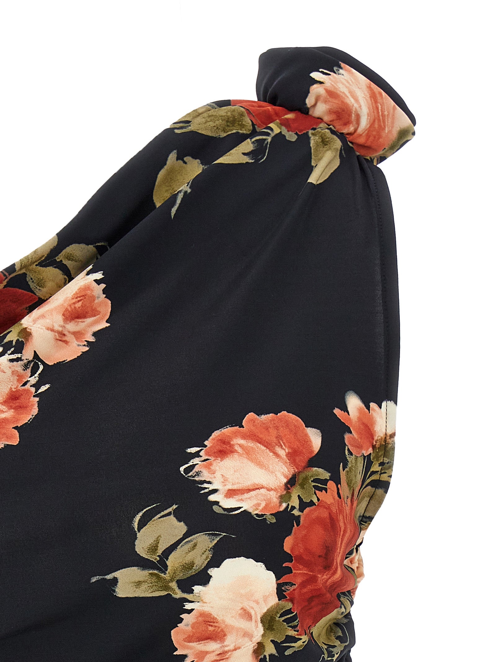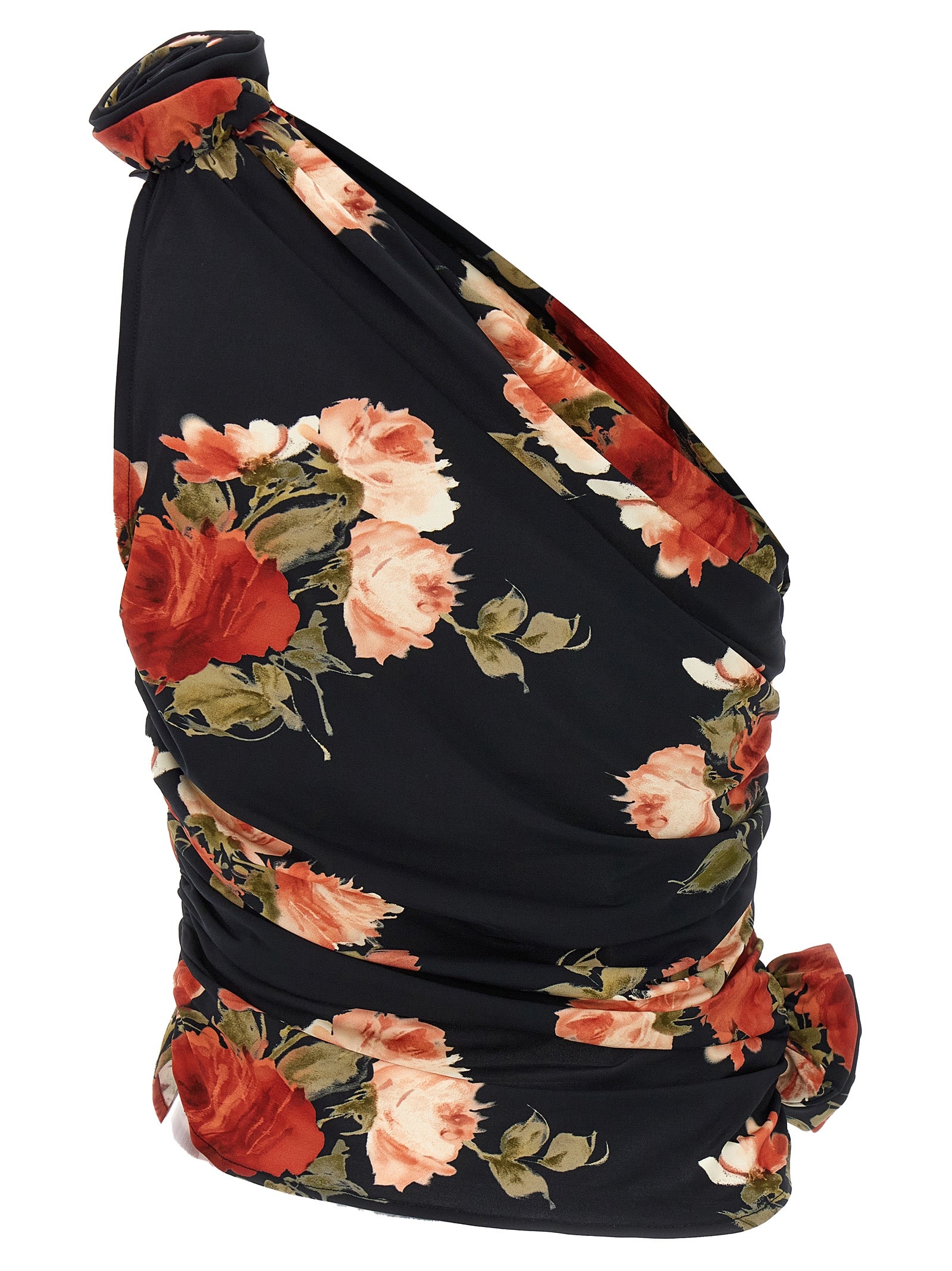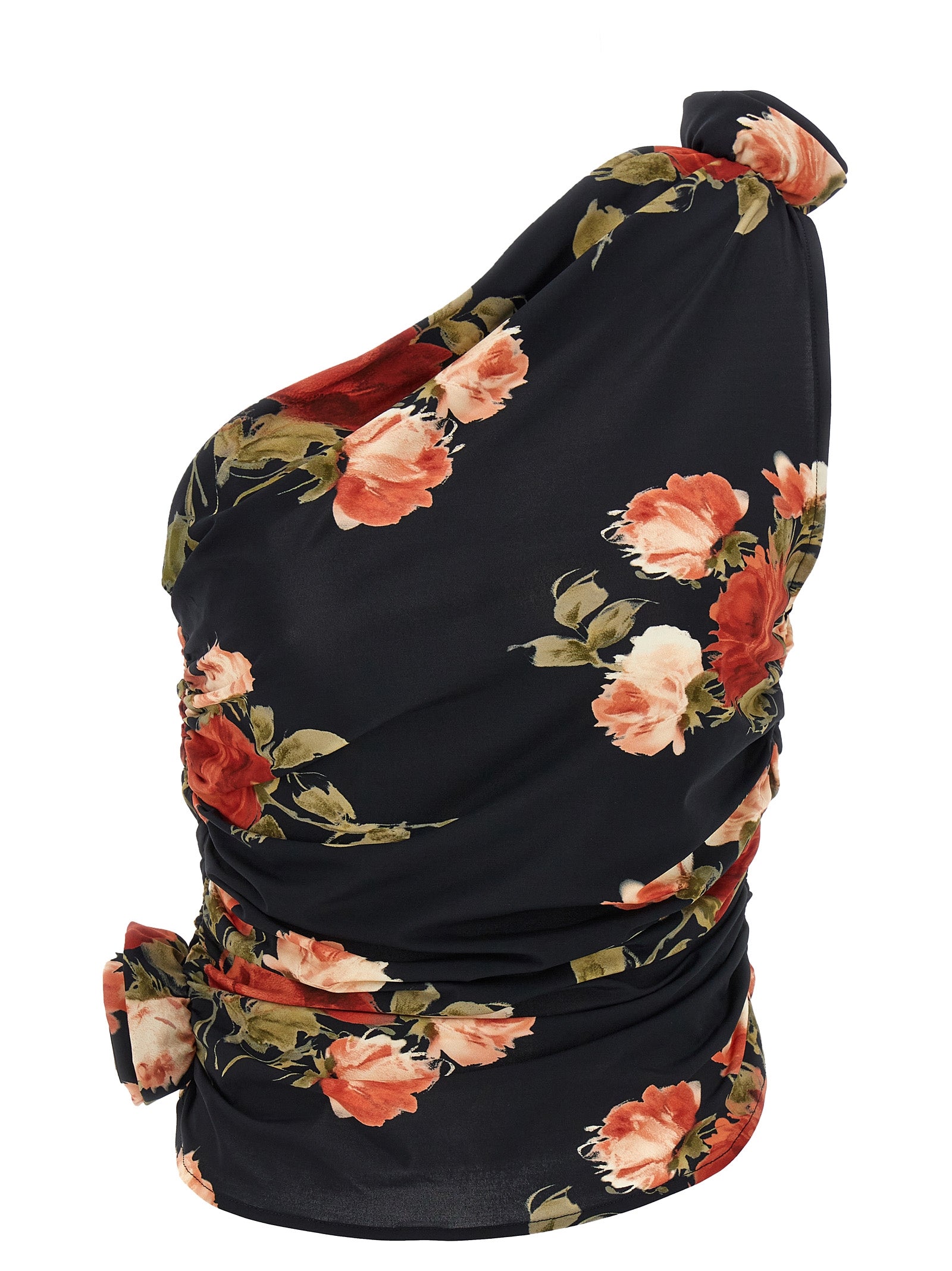 Top Off-the-Shoulder 01 in tessuto per allungamento a stampa floreale con applicazione di rose e orlo asimmetrico.