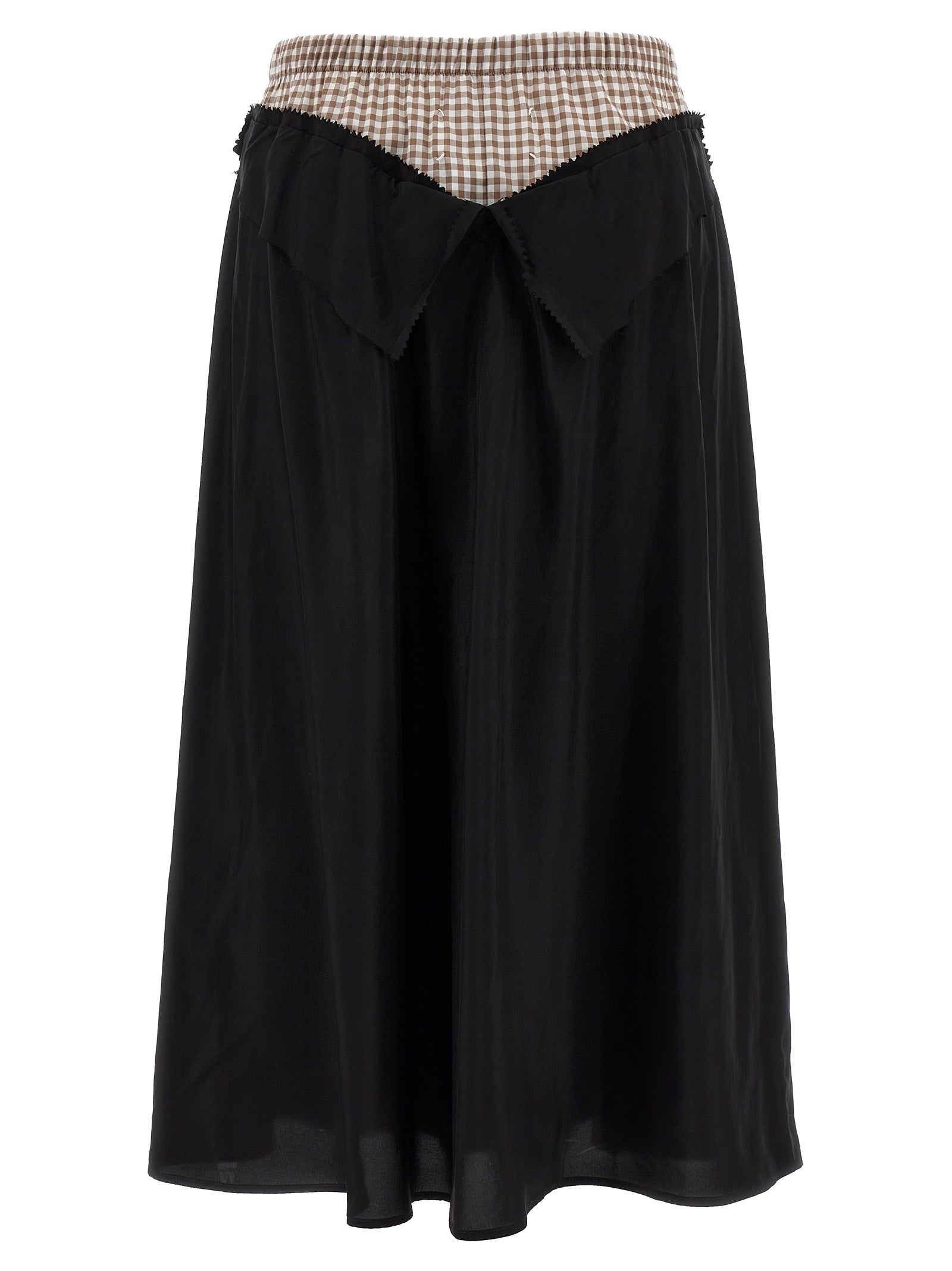 Gonna midi "Anonimità della fodera" in cotone e viscosa, cintura elastica con tessuto vichy e prua a contrasto, dettagli in vita in tessuto a pieghe che crea una volant con bordi tagliati crudi ottenuti attraverso la tecnica del décortiqué, modello svasata.