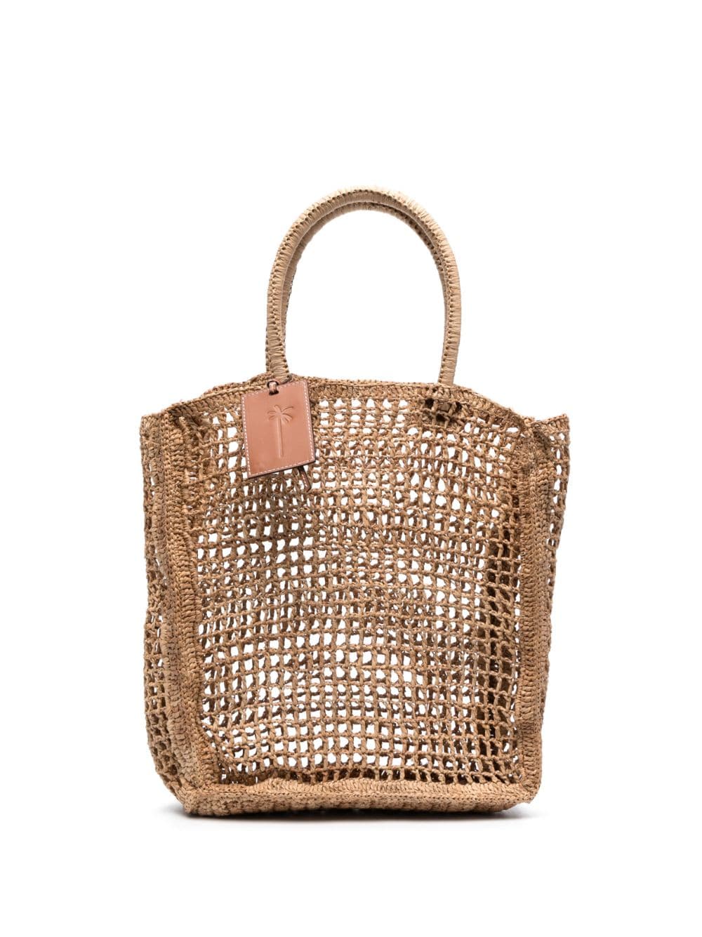 TOTE BAG RAFIA LOGO-TAG di MANEBI con beige, design della rafia intrecciato, design trasparente, tag logo, due maniglie arrotolate, forma del rettangolo e scomparto principale.