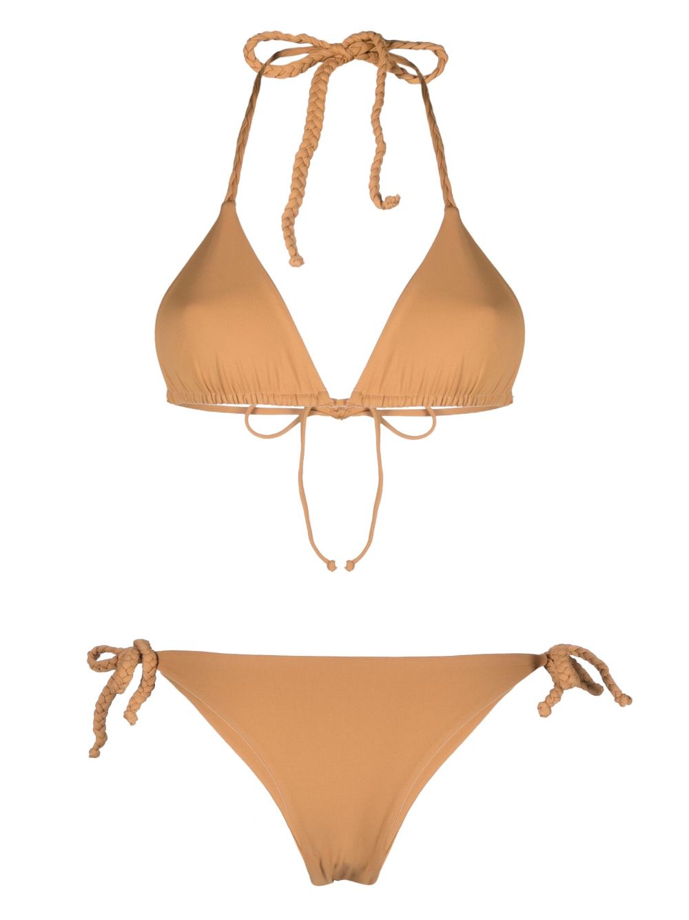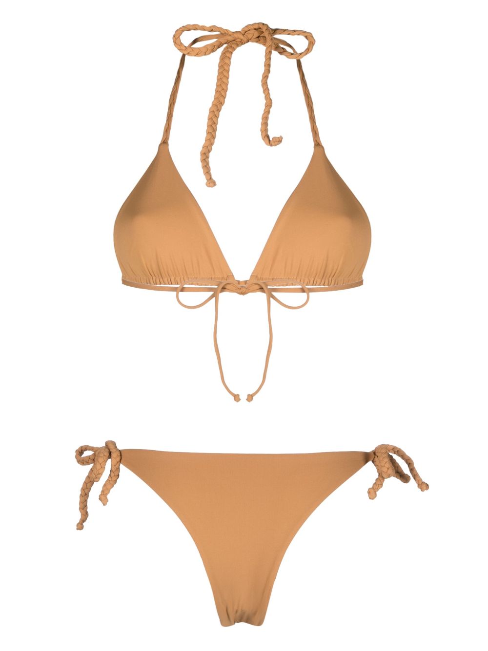 Bikini a triangolo intrecciato di Manebi con Butterscotch Brown, Design, cinghia intrecciato, fissaggio di cravatta Halterneck, tazza di triangolo, fissaggio per cravatta posteriore, fondo cravatta e vita elastica. Sii consapevole di provare costumi da bagno sopra i tuoi indumenti ..