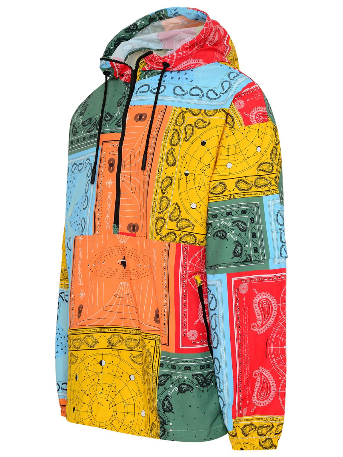 Cappuccio coulia, pattern bandana stampato dappertutto, croce bianca ricamata sul cofano, chiusura con cerniera sul davanti, due tasche con cerniera, polsini elastici