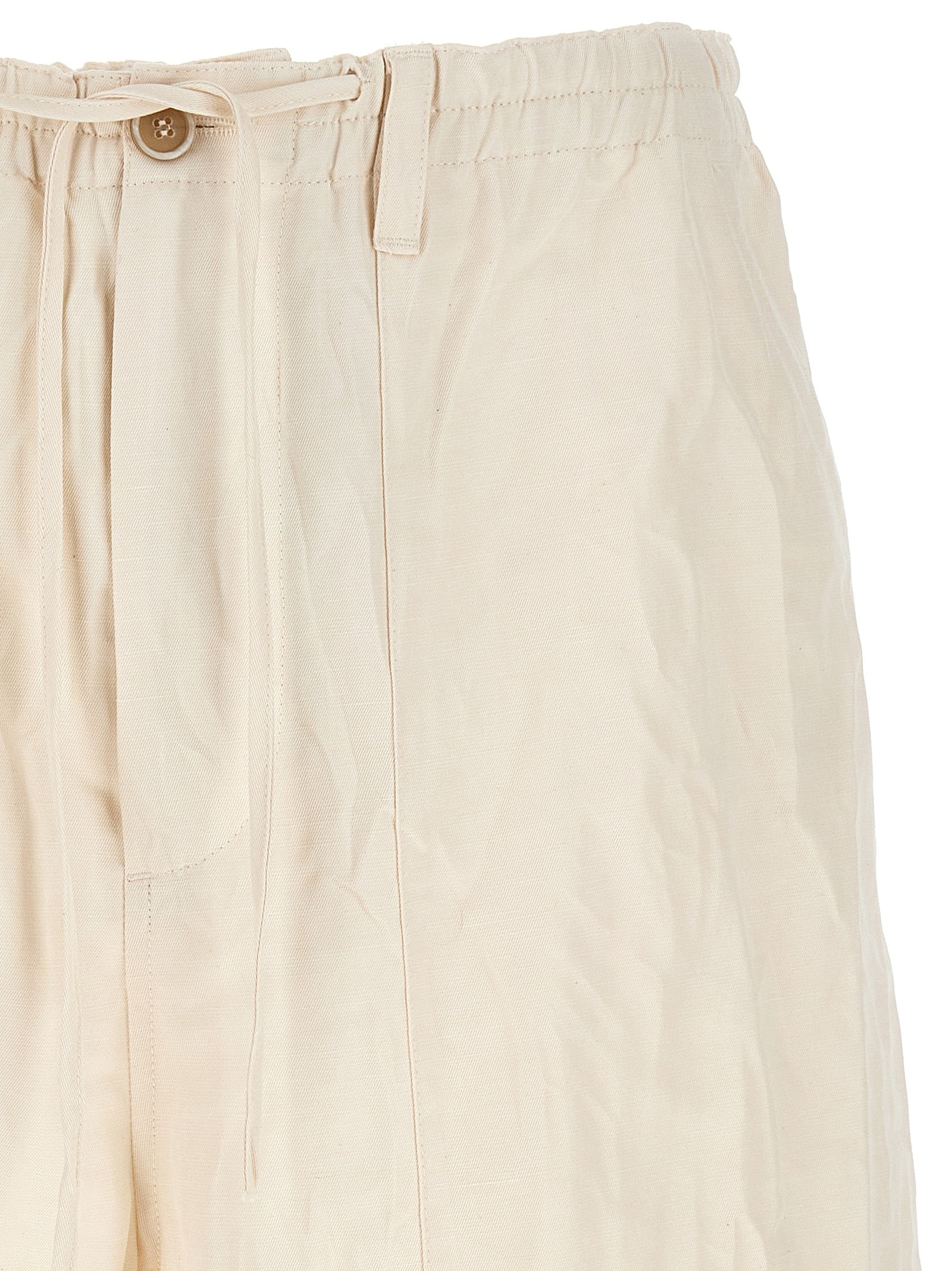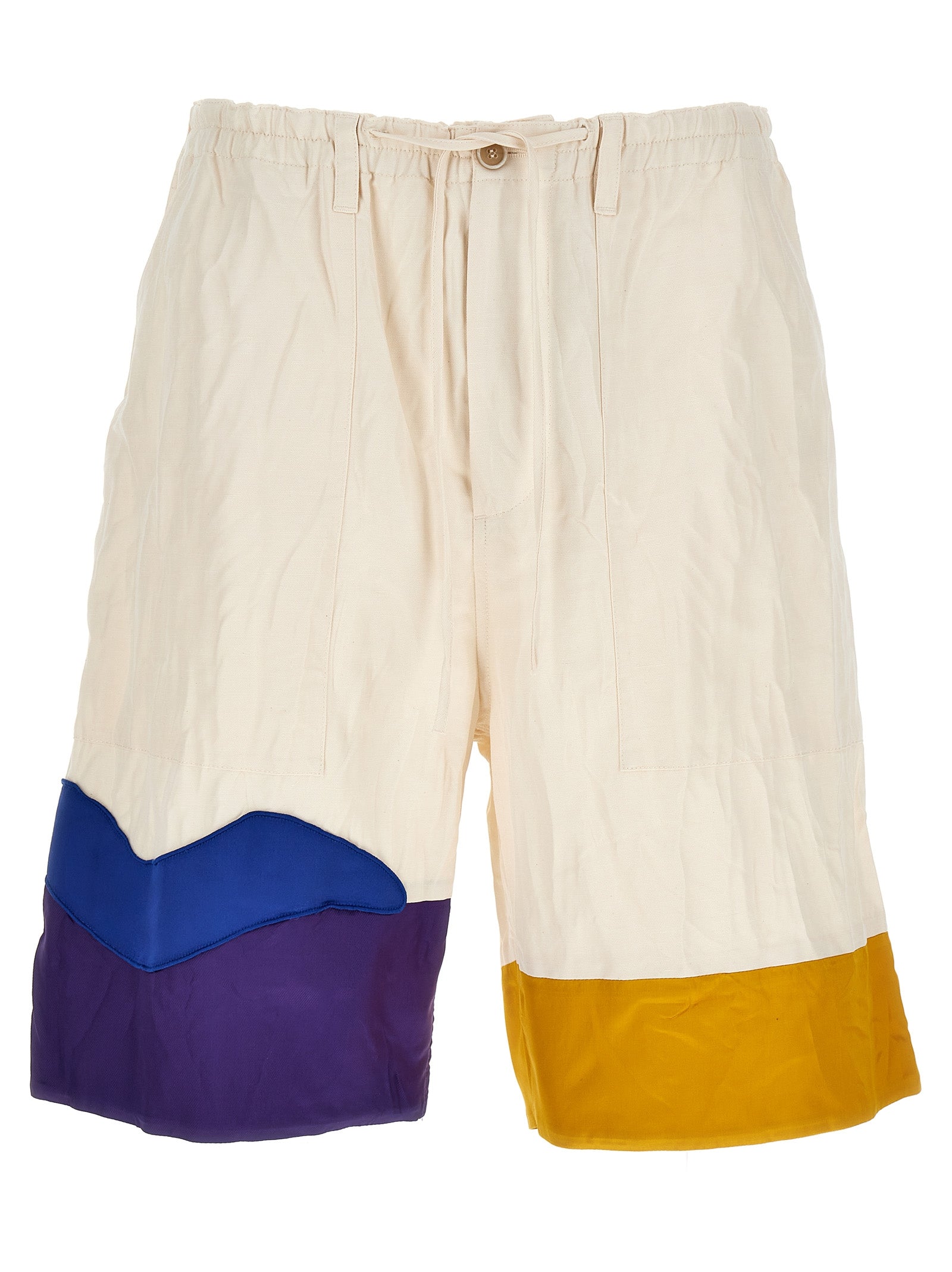 Nessun High Capsule Linen Linen di Linen Sumpi Shorts con inserti patchwork, chiusura a zip e pulsanti, elastico e coulisse in vita, tasche.