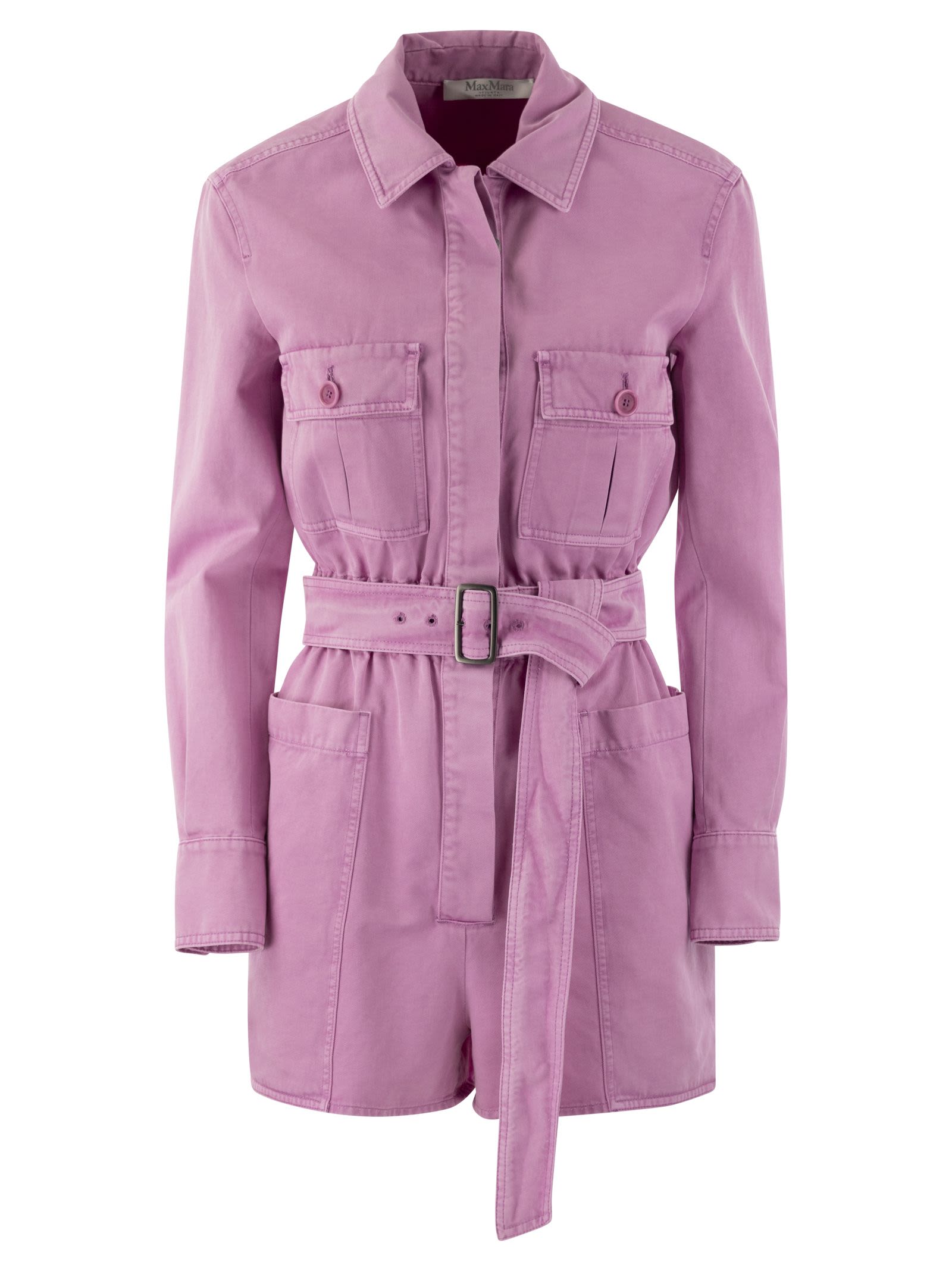 Tuta corta ispirata al lavoro realizzato in cotone puro, trapano tinto di indumento. La silhouette è caratterizzata da una vita alta elastica, maniche lunghe con polsini a camicia e tasche a flap abbottonate sul petto. I pantaloni corti sono completati da grandi tasche patch che avvolgono i fianchi e finiscono sul retro. La cintura con fibbia di metallo enfatizza la vita. - Fissaggio del pulsante nascosto - Cintura di abbinamento - ID designer a maniche lunghe: 2411241163600 009