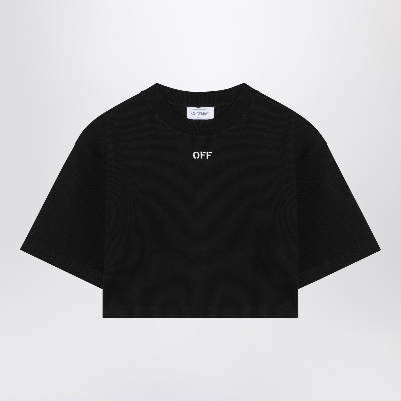 T-shirt a corto di cotone nero da bianco sporco con maniche corte, un design a coste e un logo ricamato sul davanti.