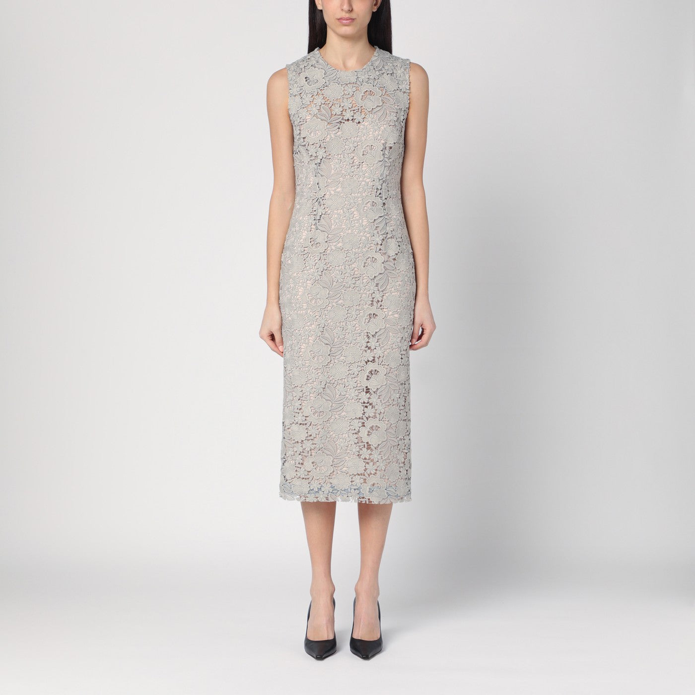 Abito midi senza maniche con un collo tondo di P.A.R.O.S.H. In pizzo grigio chiaro, con una chiusura a zip sul retro e una fessura posteriore.