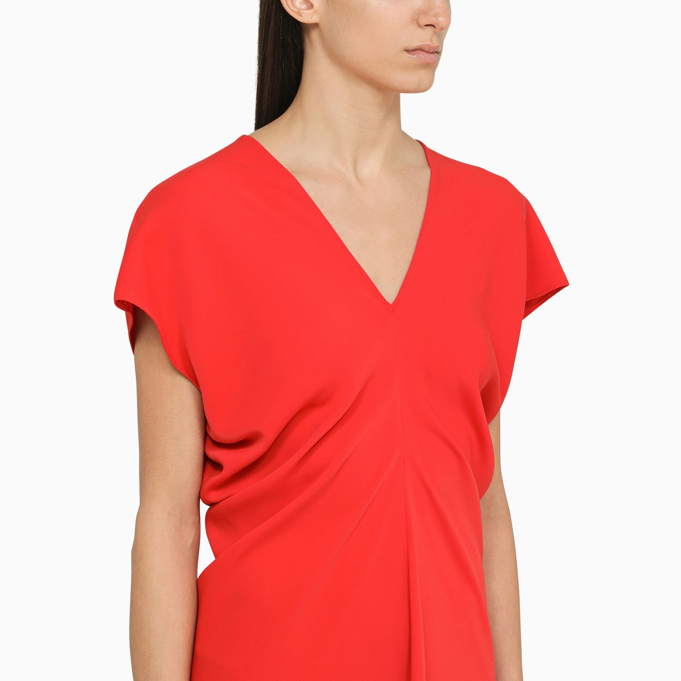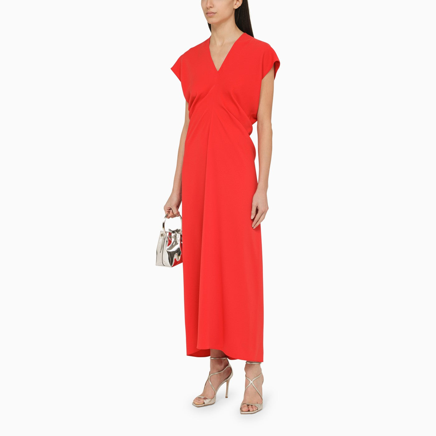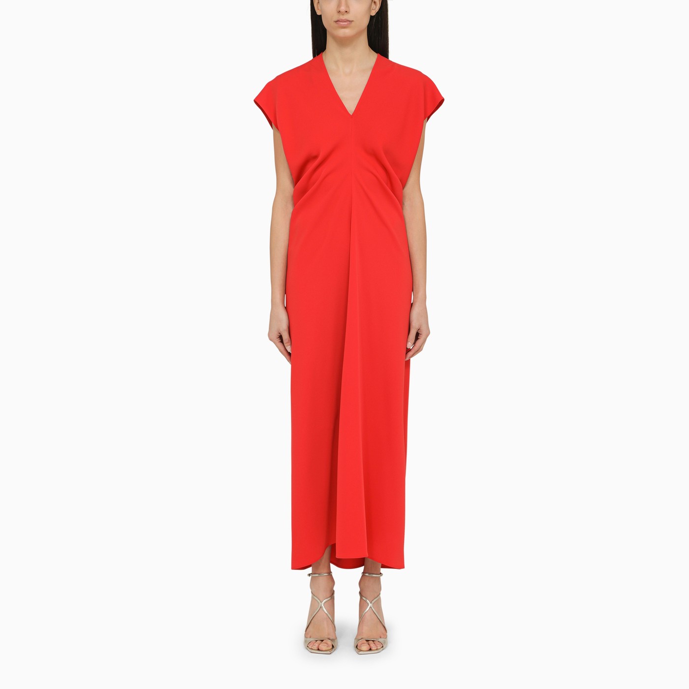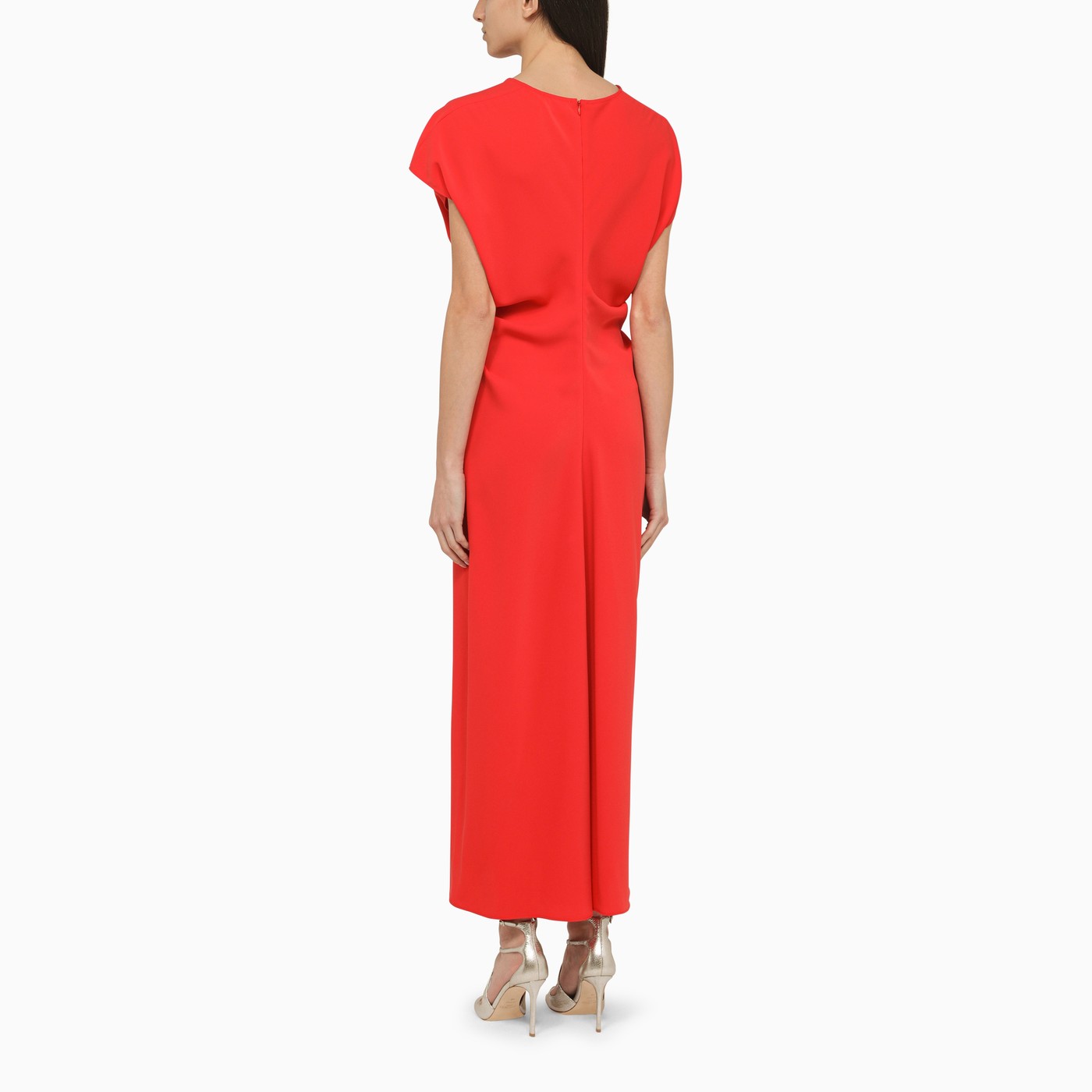 Abito lungo di P.A.R.O.S.H. nella crêpe in poliestere rosse, con un scollo a V, che si radunano ai fianchi, maniche corte e una chiusura con zip posteriore.