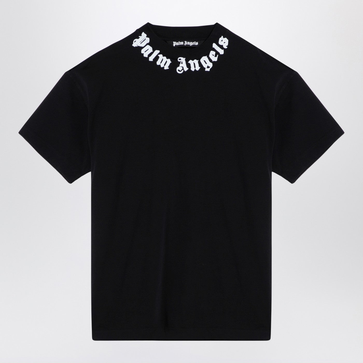 T-shirt degli angeli di palma di cotone nero con un collo dell'equipaggio con lettere a logo a contrasto, maniche corte, toppa di logo laterale e orlo dritto.