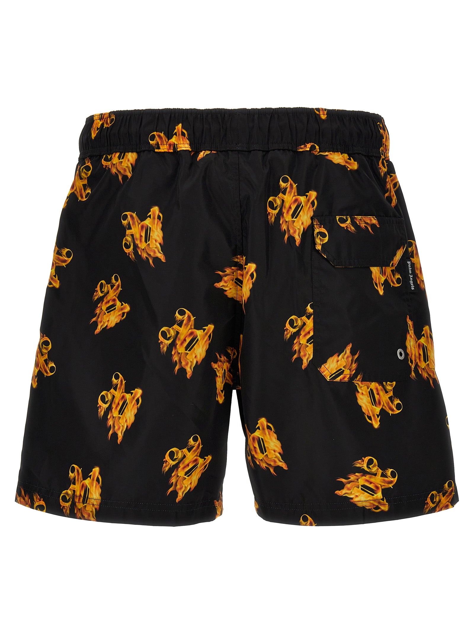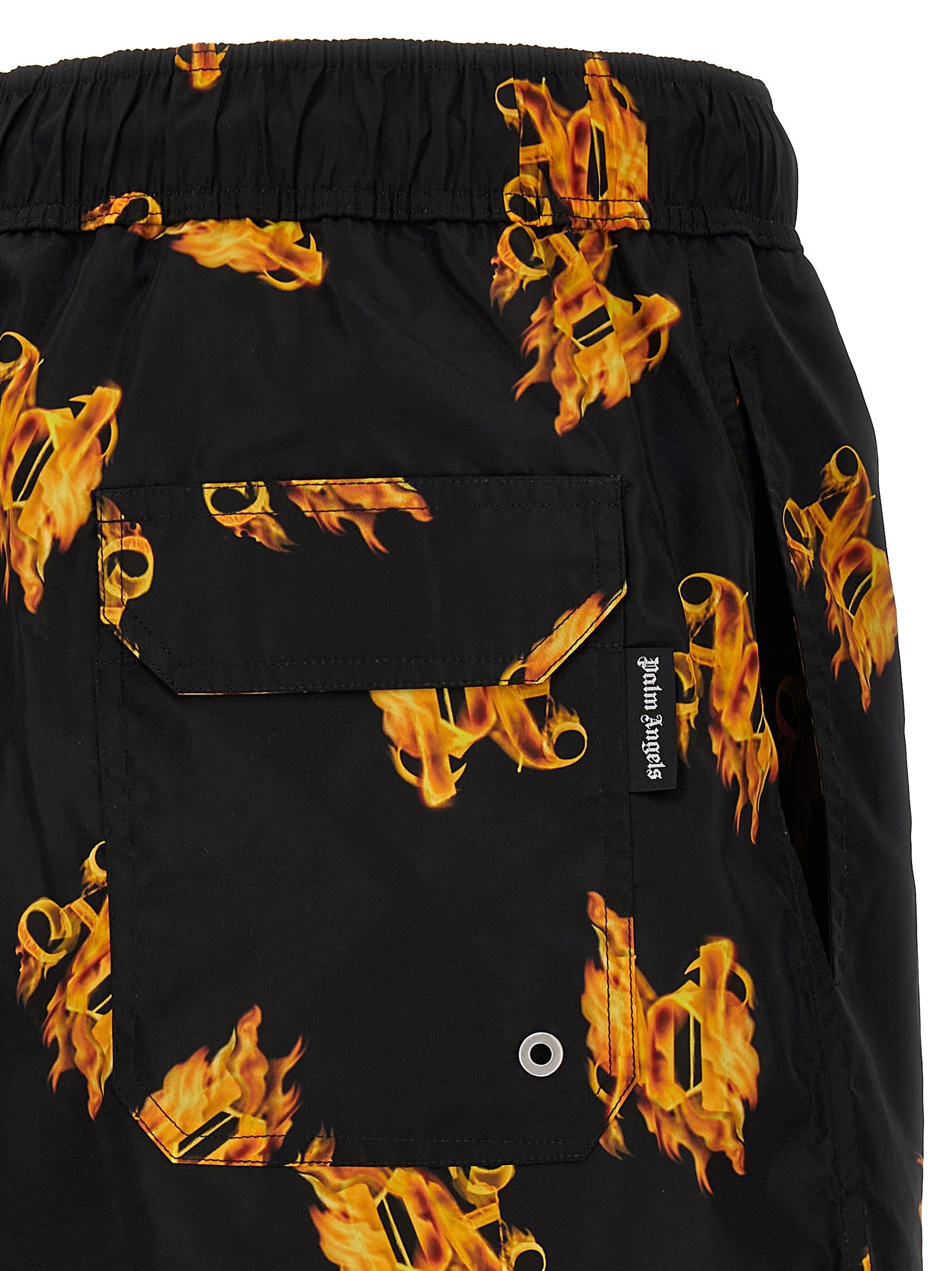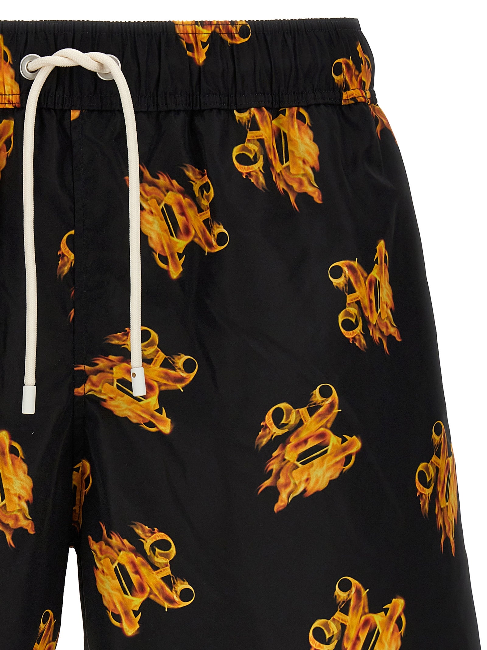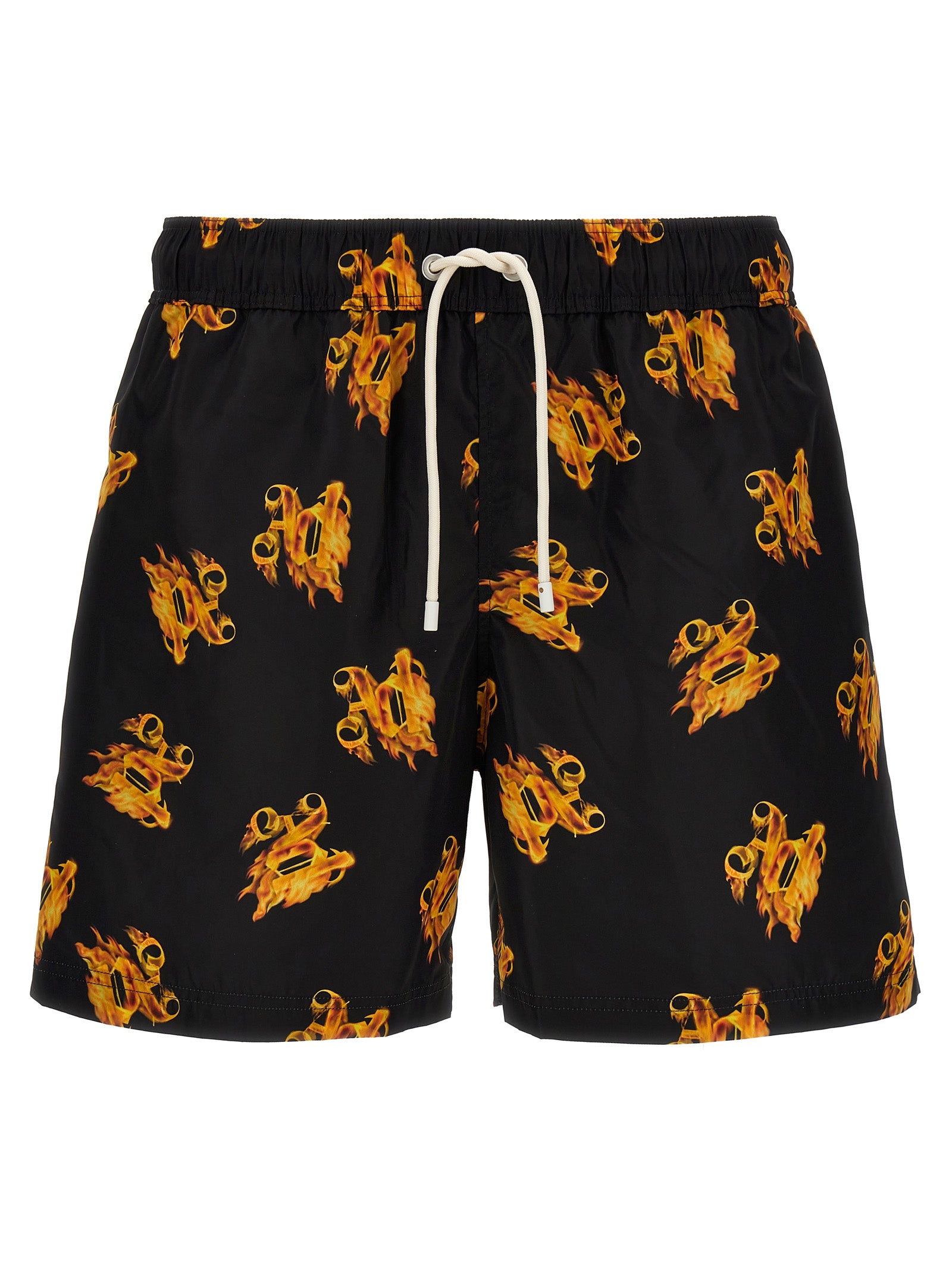 Costume da bagno a "monogramma in fiamme" in tessuto tecnico a stampa all-over, cintura elastica e coulisse, tasche, slip a mesh interiore.
