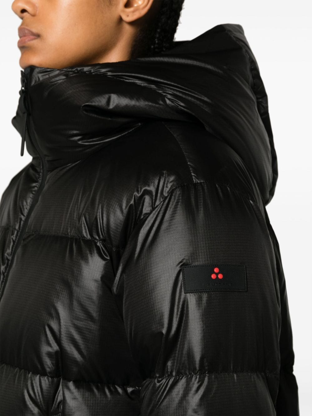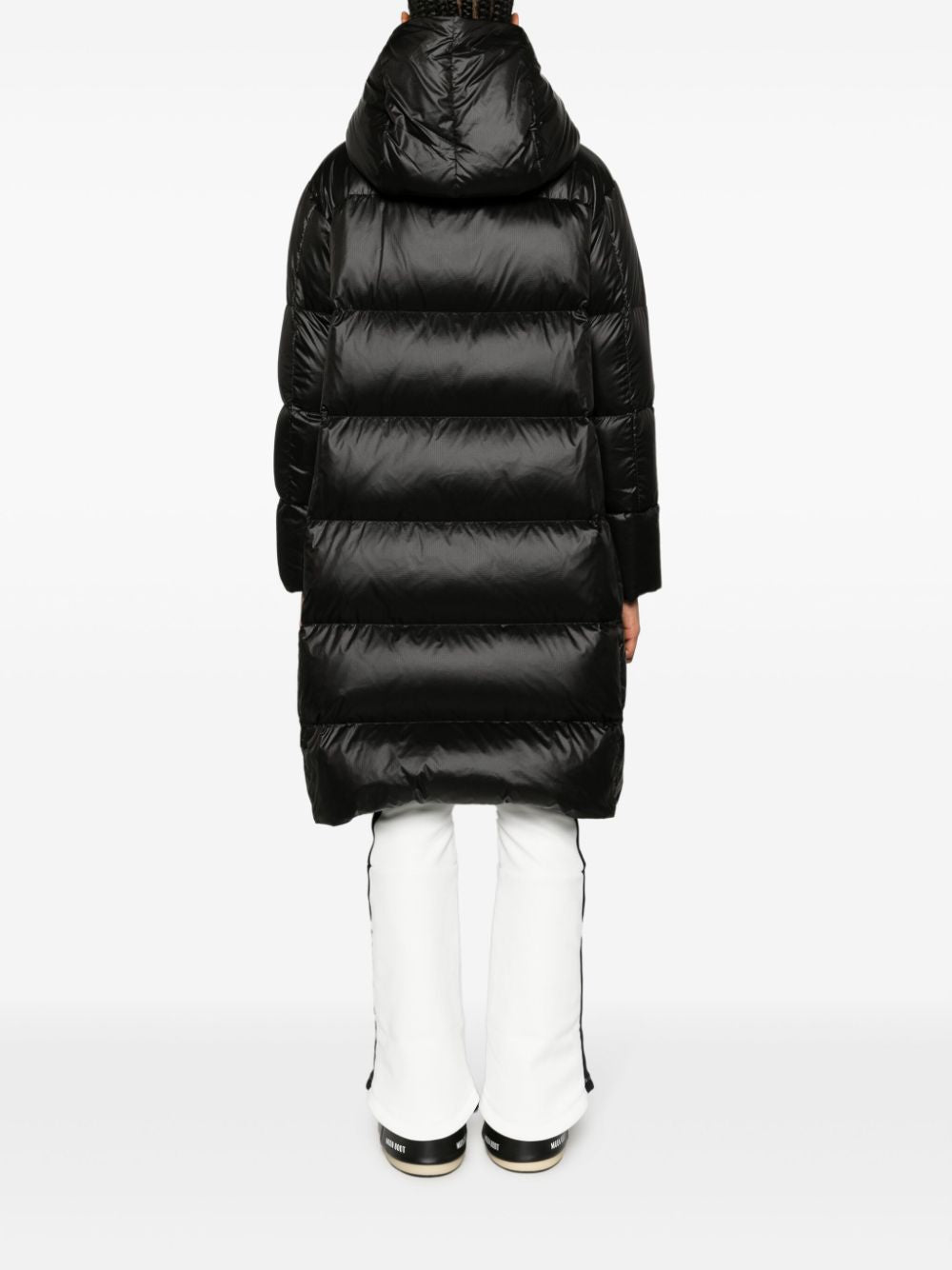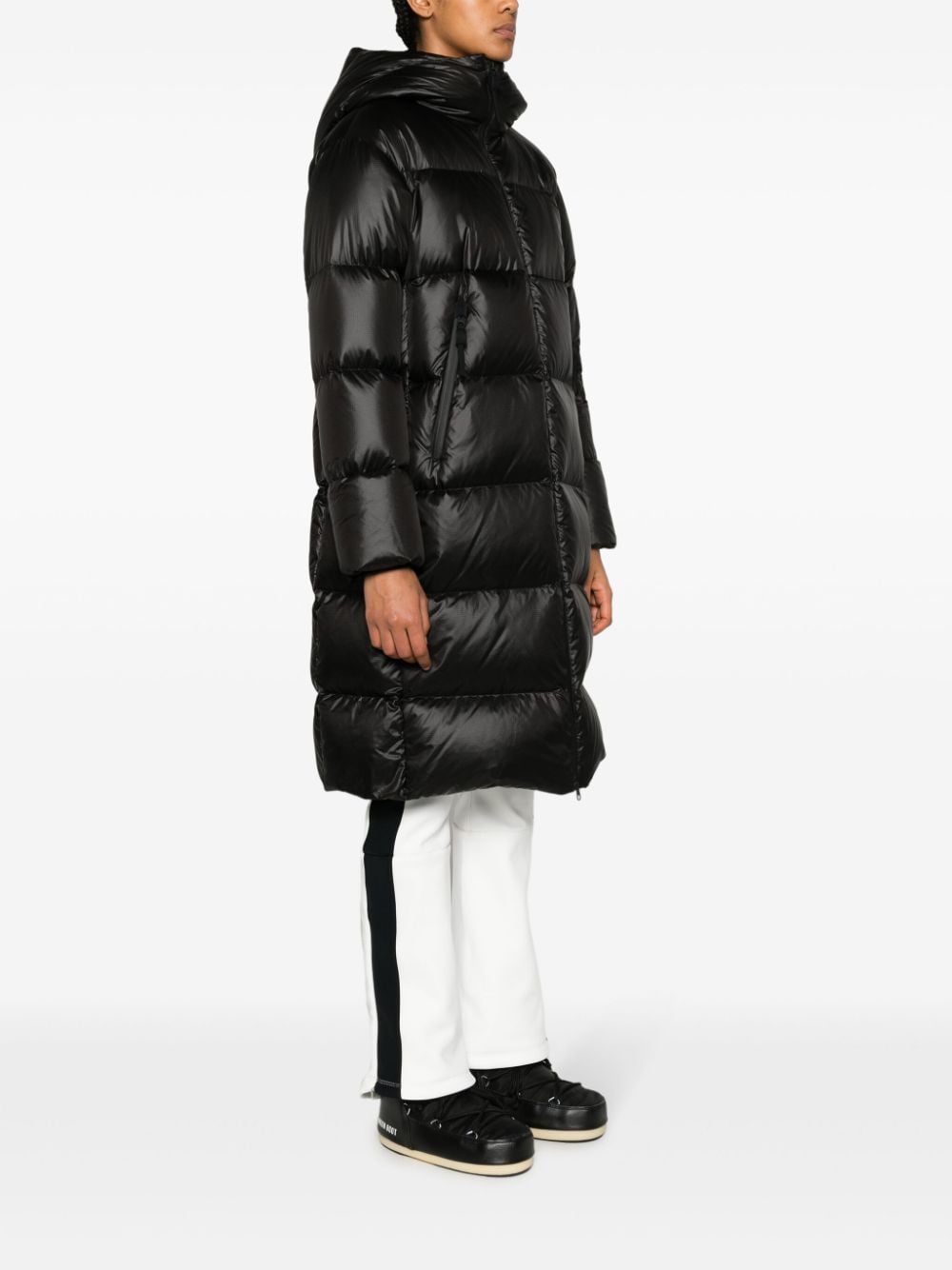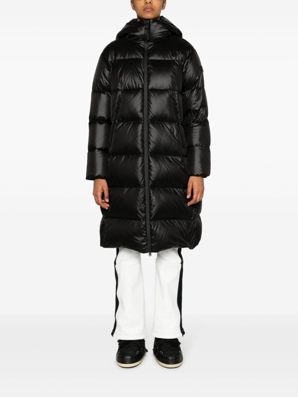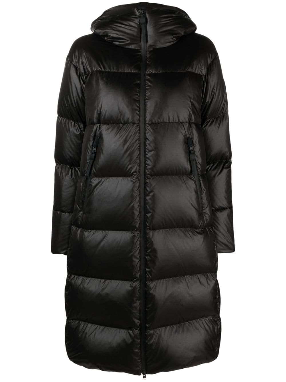 Texture ripstop resistenti all'acqua nera Design imbottito Design trapuntato Appliqué Logo classico Cappuccio Classico Flaccino anteriore Fissaggio a due vie Fissale lunghe tasche di fissaggio anteriore ziplo orlo a metà lunghezza