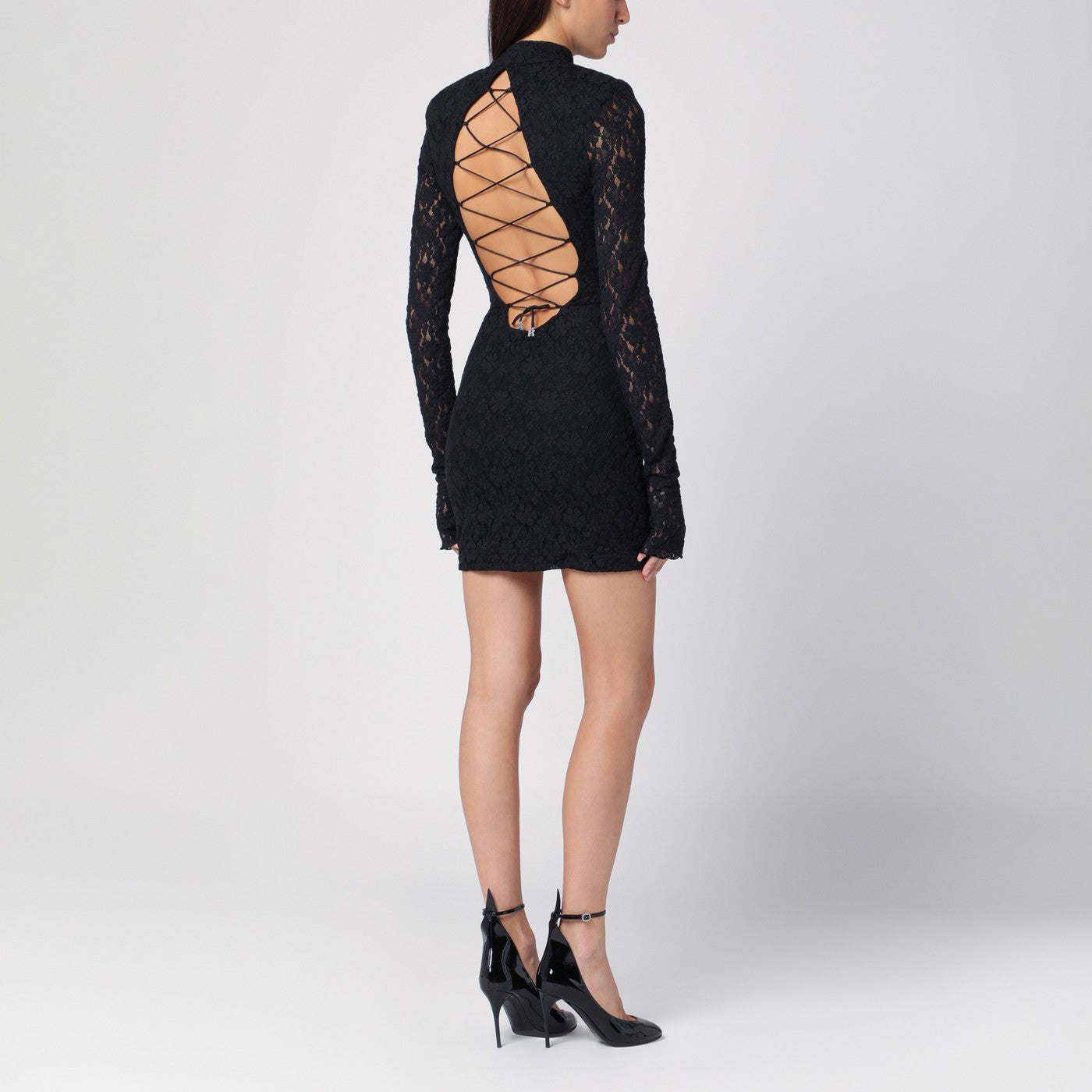 Polyamide riciclata nera e mini abito in pizzo in pizzo di cotone di Rotate, con maniche lunghe semi-sheer, un collo alto, una zip posteriore e legami incrociati sul retro.