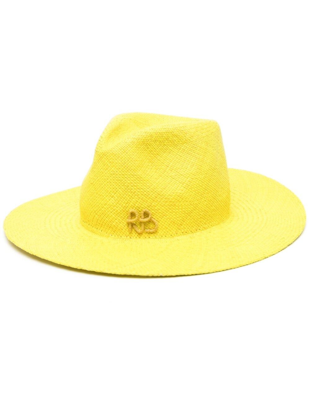 Cappello di paglia di Fedora di Ruslan Baginskiy con logo giallo al limone, paglia, ricamato sul davanti, design intrecciato, bordo piatto e stile pull-on.