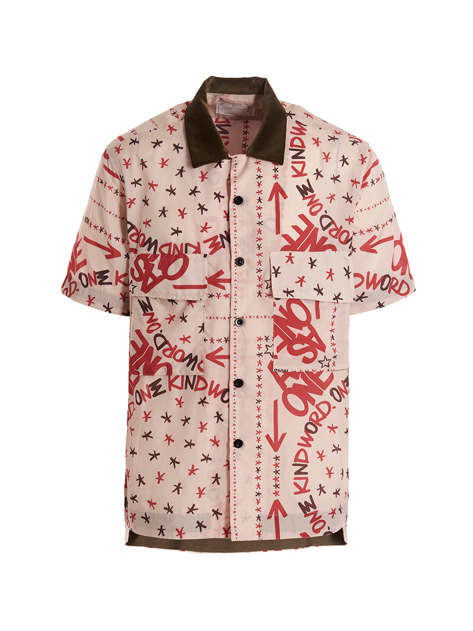 SACAI X ERIC HAZE CAMILA CON UNA STAMPA TUTTO OVER, una chiusura a bottoni, tasche per il torace, maniche corte e un colletto di velluto a contrasto.