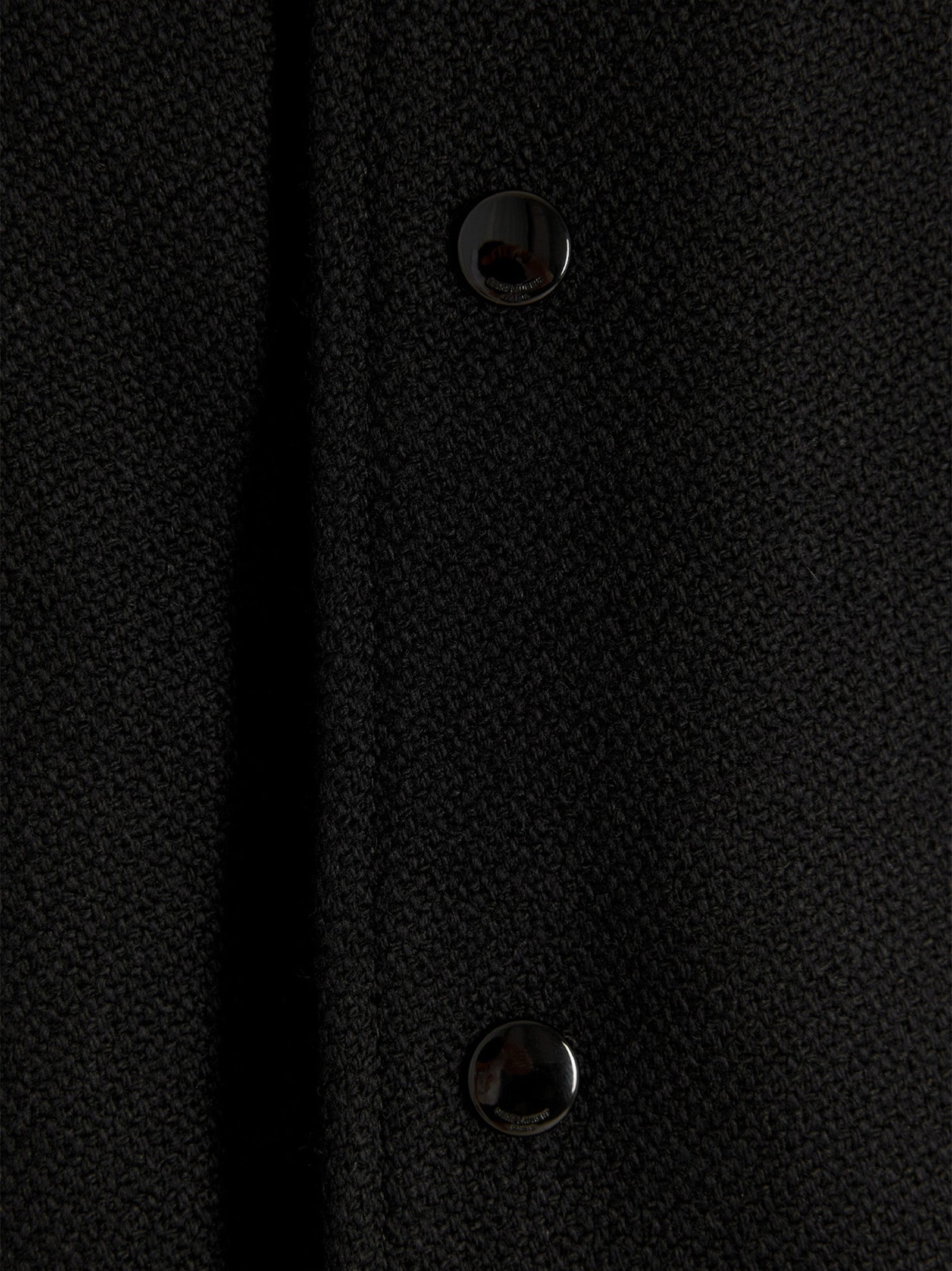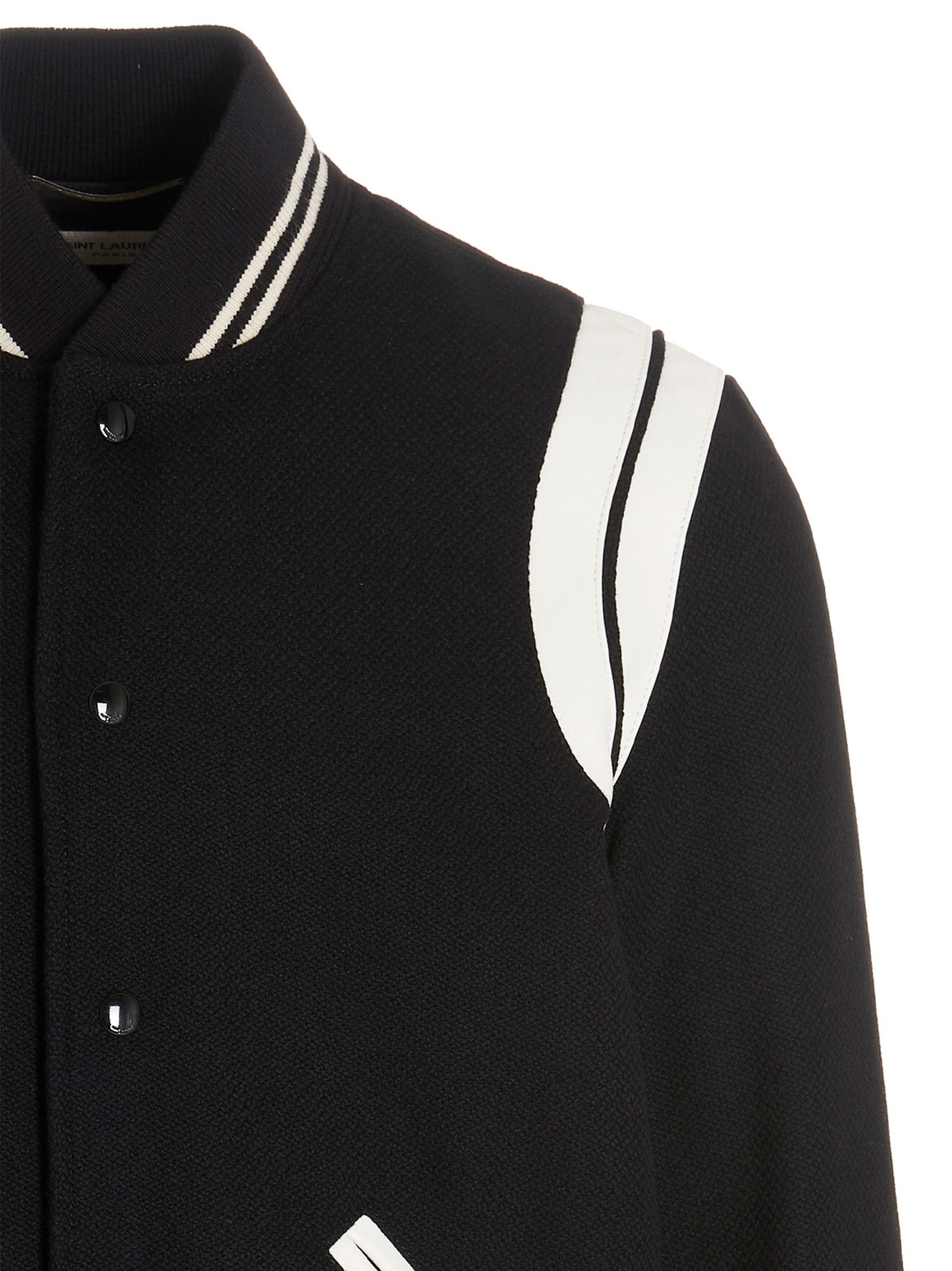 Bomber di lana 'Saint Laurent Teddy' con dettagli in pelle contrastante, chiusura a scatto, polsini sulle maniche e in vita.