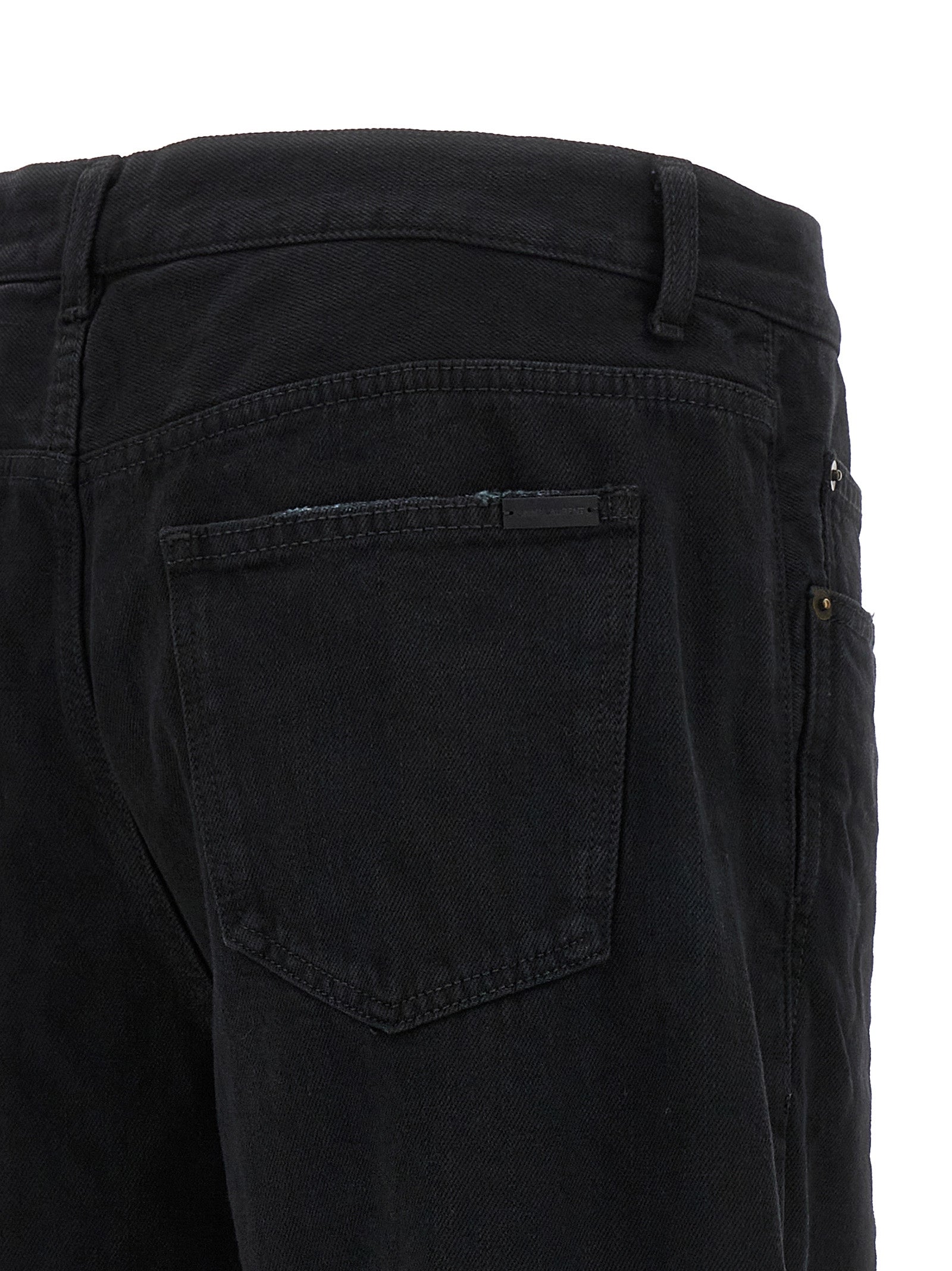 Jeans in denim in cotone a gamba larga con bassa vita, chiusura dei pulsanti, cinque tasche e dettagli di effetto usato.
