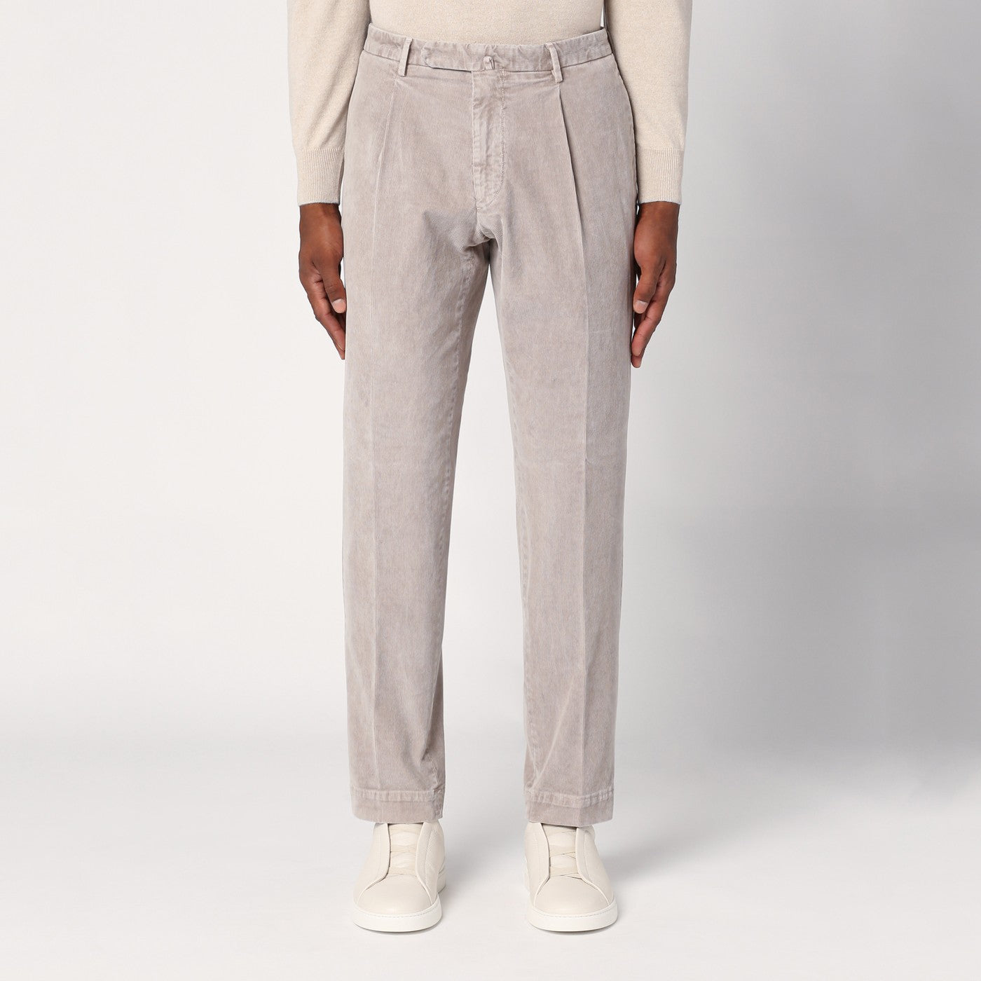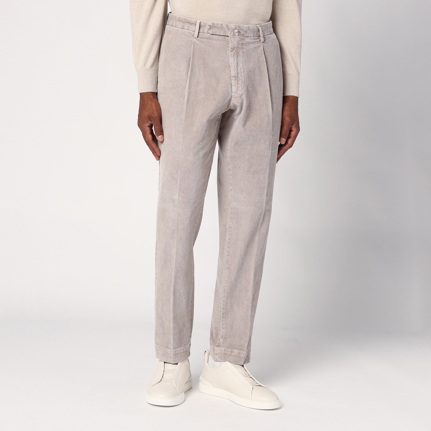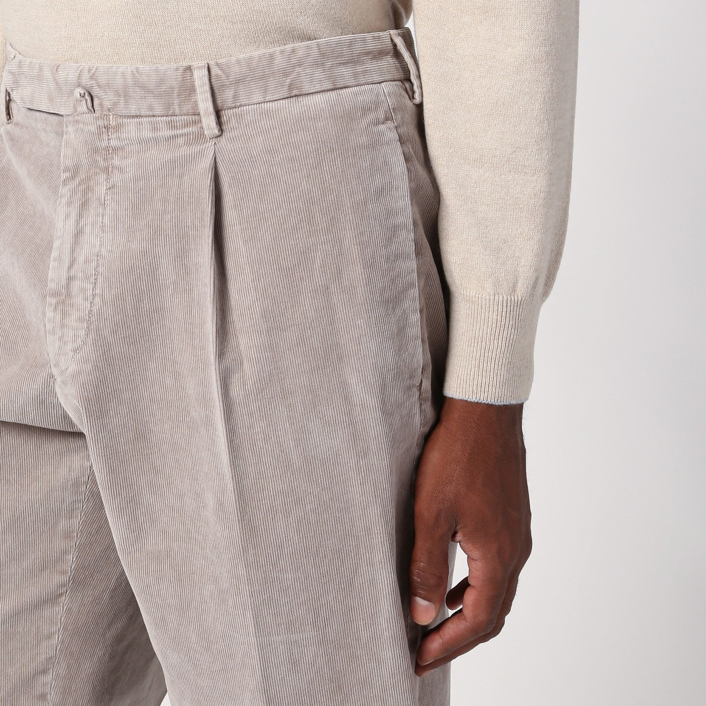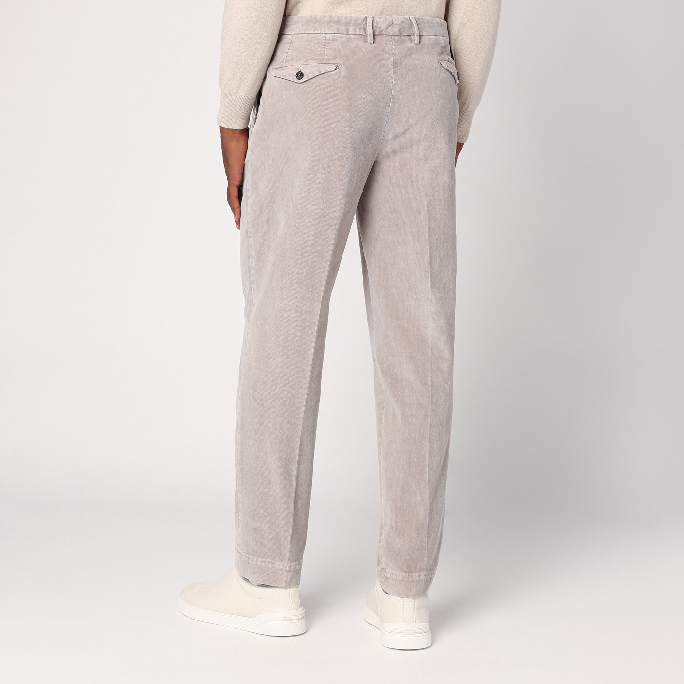 Calcoro a velluto di beige Santaniello con un dispositivo di fissaggio anteriore, anelli in vita, due tasche a marcia laterale e due tasche a forcella posteriore con fissaggio di lembo e pulsanti.