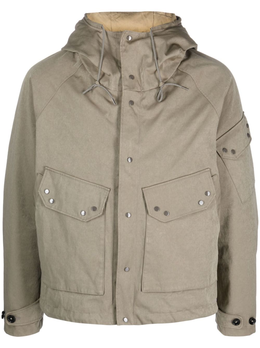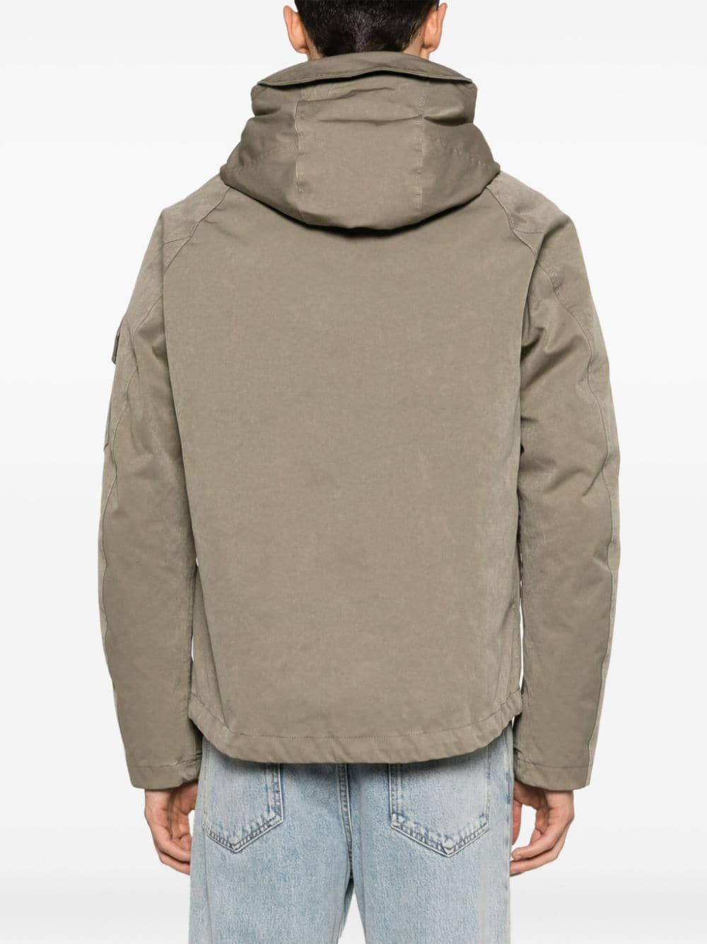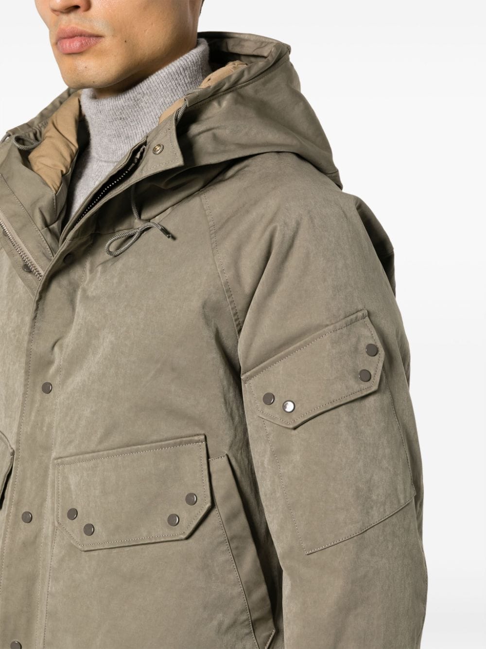 Giacca imbottita con cappuccio di dieci C con kaki, anatra, cotone, cofano, collo a imbuto, maniche lunghe, polsini con cintura, fissaggio anteriore press-stud, tasca per patch di manica, tasche laterali di fissaggio a due pressioni e orlo dritto.