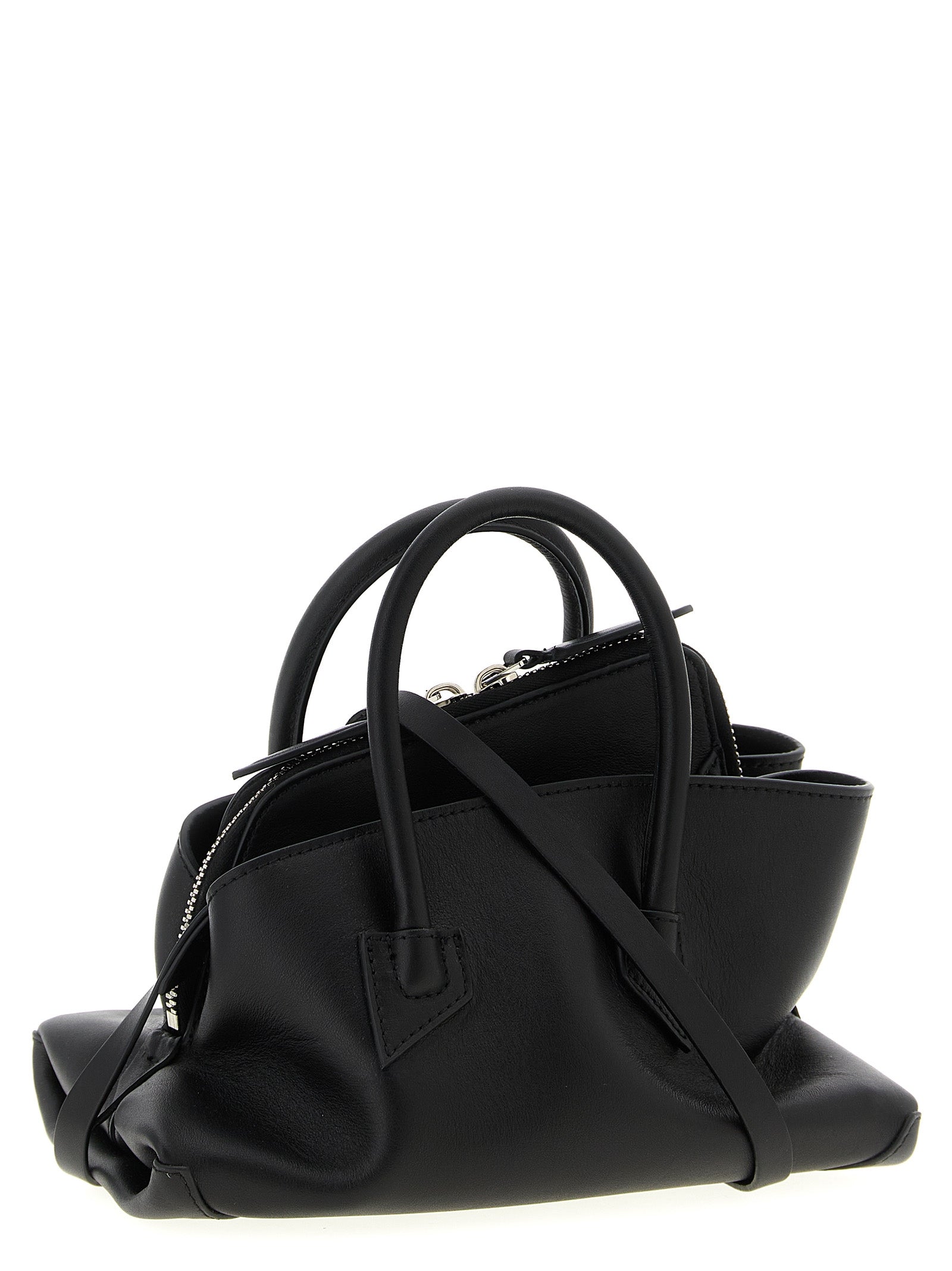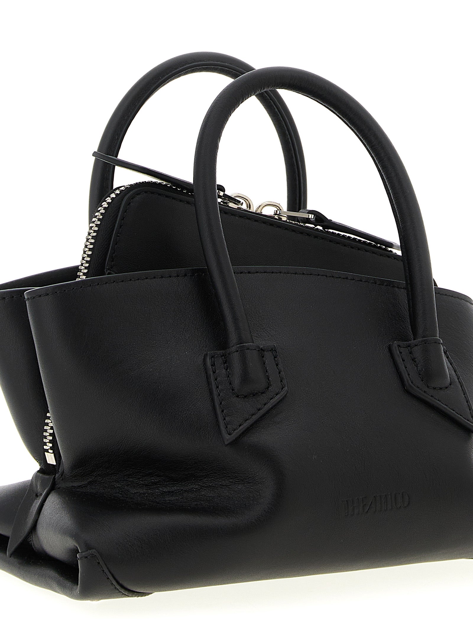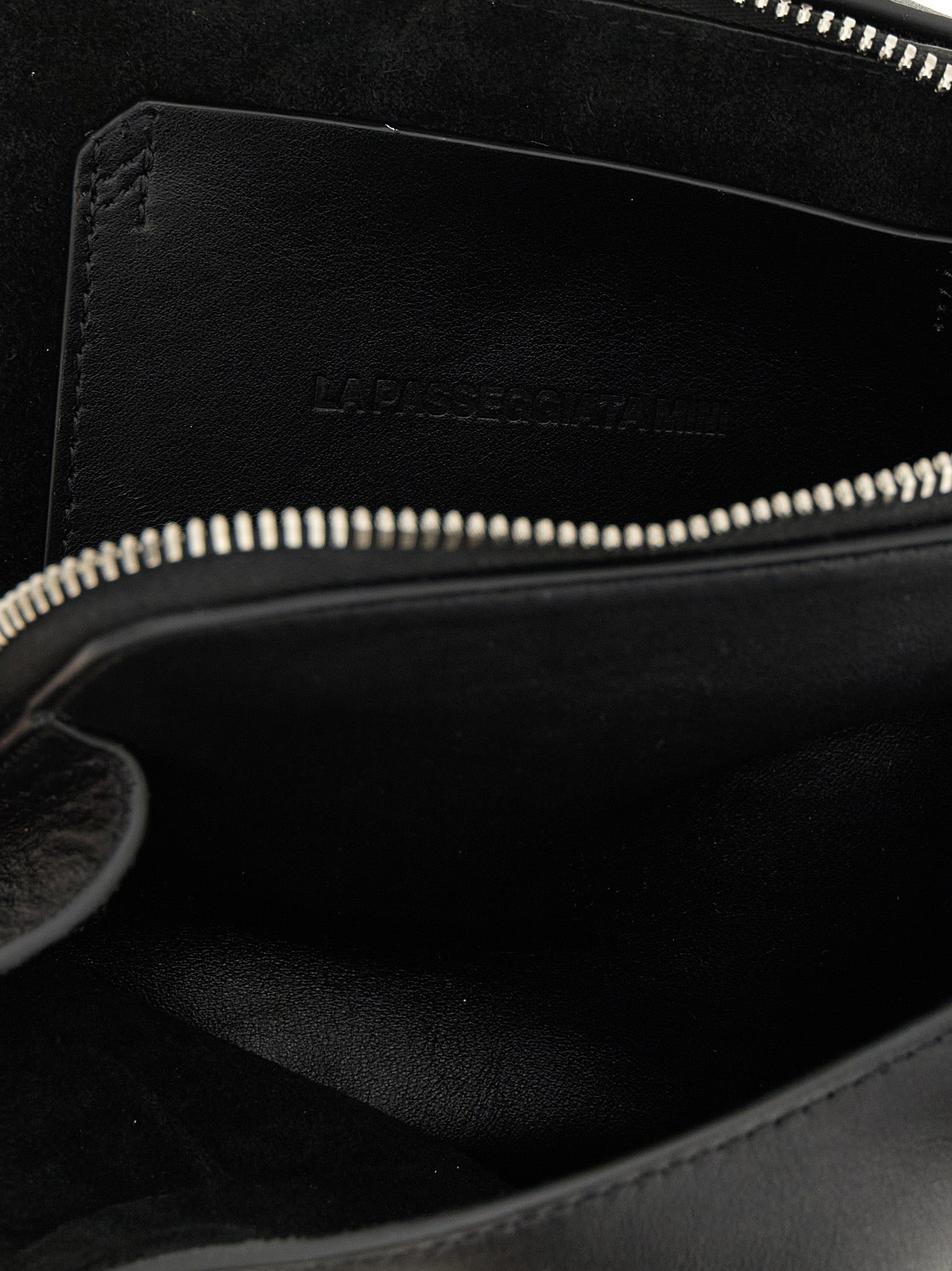 Borsa in pelle "La Passeggiata Mini" con logo in rilievo anteriore, doppia maniglia fissa, chiusura a zip superiore, tasche laterali, base rigida con piedi in metallo, tracolla rimovibile.