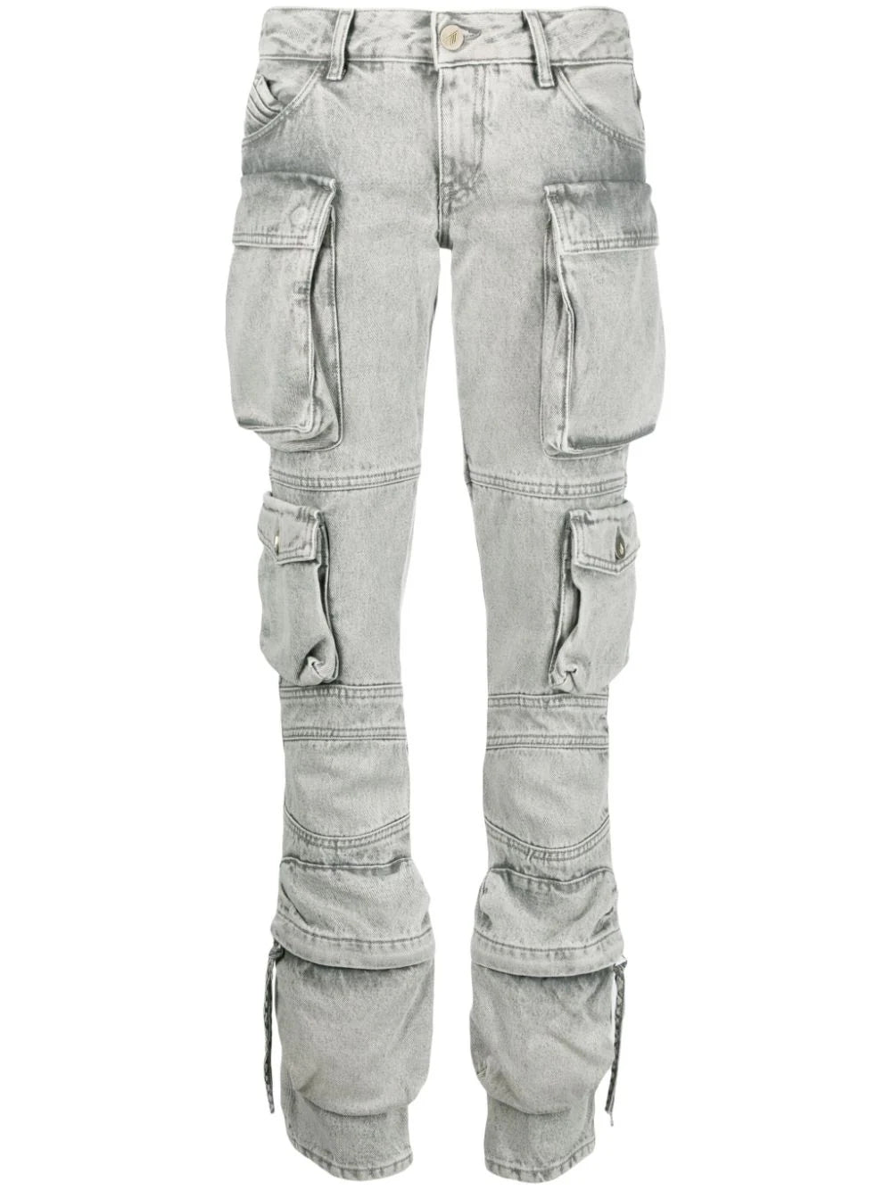 Grigio chiaro, cotone, denim con effetto alleggerito, cucitura tono su tono, design per inserire, design a pieghe, pulsanti con logo in rilievo, logo ricamato sul retro, mosca zip, chiusura dei pulsanti, anelli della cinghia, basso aumento, vestibilità dritta, design dritto Classiche tasche da tasca e carico classiche.