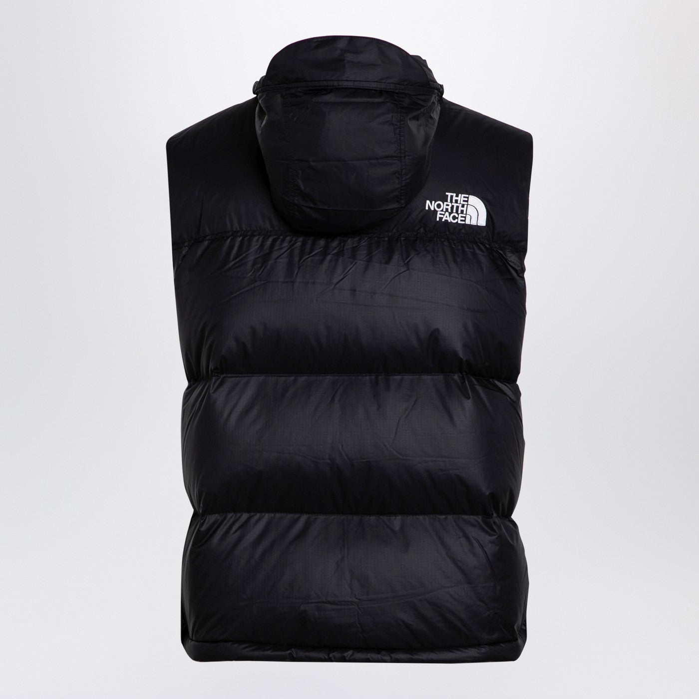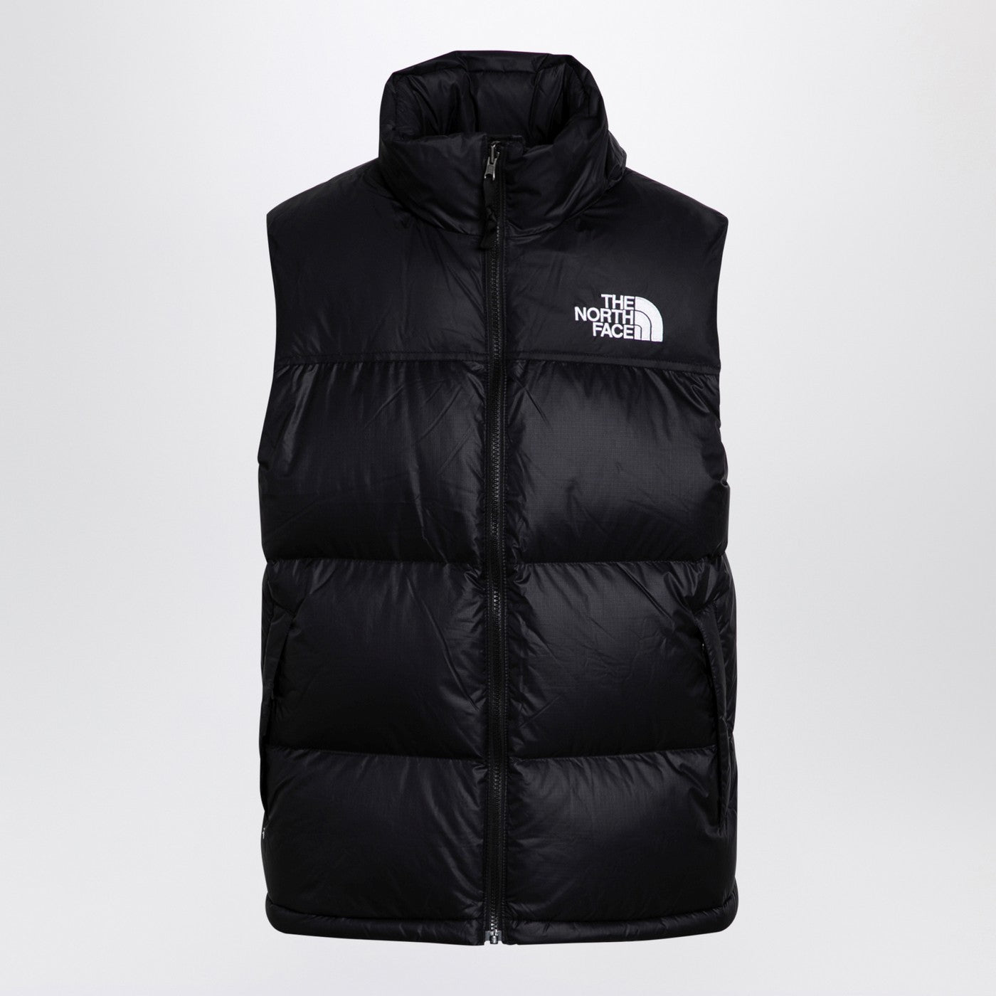 Gilet imbottito in nylon nero dalla parete nord, con un collare alto, cappuccio rimovibile, fissaggio a zip anteriore, tasche a marcia con zip a due laterali e lettere ricamate a contrasto sul petto e sulla schiena.