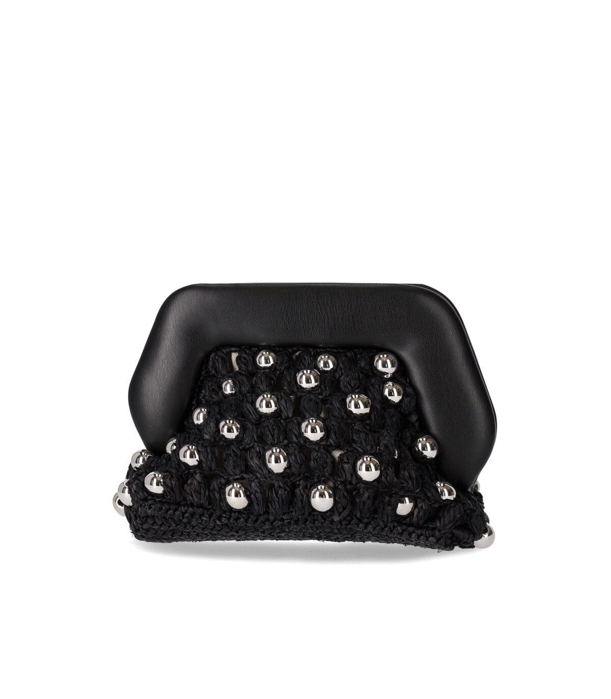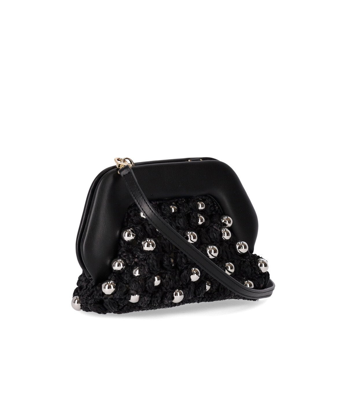 Perline di paglia di gea si stringono da temirè di pelle vegana e rafia in sfumature di nero, decorate con maxi perle in metallo argento. Interni foderati con materiali riciclati e chiusura magnetica. Trovalo regolabile e rimovibile, misura 22x15x10 cm.