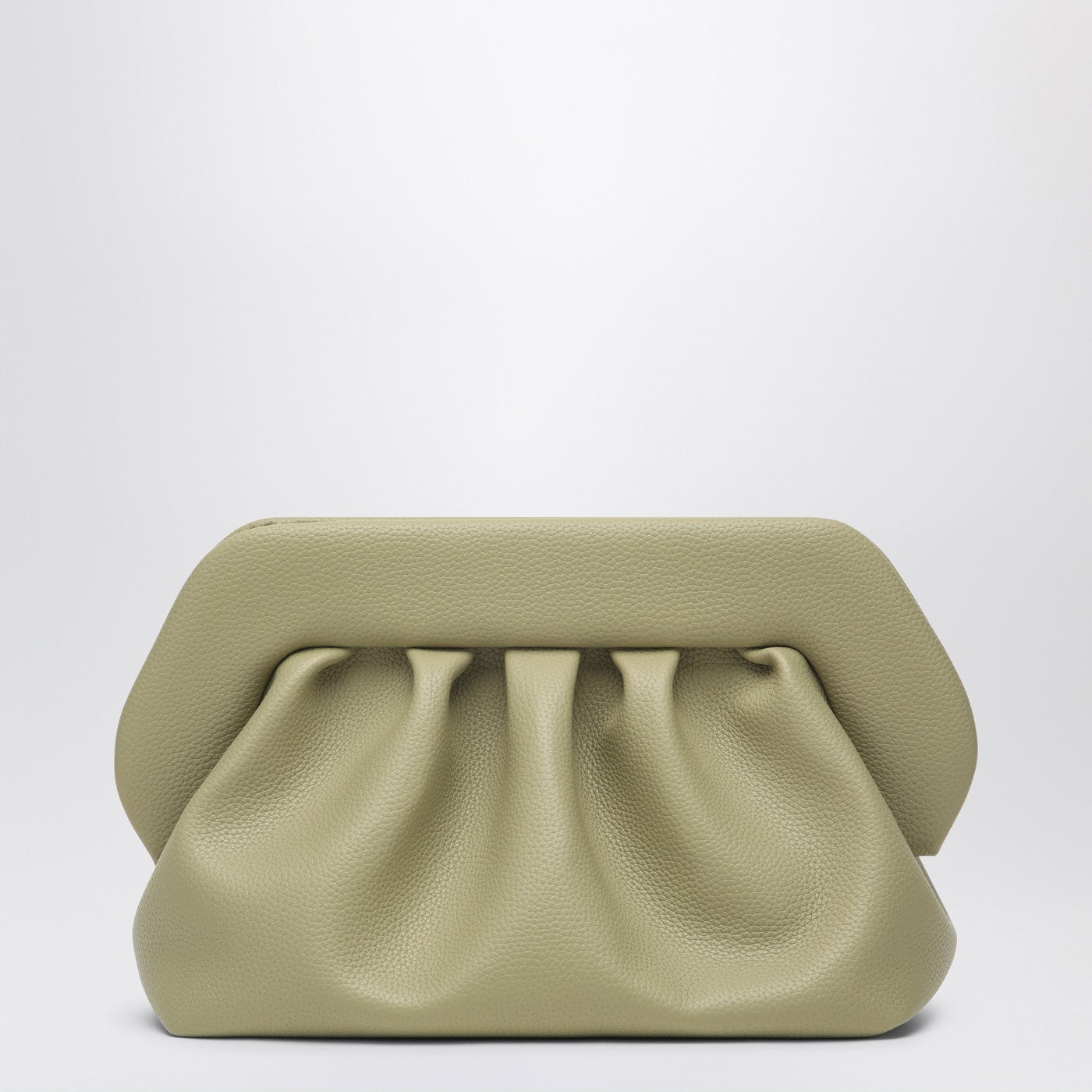 Crivpeggiatura di Themoirè in pelle vegana verde oliva, caratterizzata da doppia chiusura magnetica, increspatura decorativa, tracolla regolabile e rimovibile, fodera in tessuto e hardware in metallo color oro.