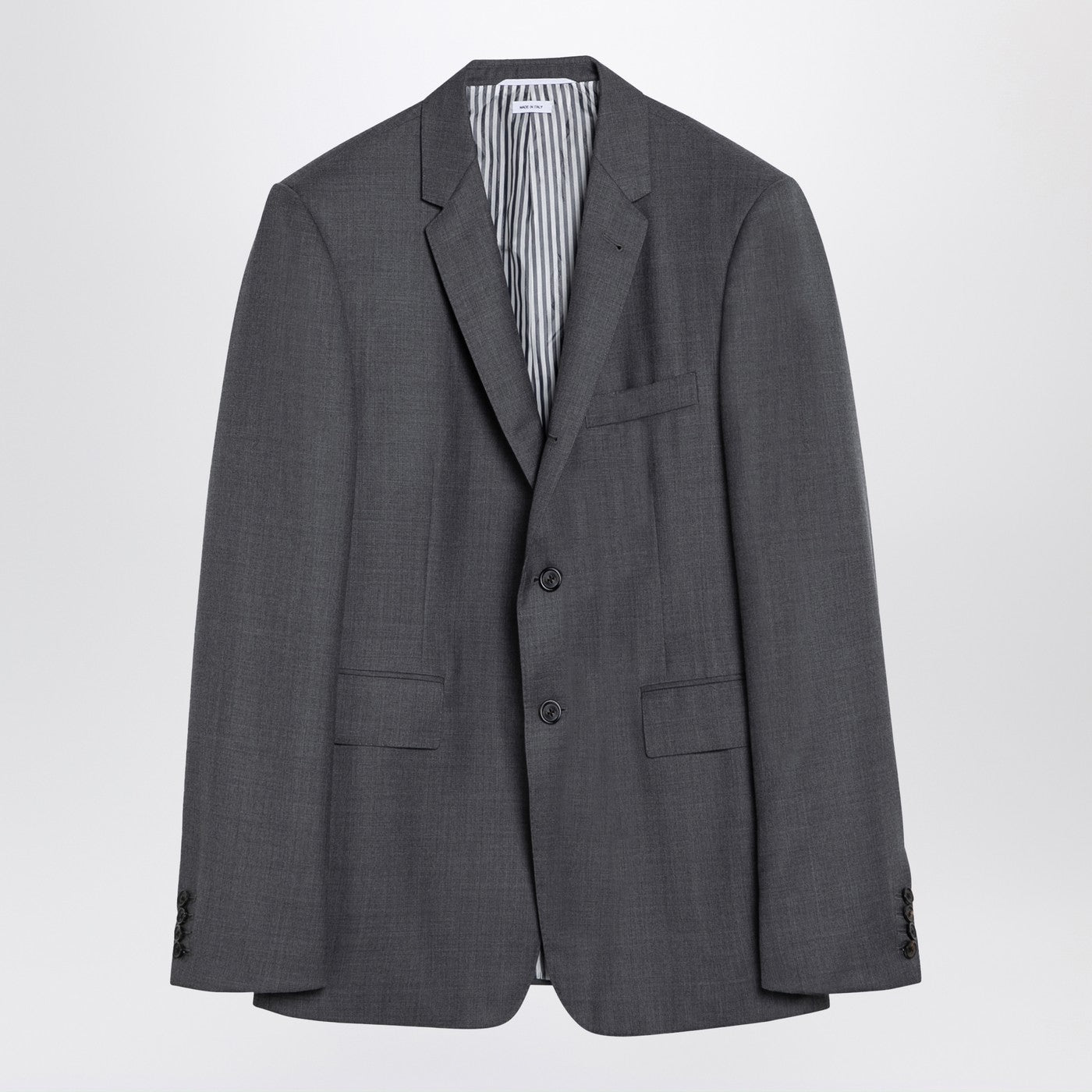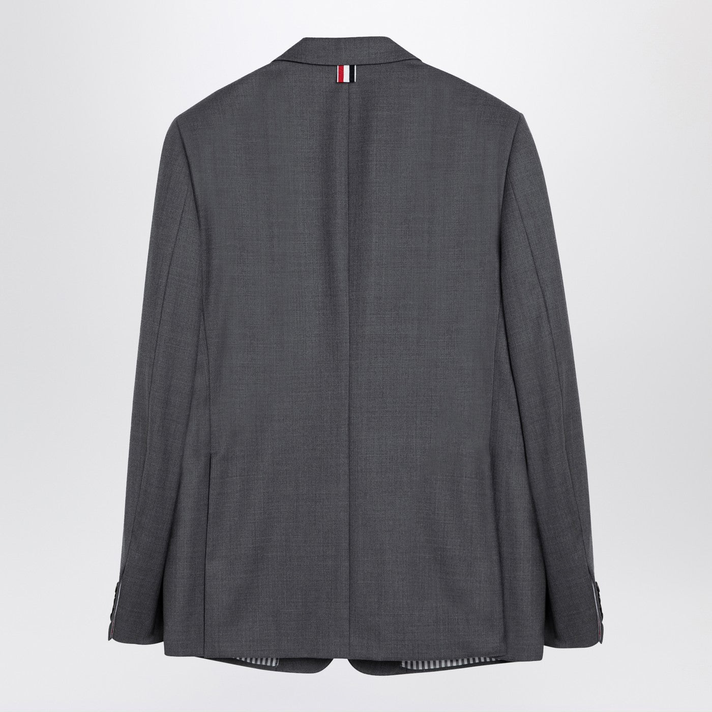 Giacca a petto singolo di lana grigia di Thom Browne con risvolti classici, maniche lunghe con polsini abbottonati, pianta anteriore a bottone, due tasche a flap sulla parte anteriore, una tasca a goccia sul petto, un dettaglio tricolore e una doppia sfiato sul retro.
