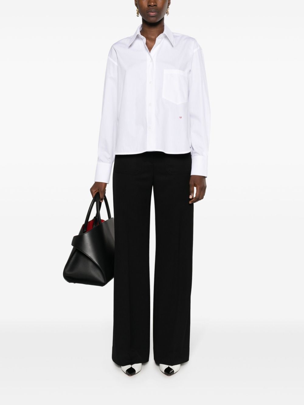 white organic cotton poplin texture embroidered logo to the front pleat detailing classic collar front button fastening long sleeves buttoned cuffs chest patch pocket curved hem cropped
