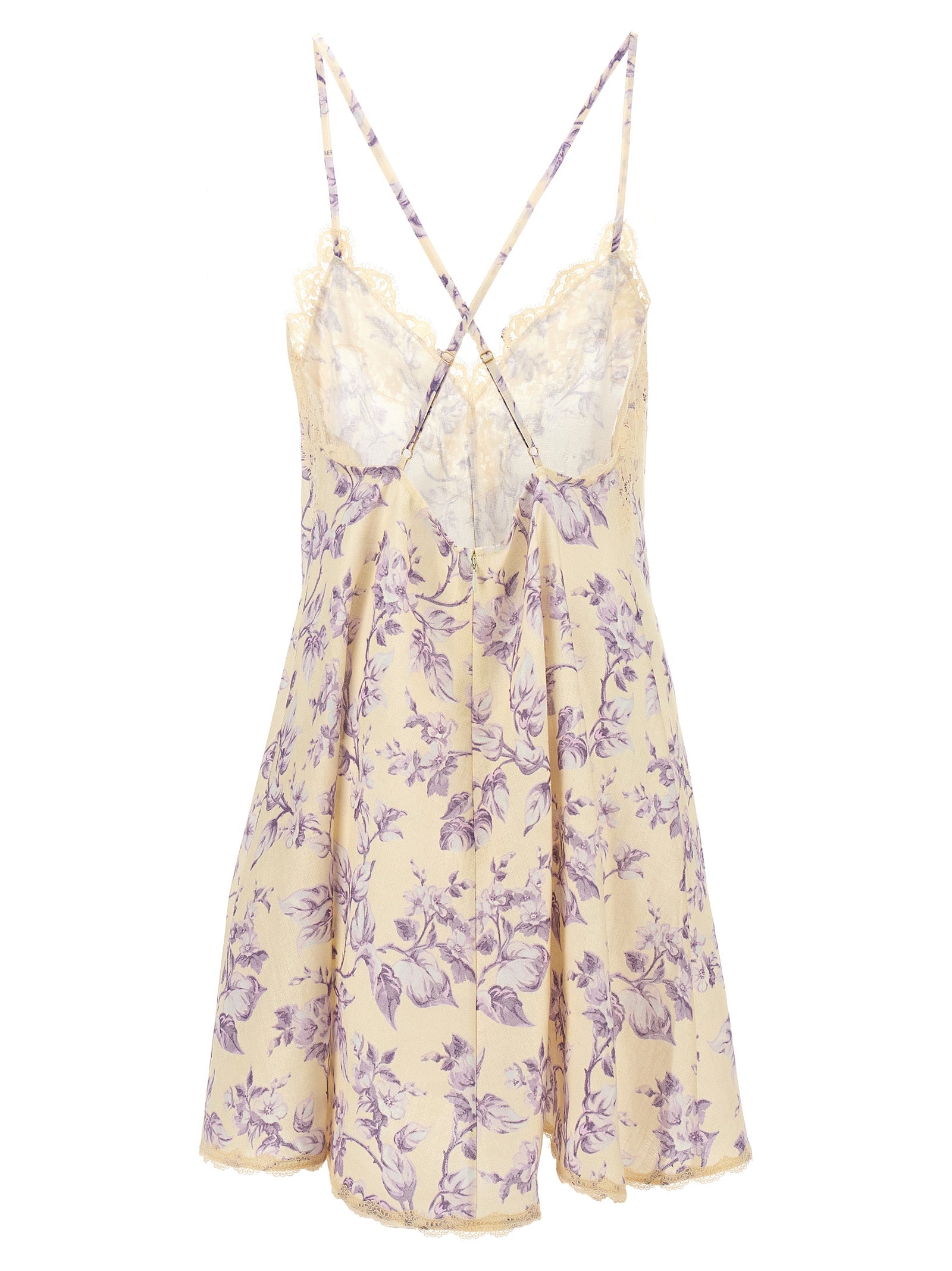 Abito di lino a stampa floreale "Halliday Swing Mini", scollo a V con inserto in pizzo, spalline sottili e regolabili incrociate sul retro.