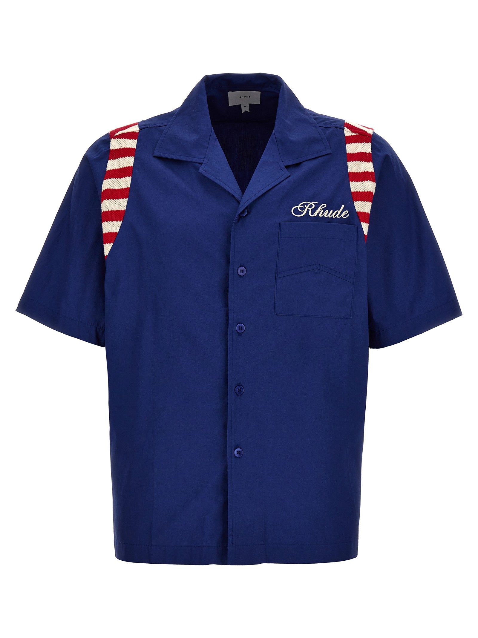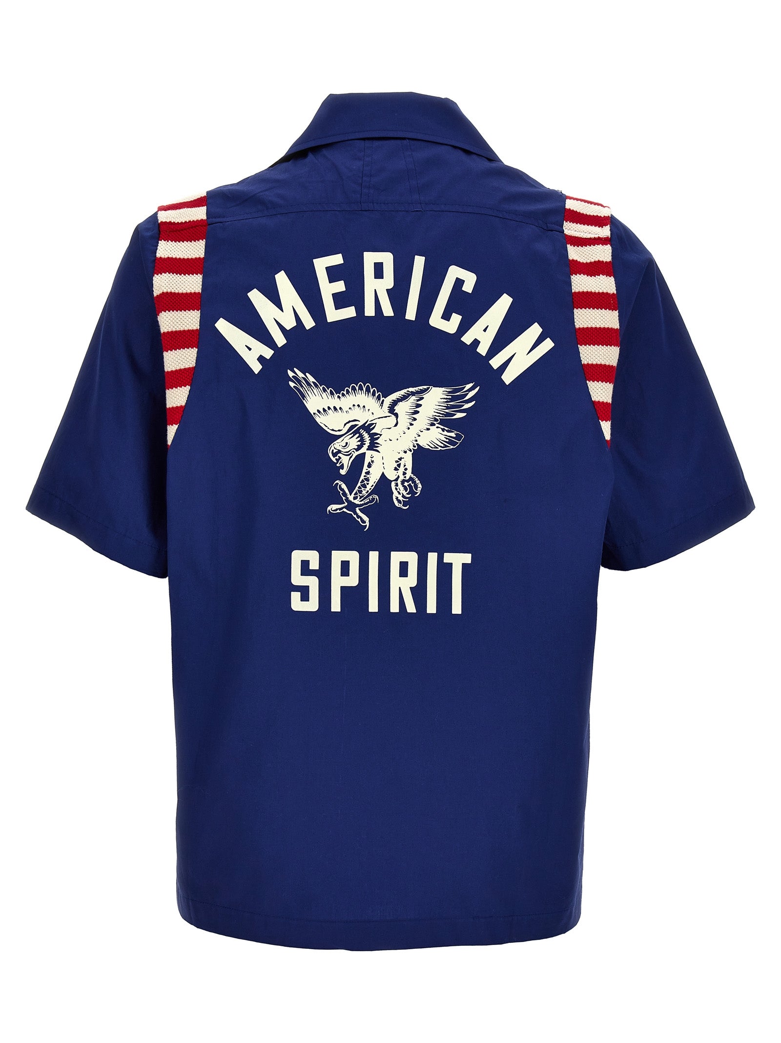 フロントロゴ刺繍、胸ポケット、コントラストニットインサート、バックプリント、ボタン閉鎖、半袖を備えた「アメリカンスピリット」コットンシャツ。