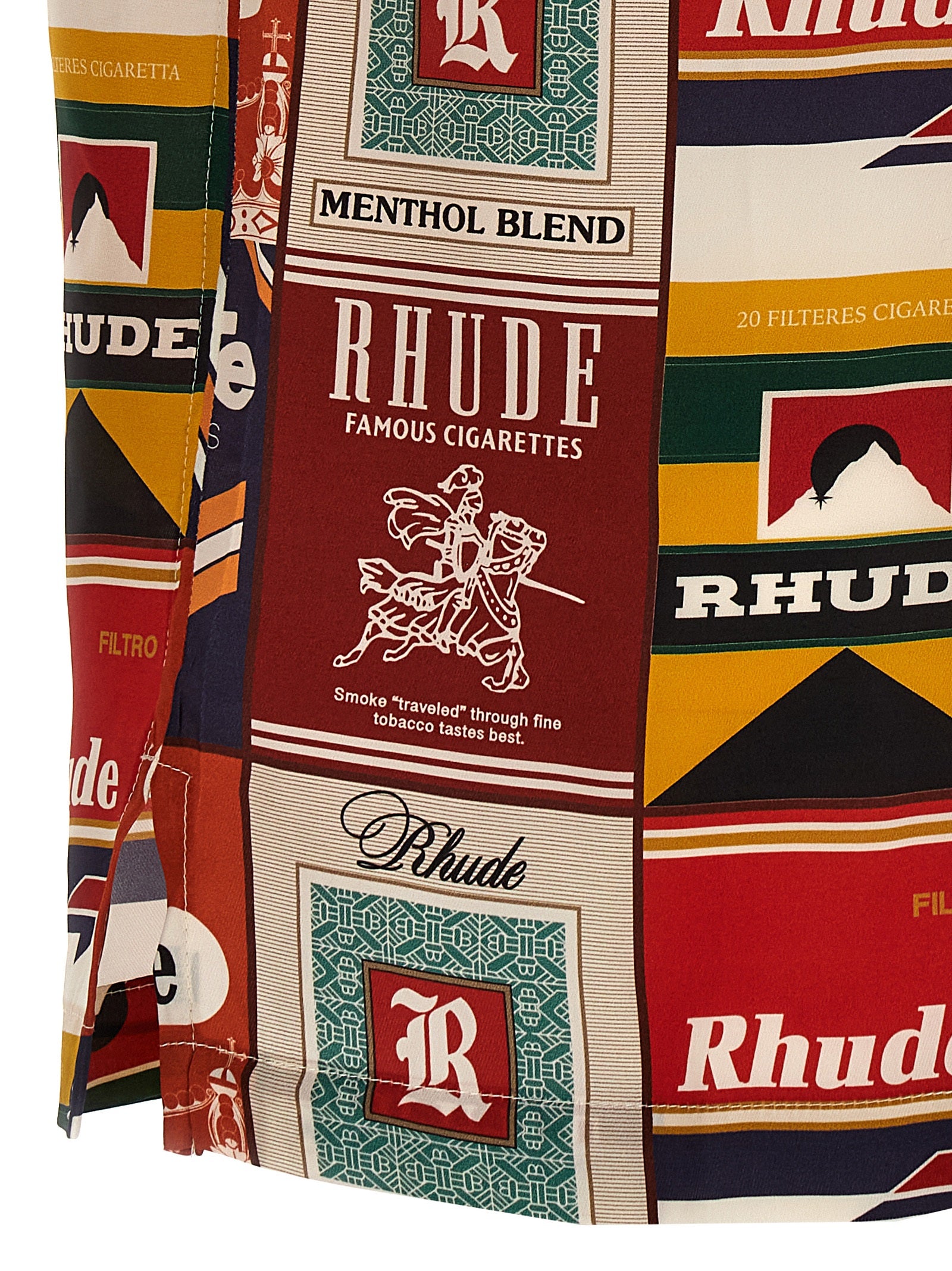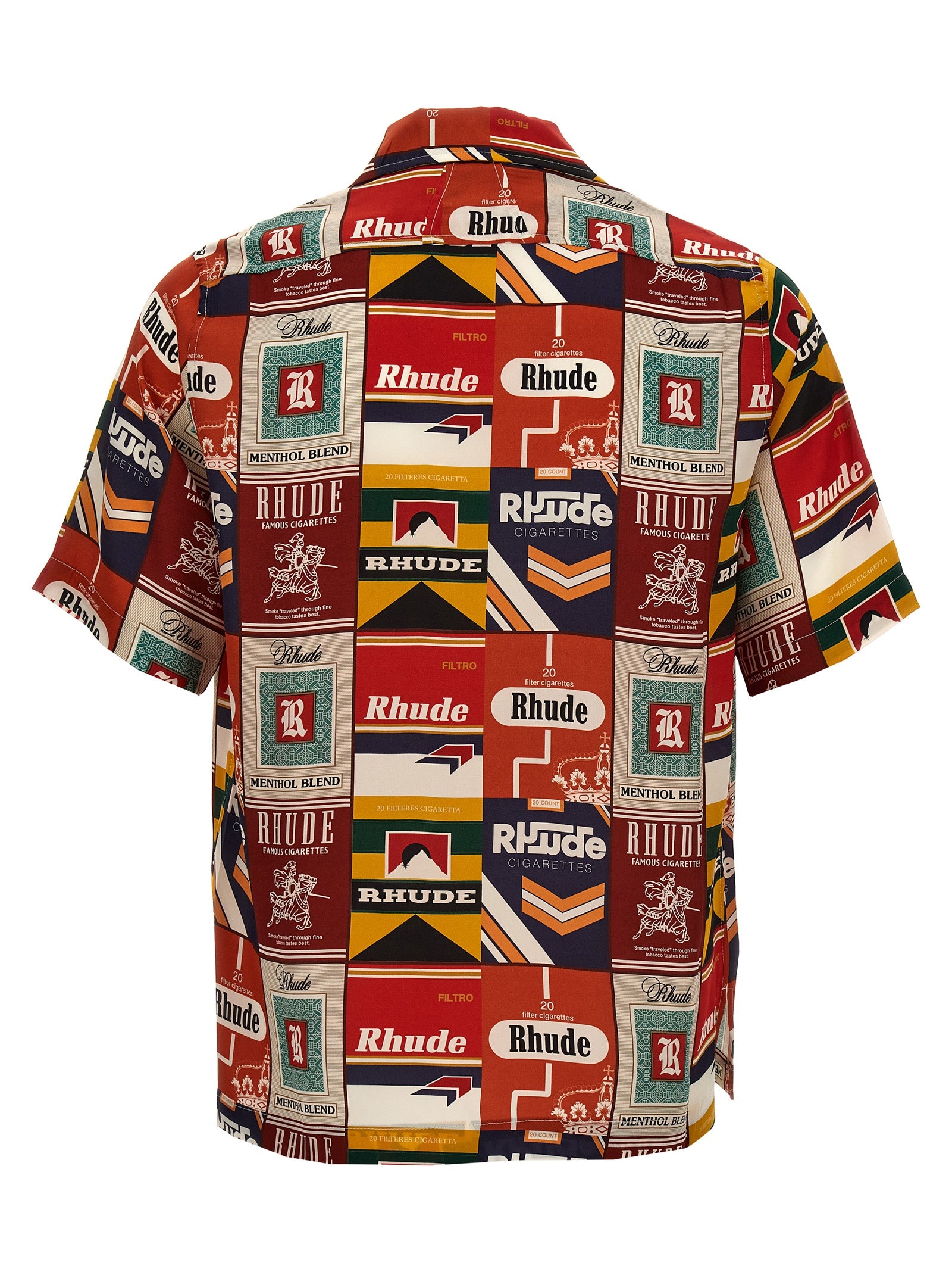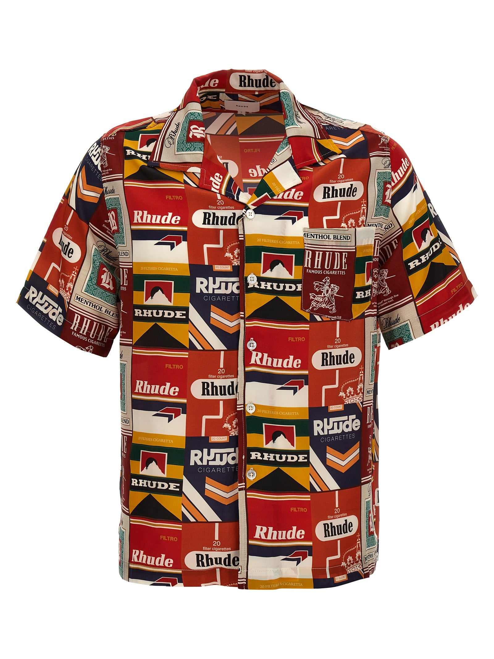 「タバコ」シルクシャツは、全面印刷、フロントポケット、ボタン閉鎖、半袖を備えています。