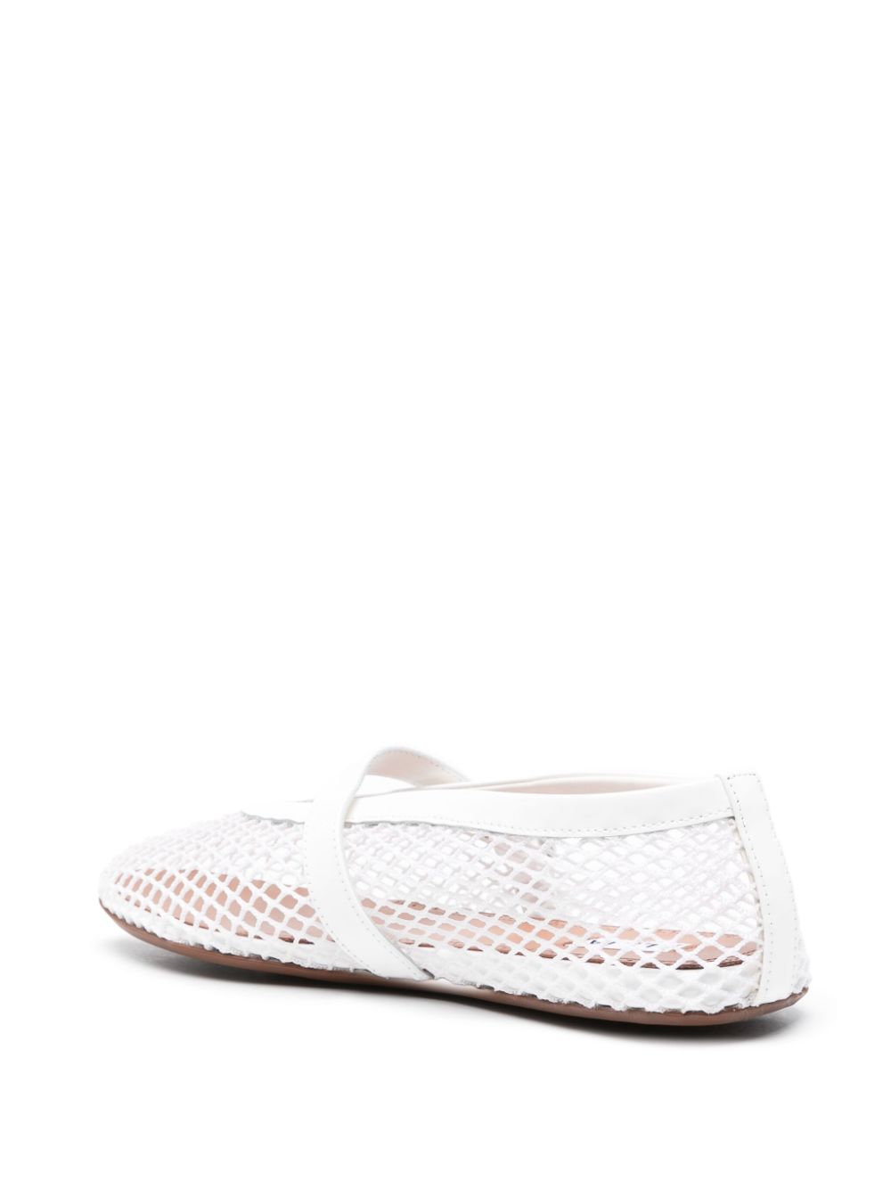 ホワイトオープンニットフィッシュネットデザインセミシャーコンストラクションラウンドトーパテントレザートリムブランドレザーインソールフラットラバー靴底銀トーンハードウェアバックルストラップ固定