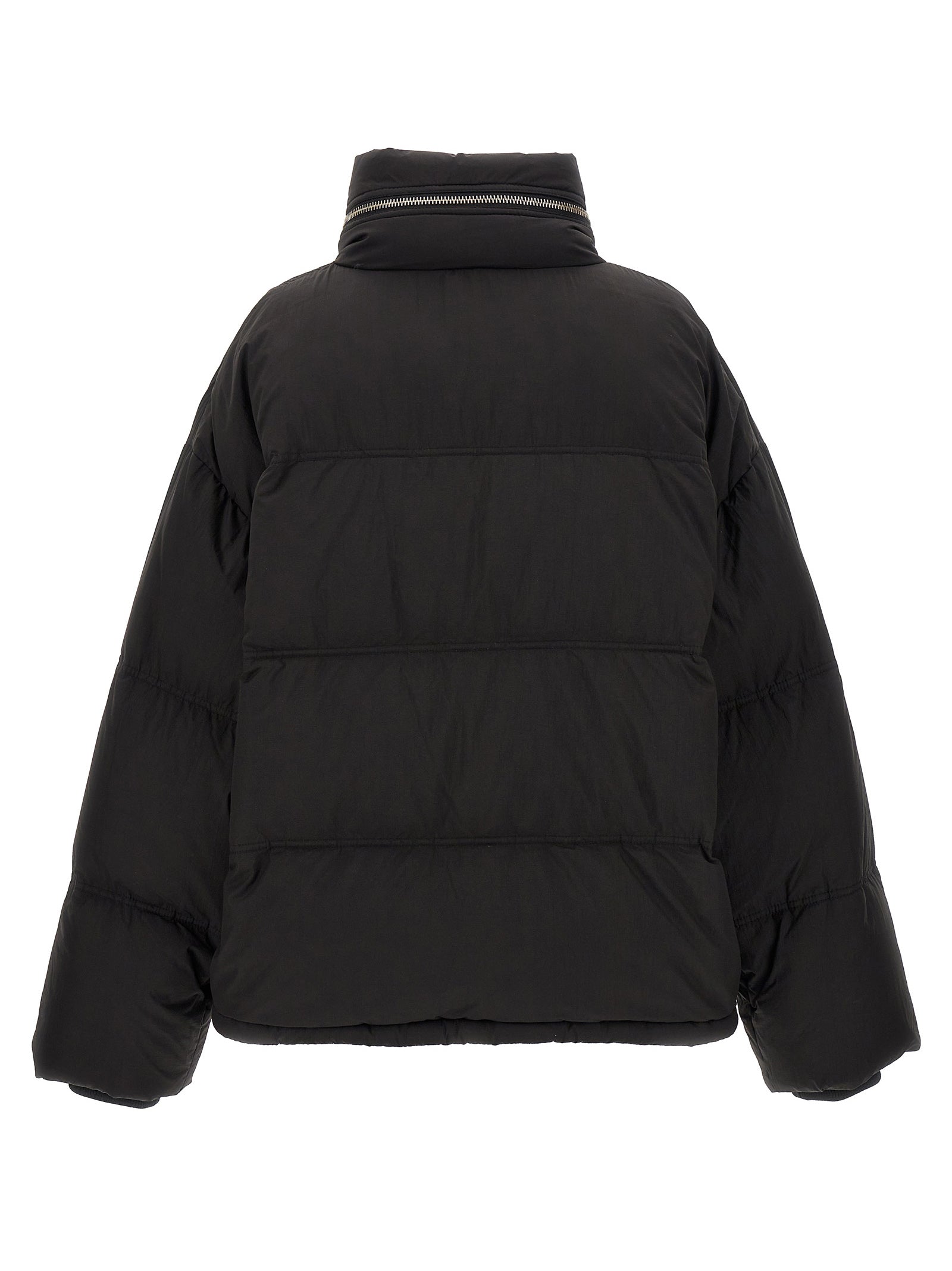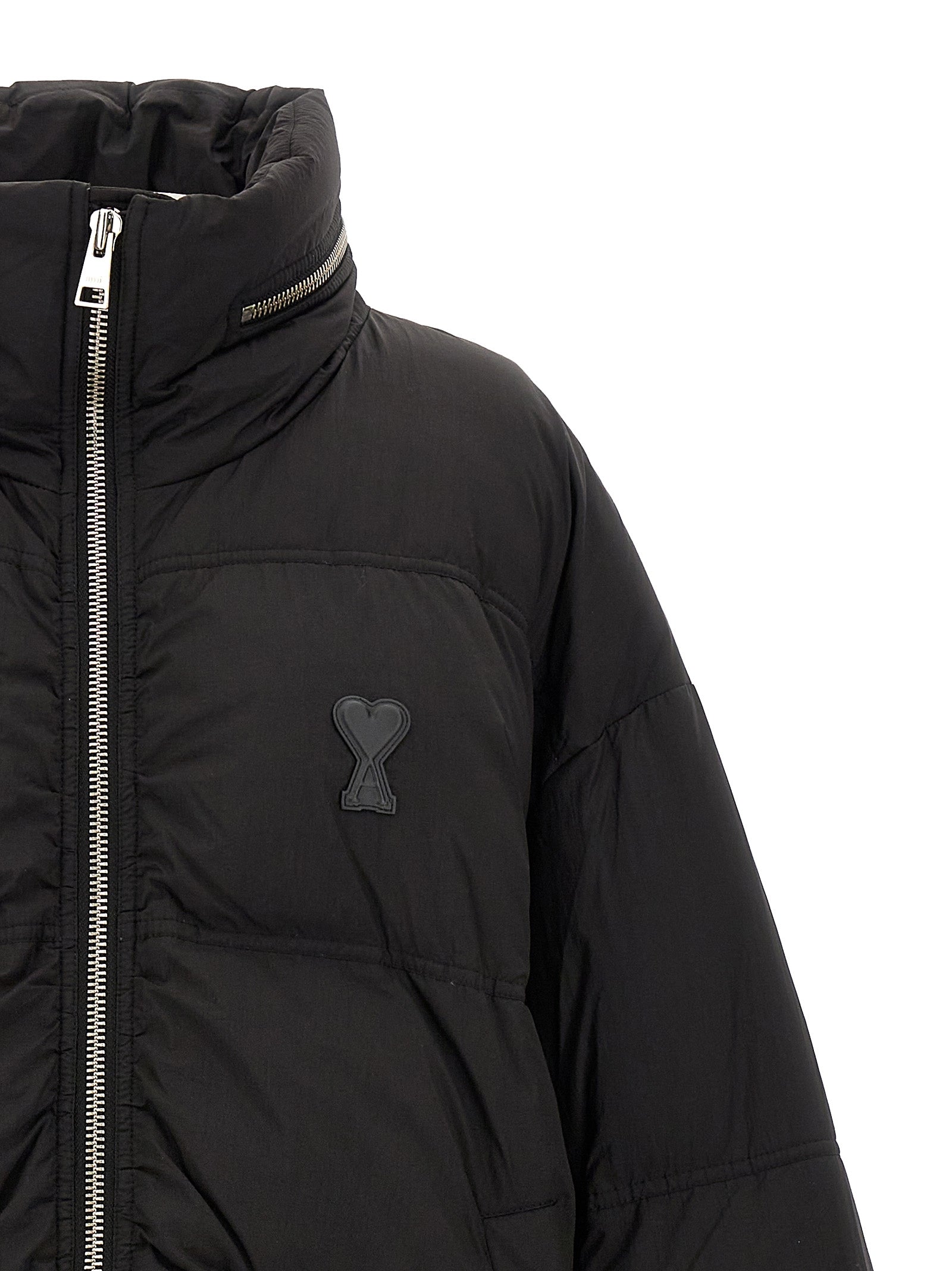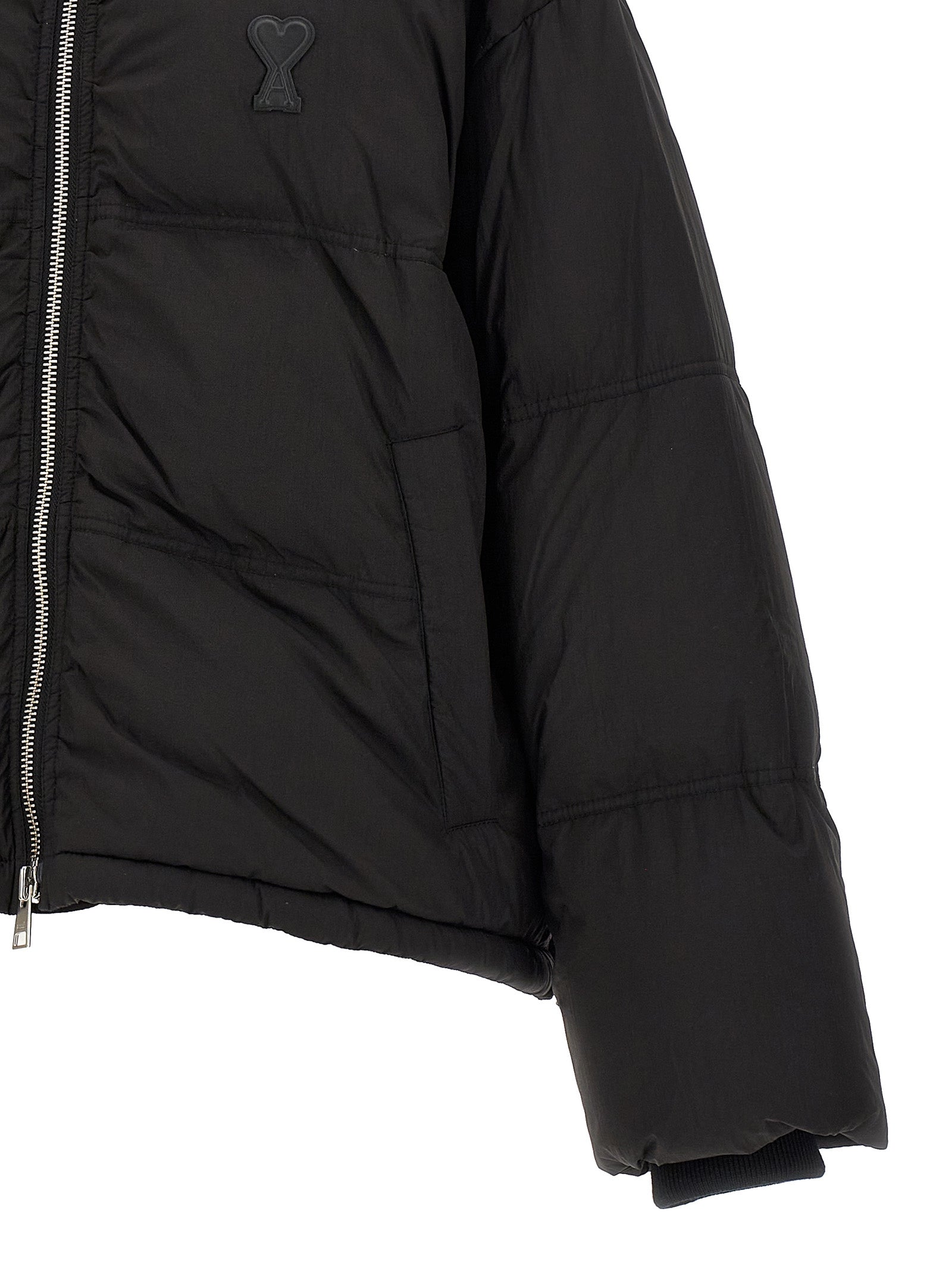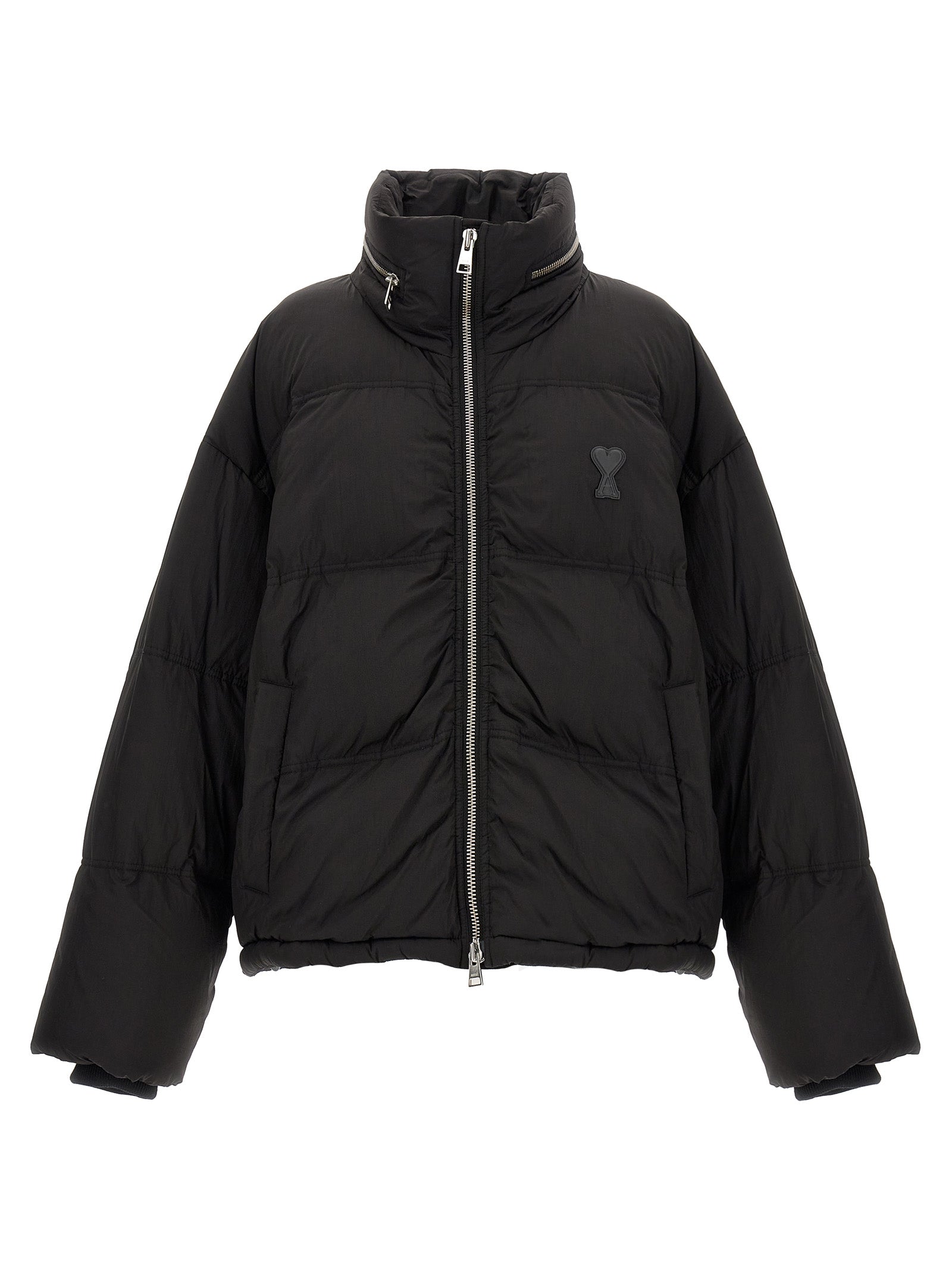 'Ami de Coeur' Nylon Down Jacket、Zip Closure、Pockets、Removable Hoodのあるスタンディングカラー、ニットカフのある長袖、裾の調整可能なドローストリング、前面の革のロゴパッチ。