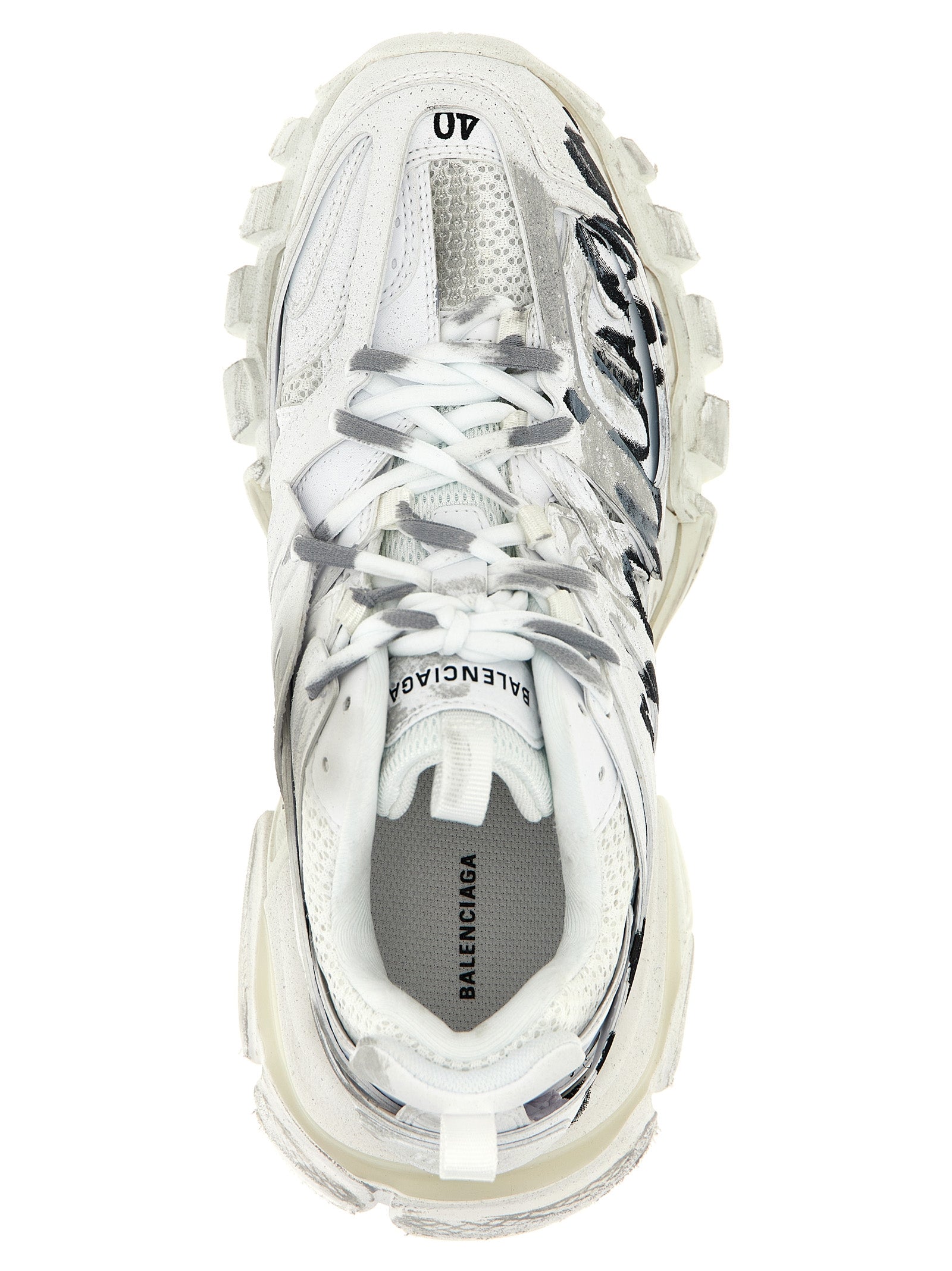 「トラック」サイドロゴの印刷と塗装効果の詳細、レースアップクロージャー、ゴムの靴底を備えたマルチマテリアルスニーカー。