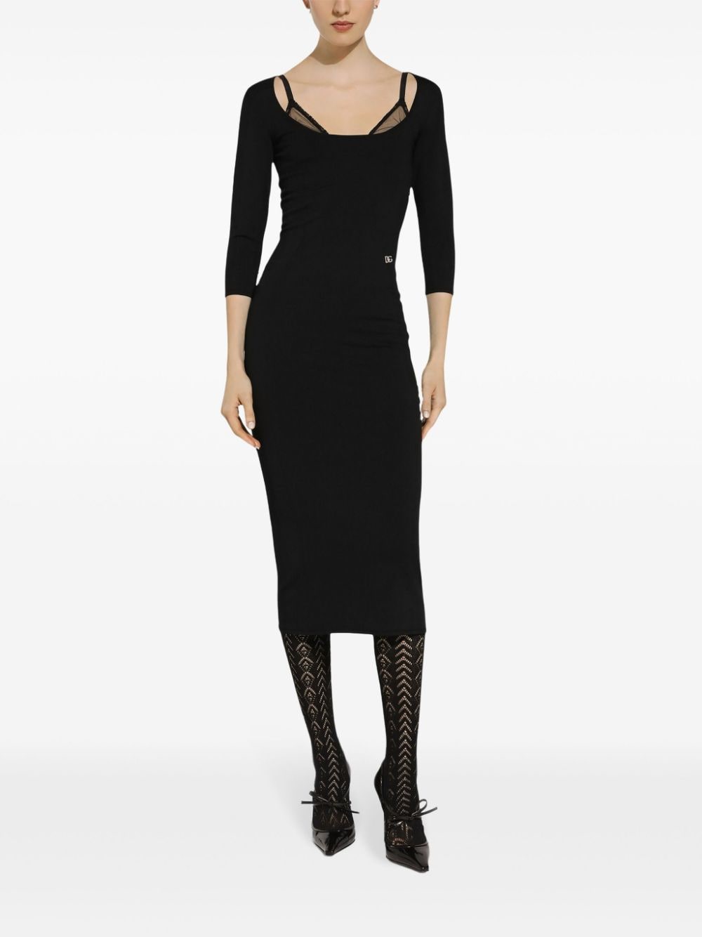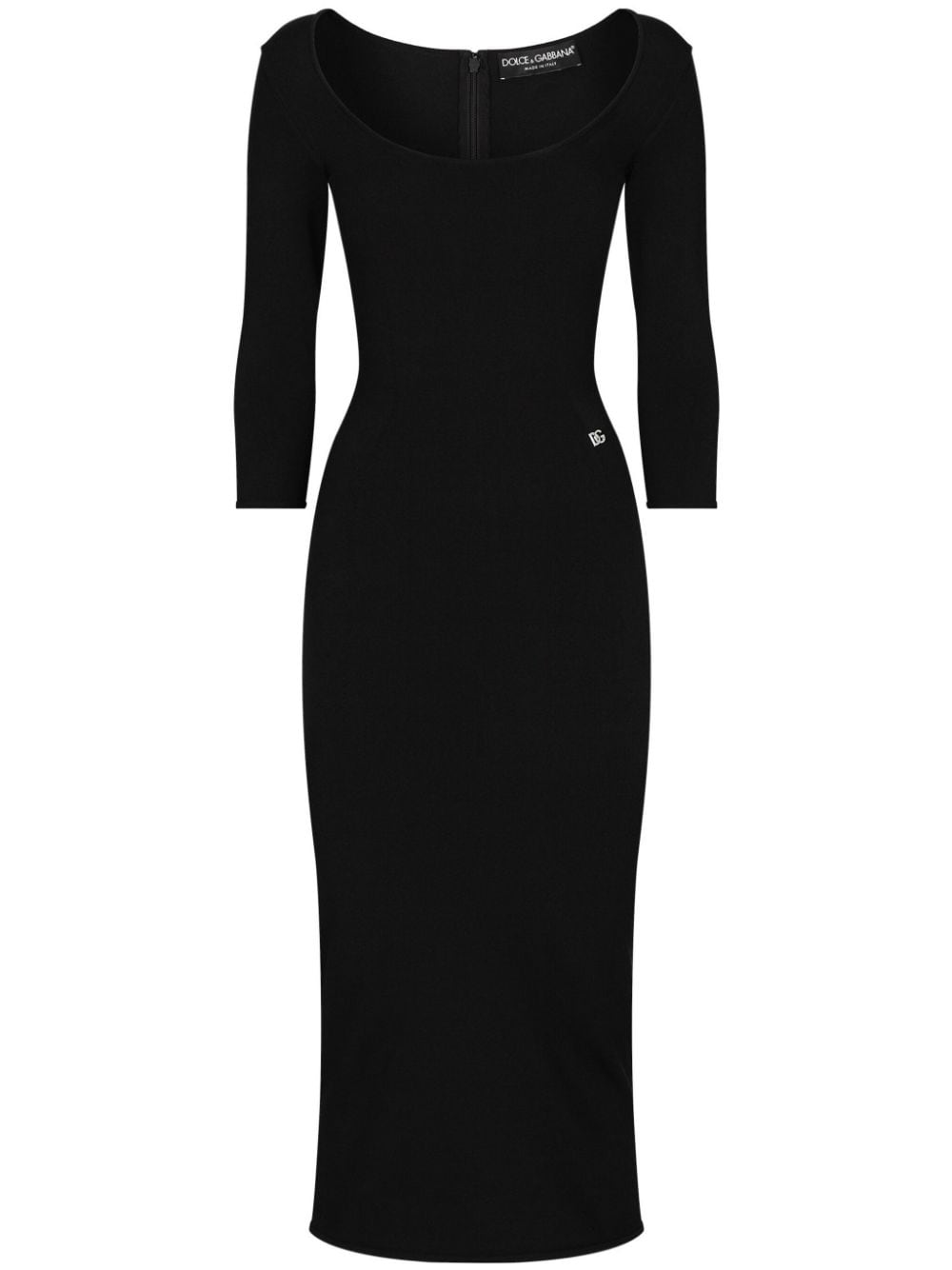 ヒップスクープネックのブラックストレッチデザインロゴプラーク3分の1 4分の1スリーブリアジップファーシングフィットウエストラインペンシルスカートミッドレングスストレートヘム