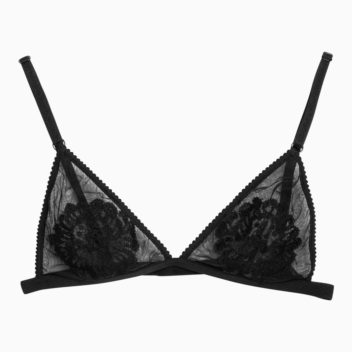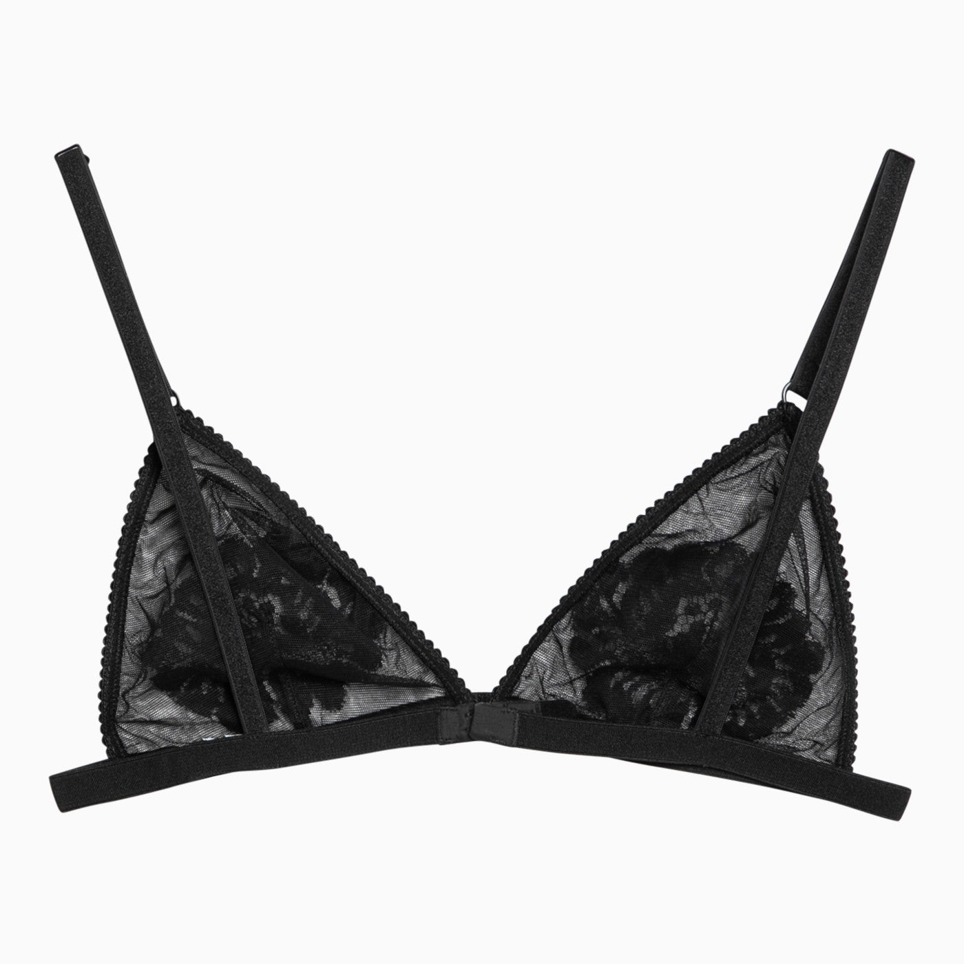 Dolce&GabbanaのBlack Tulle Triangle Bra。半透明なデザイン、レースインサート、調整可能な弾性ストラップ、調整可能なフックを使用した背面留め具を特徴としています。