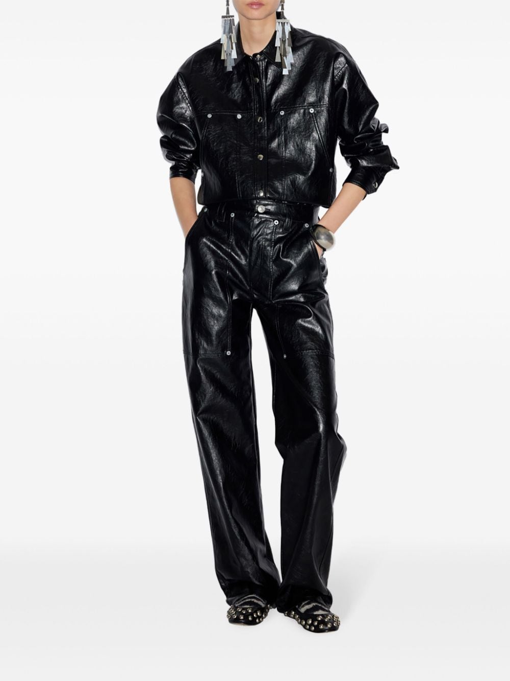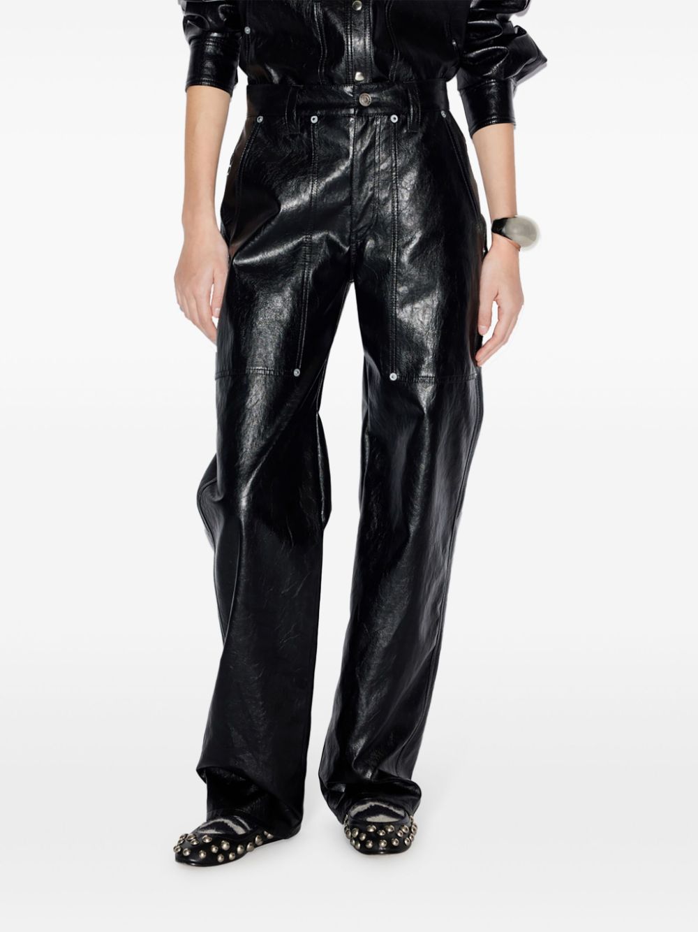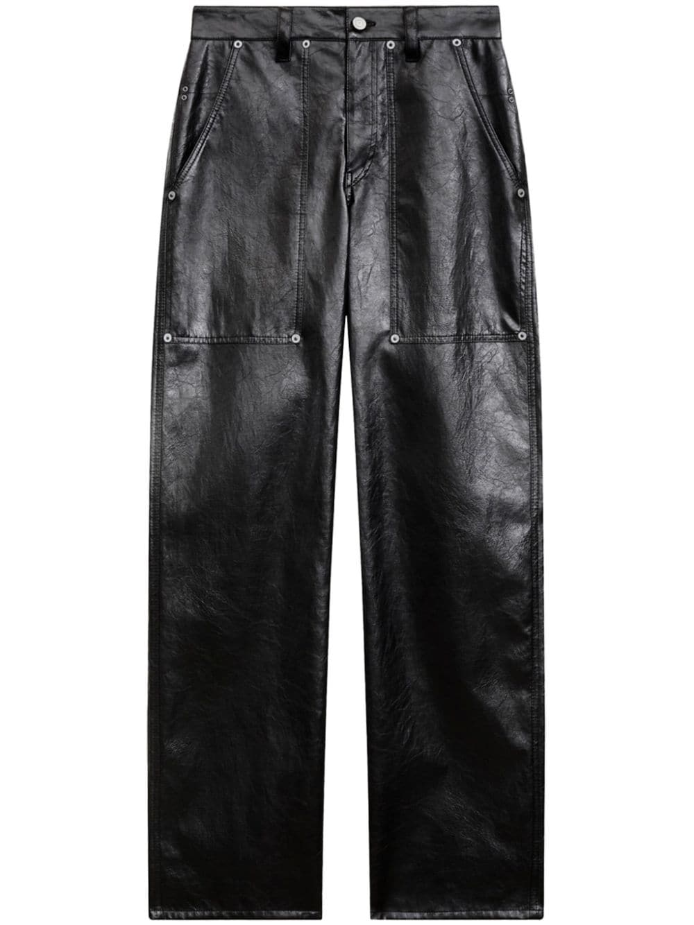 black faux leather silver-tone hardware eyelet detailing belt loops straight leg concealed fly and button fastening two side slit pockets two rear patch pockets