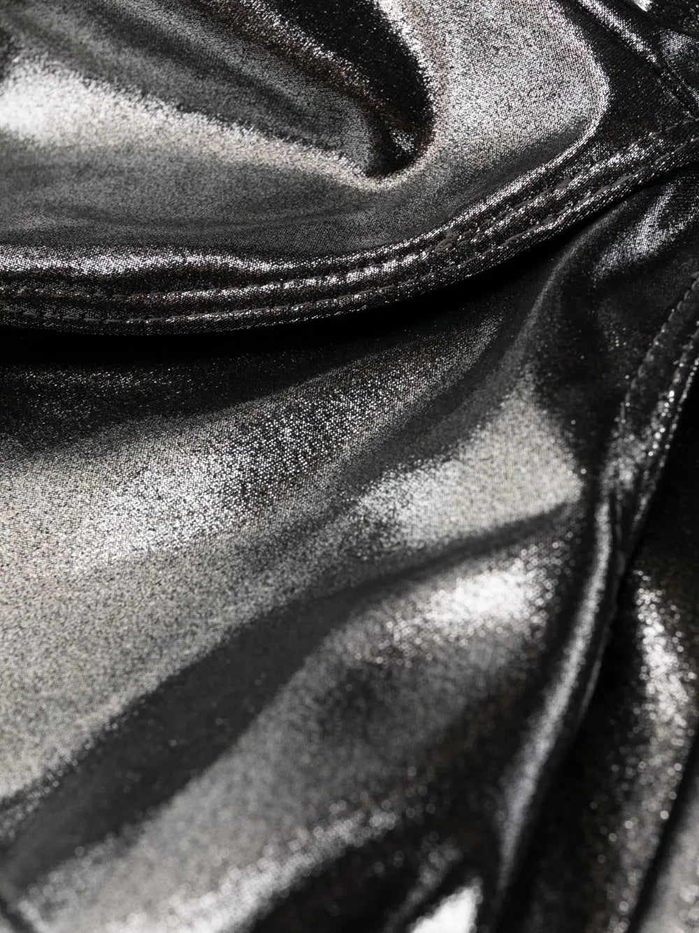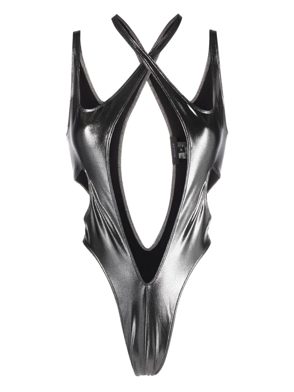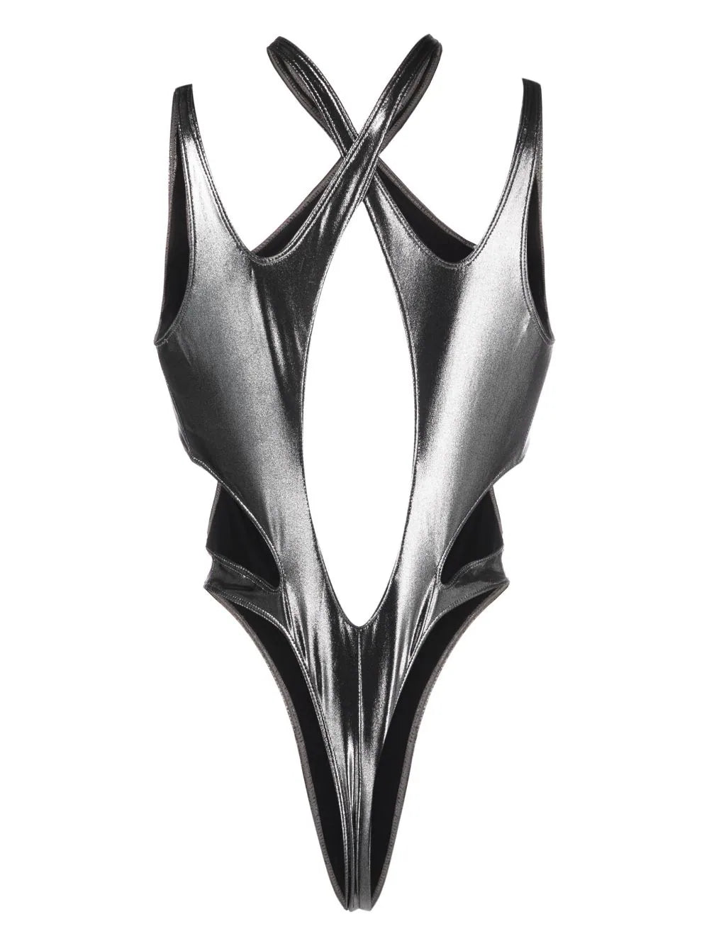 銀色、メタリック仕上げ、弾力性のあるデザイン、カットアウトのディテール、Vネック、クロスストラップ、ひもモデル。