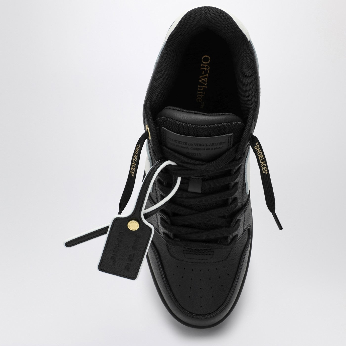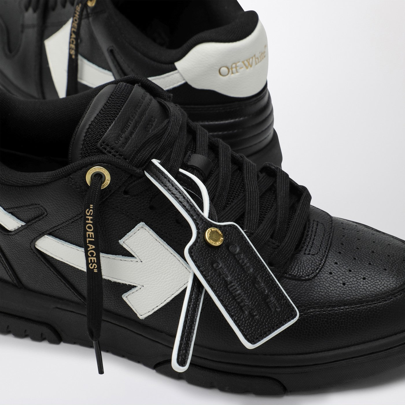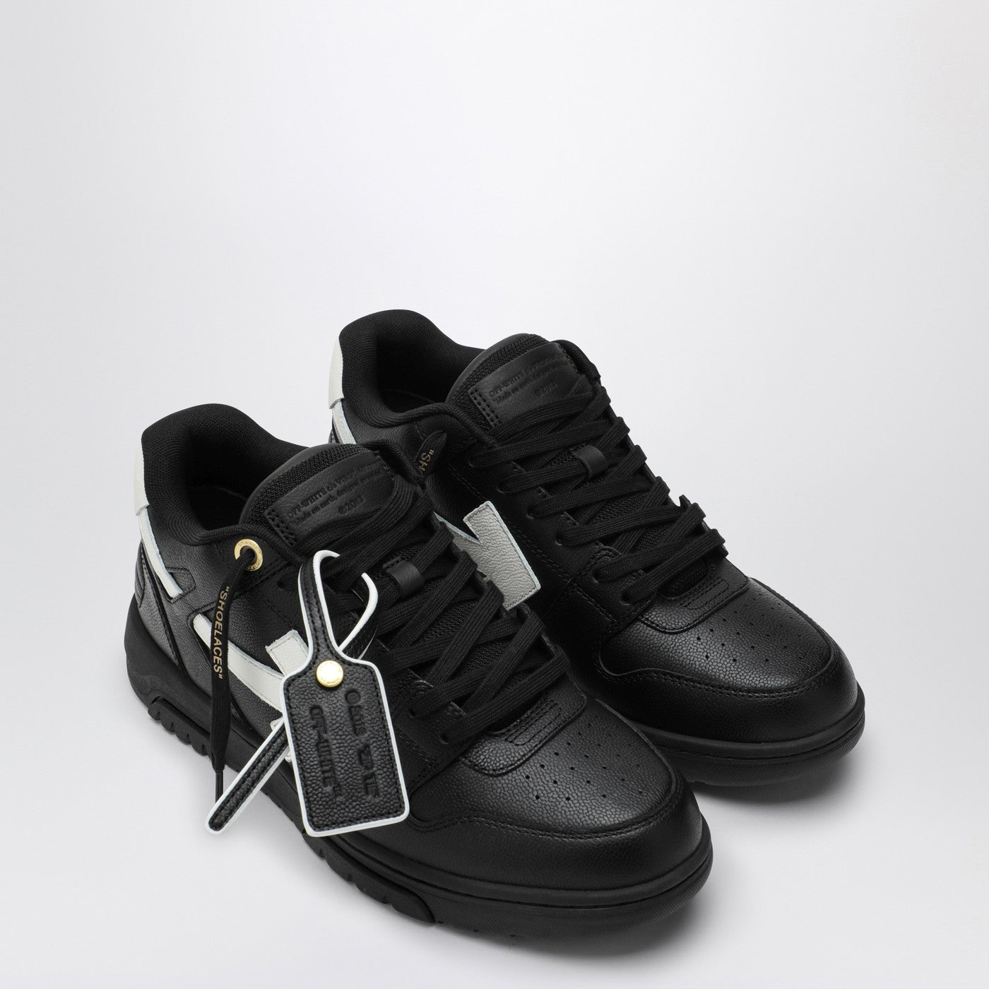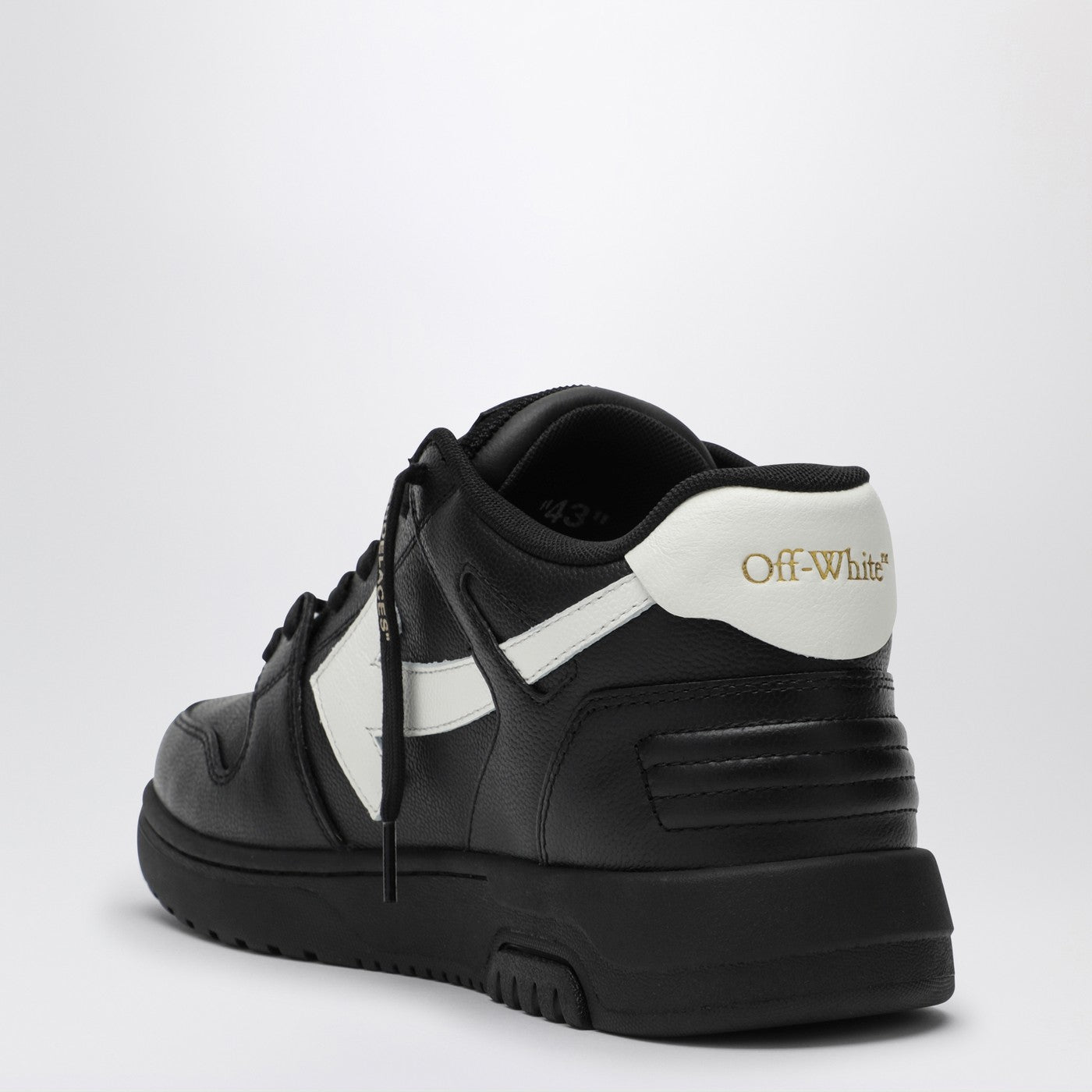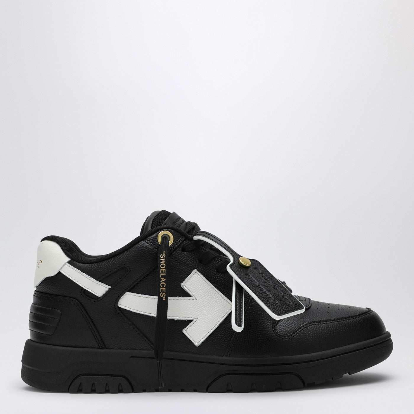 黒と白の革のアッパー、矢印モチーフ、ロゴのカウンターヒール、対照的なディテール、ロゴレタリングレース、独特のジップタイロゴプラーク、丸いつま先、平らなゴム製の靴底を備えたオフホワイトの低いスニーカー。