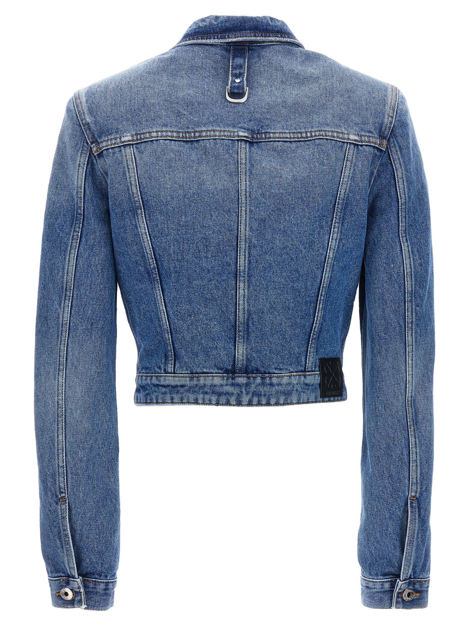 胸部ストラップのディテール、ボタン閉鎖、長いカフの袖を備えた「貨物作物」の綿のデニムジャケット。