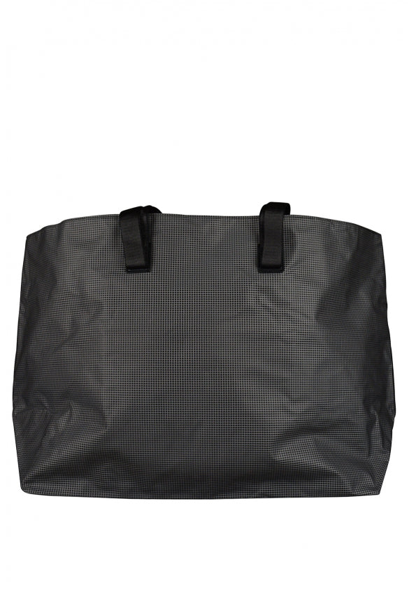 黒と白のグリッド付きのオフホワイトトートバッグ。
