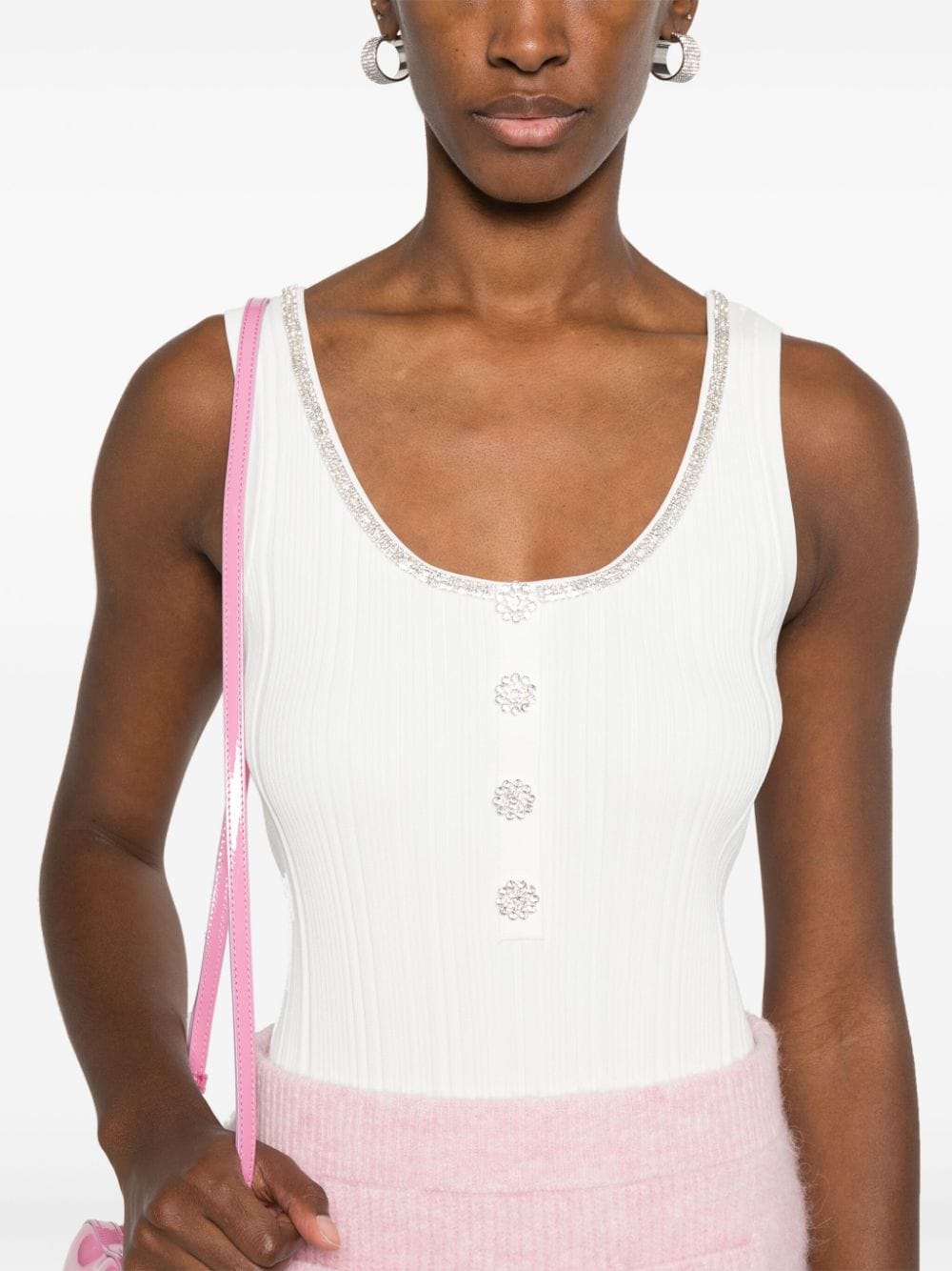 白いリブ付きニットクリスタル編集ボタンクリスタル装飾トリムスクープネックショートフロントボタン固定袖のまっすぐな裾