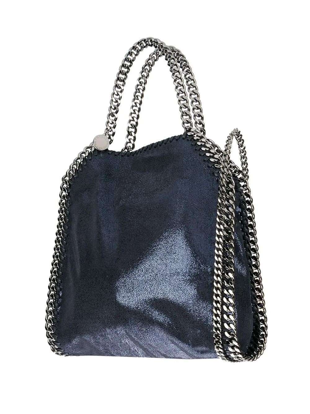 ハンドル、チェーンショルダーストラップ、スナップボタン付きのトップクロージャー、刻まれたロゴ付きのペンダント、シルバートーンで仕上げられたチェーントリムを備えたステラマッカートニーのブルーエコレザーの「ファラベラ」トートバッグ。