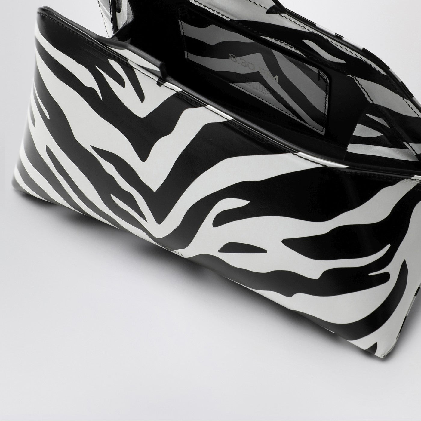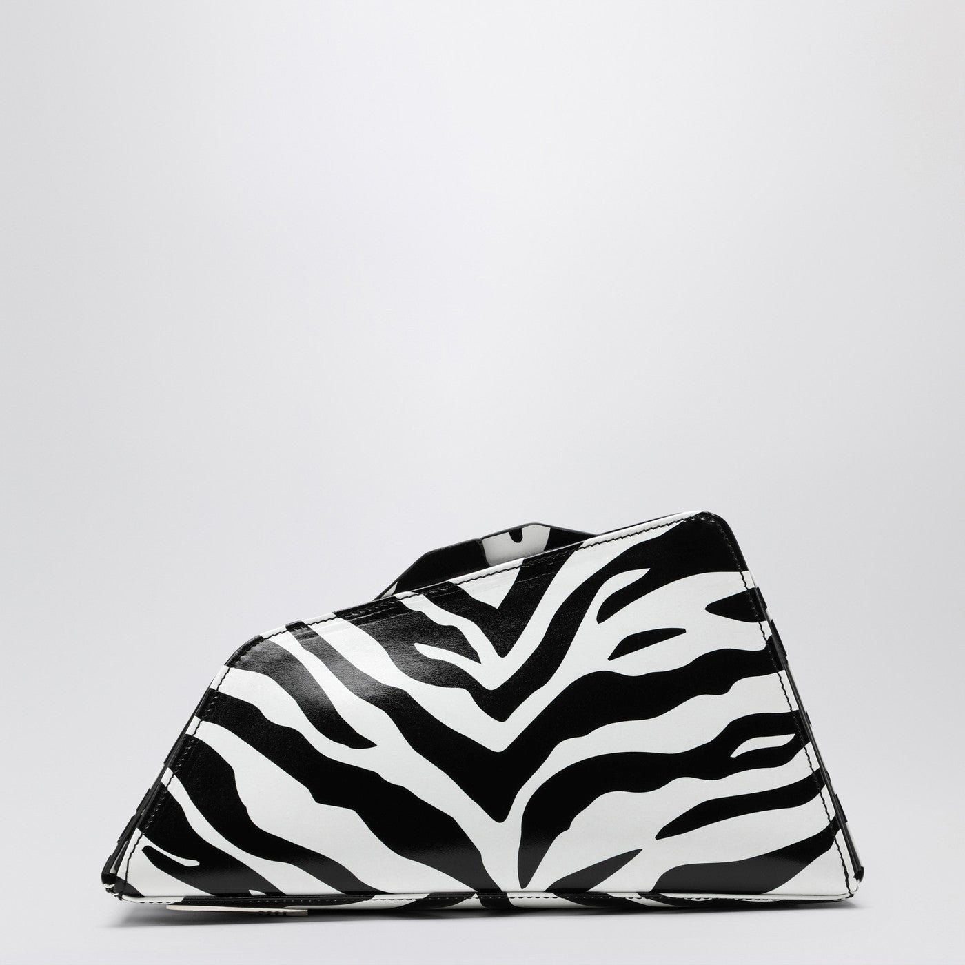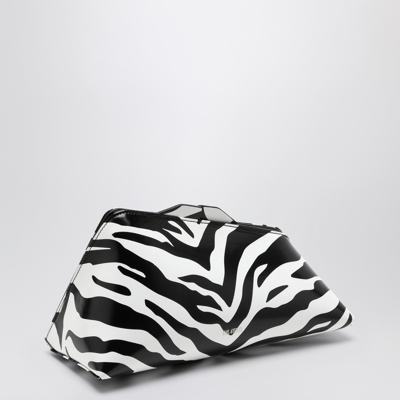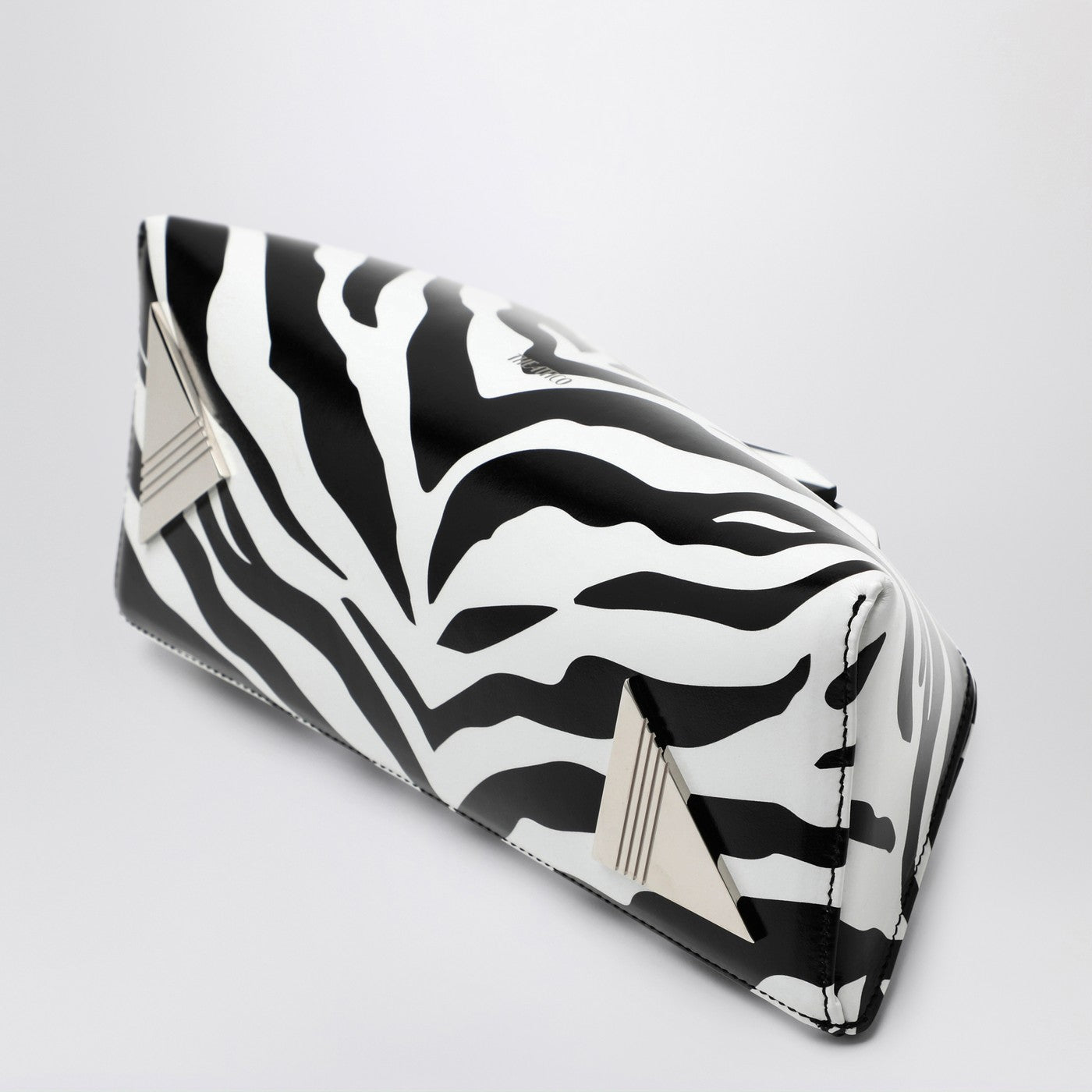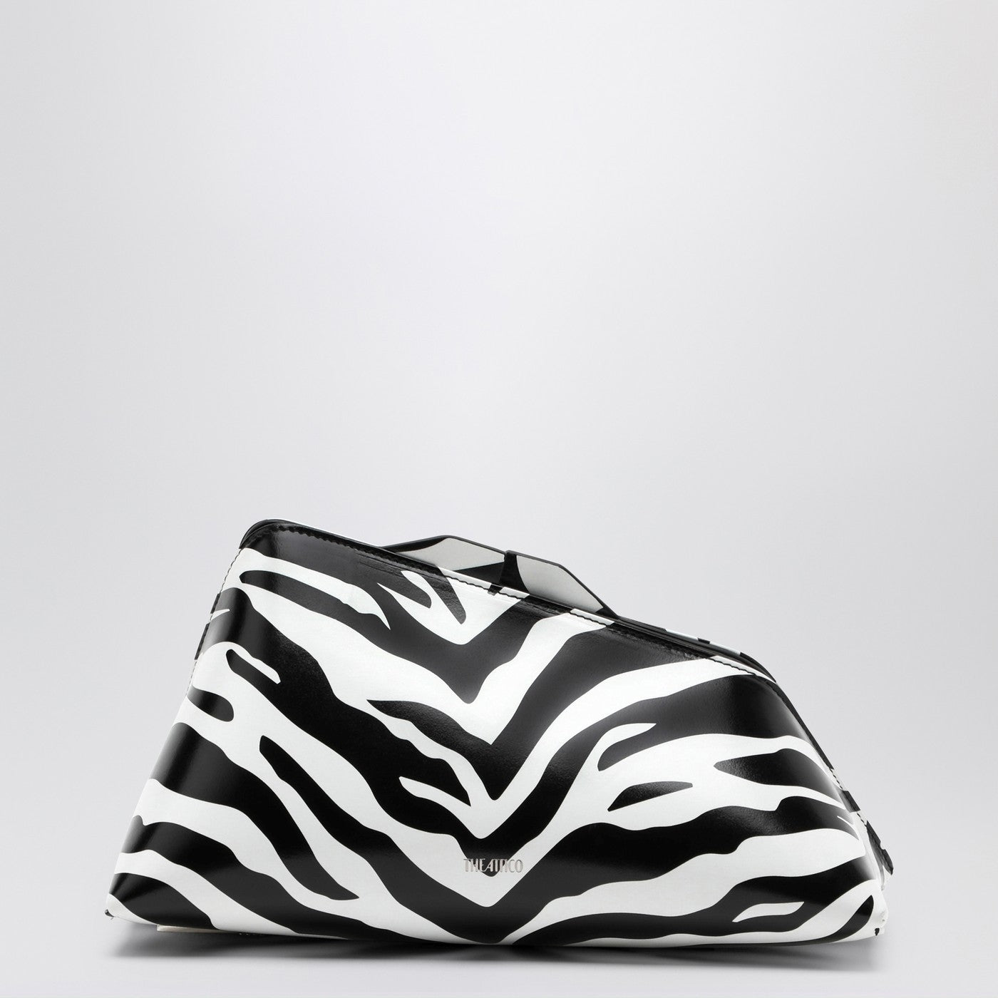磁気閉鎖、内部の平らなポケット、金属の足、前面に印刷されたロゴを特徴とするAtticoの黒と白のシマウマパターンの革のクラッチ。