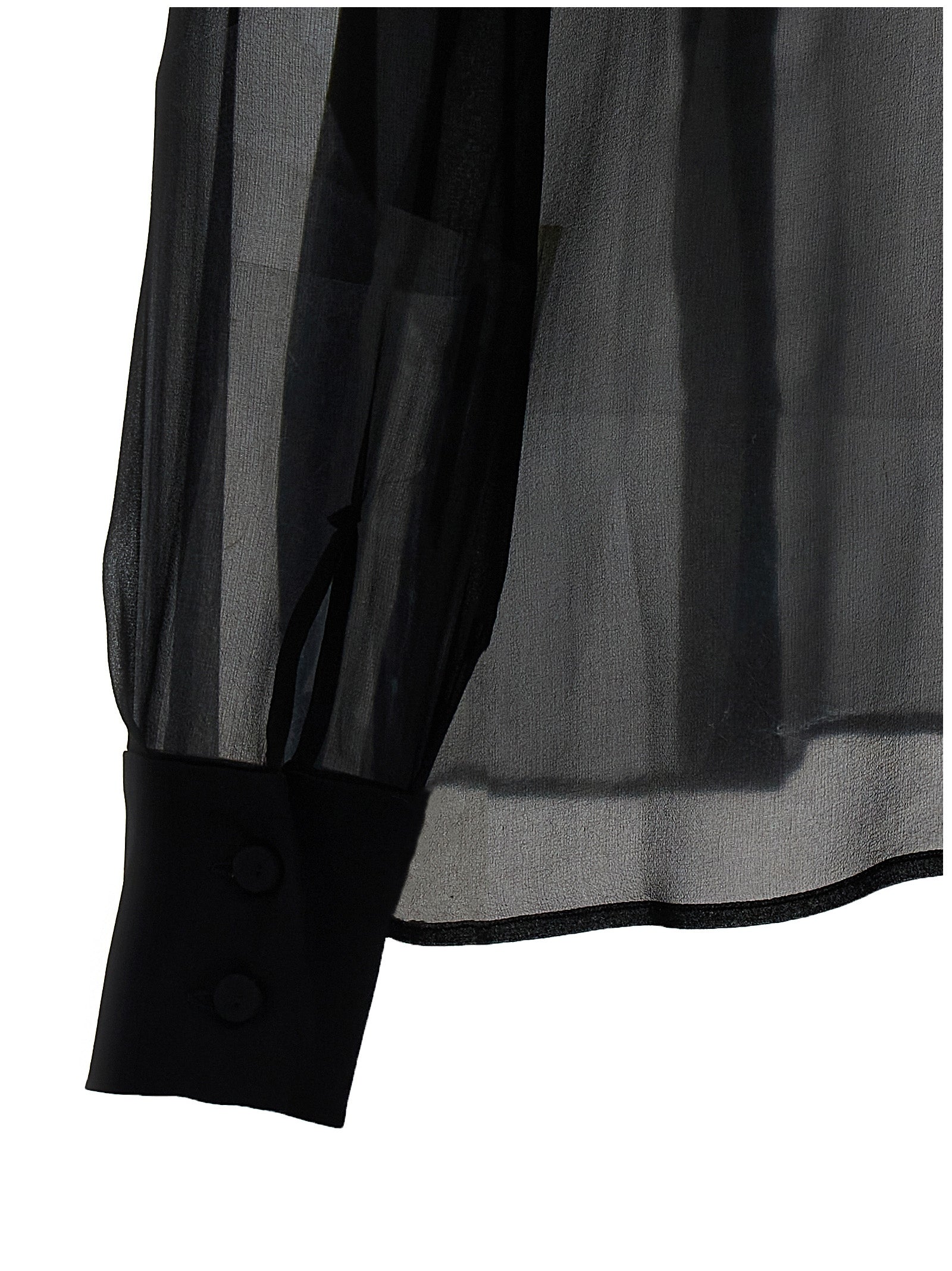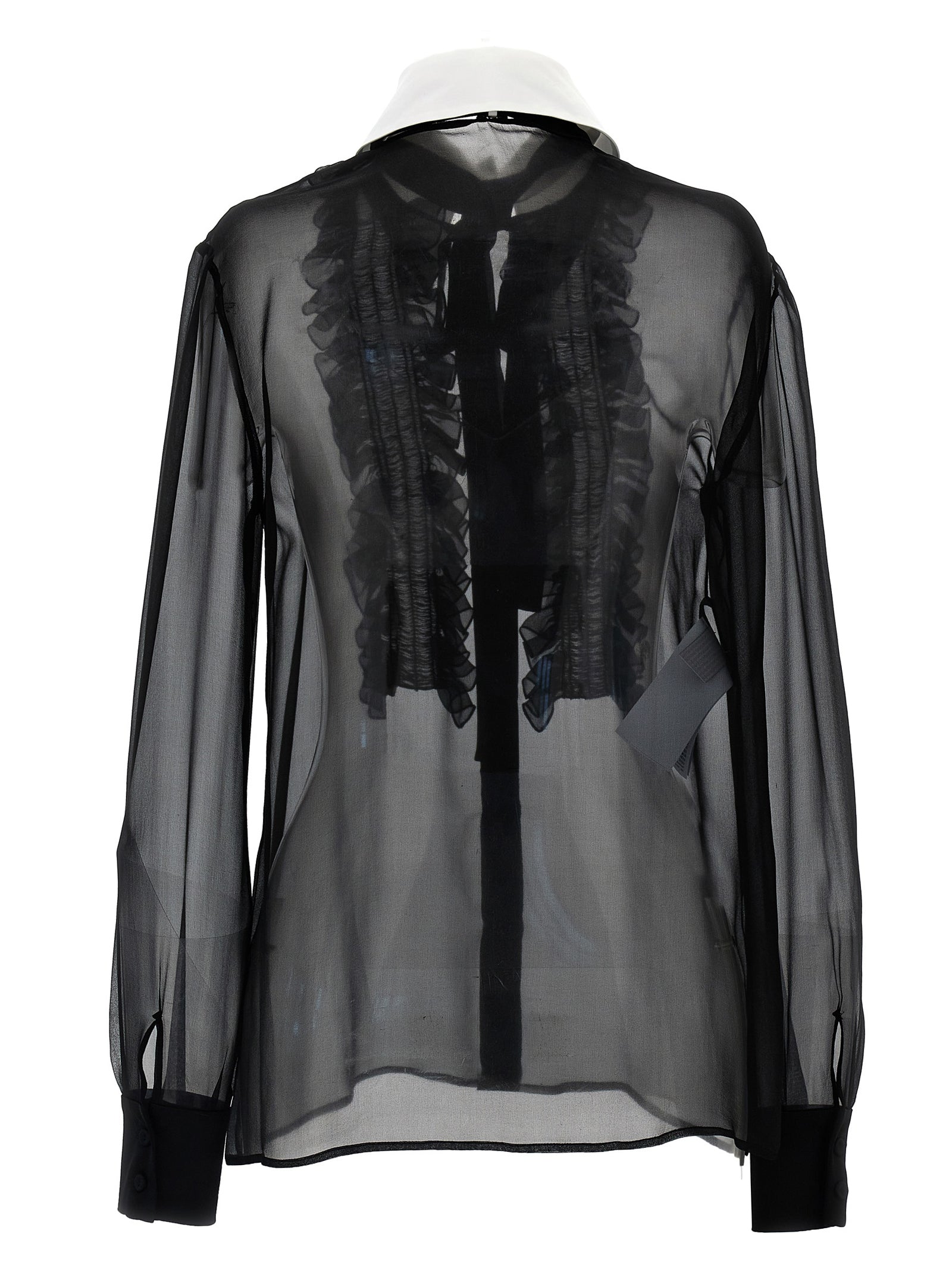 투명한 실크 셔츠, 주름이 달린 플라 스트 론, 목에 새시 넥타이 및 제거 가능한 대비 칼라, 커프가있는 긴 소매.