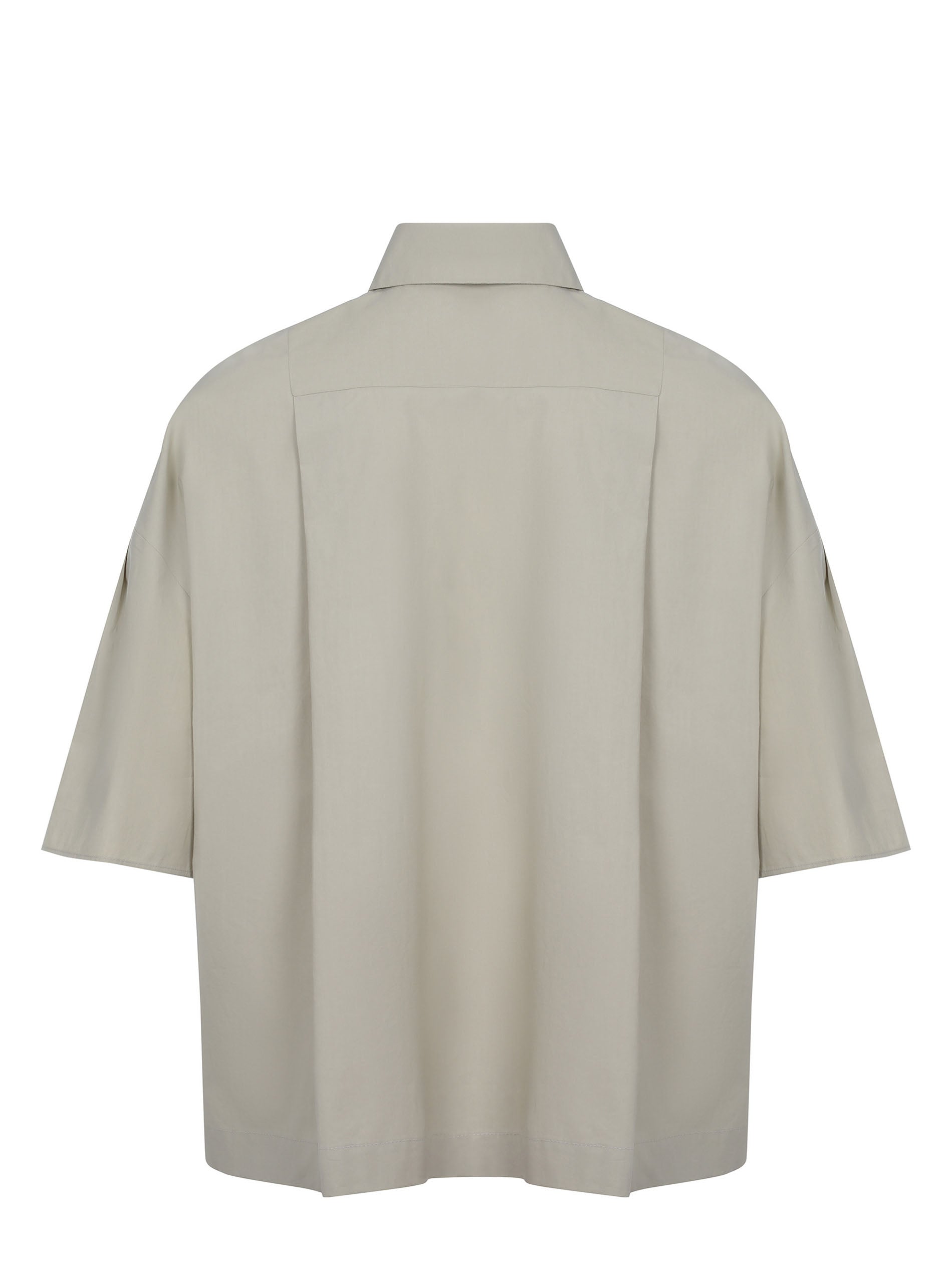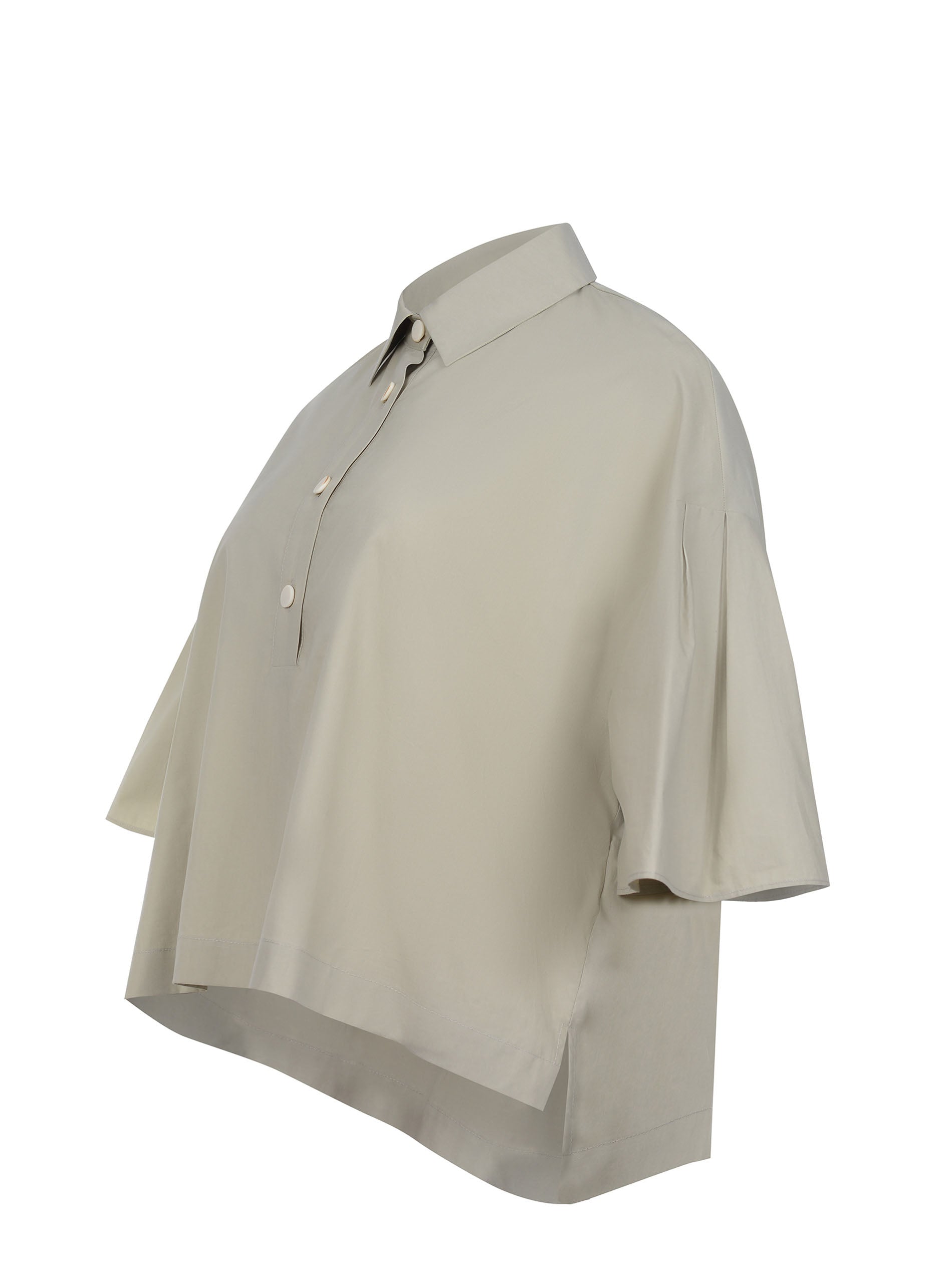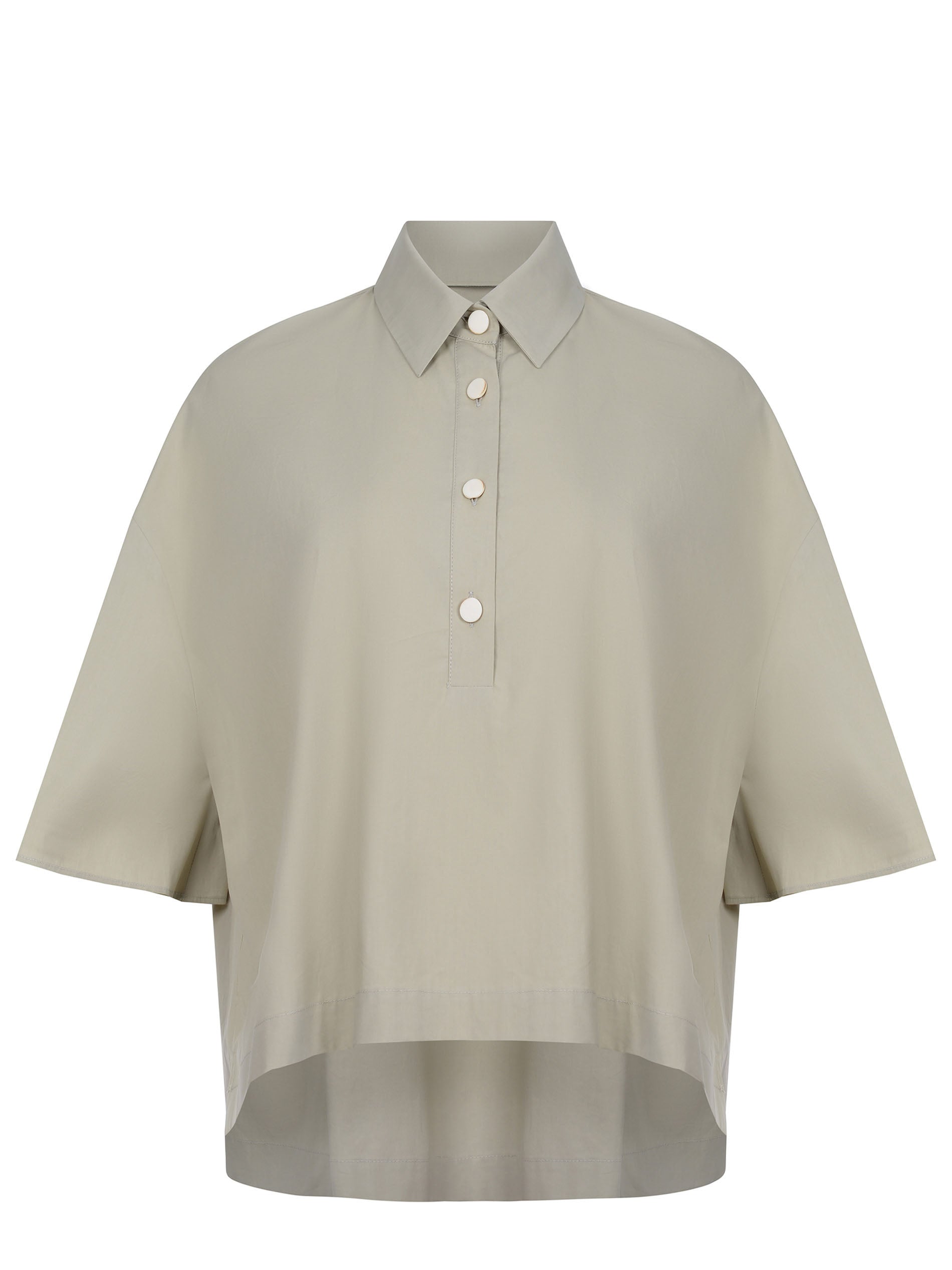 흰색면으로 만든 알리시 셔츠. 클래식 칼라. 넓은 짧은 소매. 앞면의 버튼. 사이드 슬릿. 뒤에서 비대칭. 100%면. 이탈리아에서 만들어졌습니다.