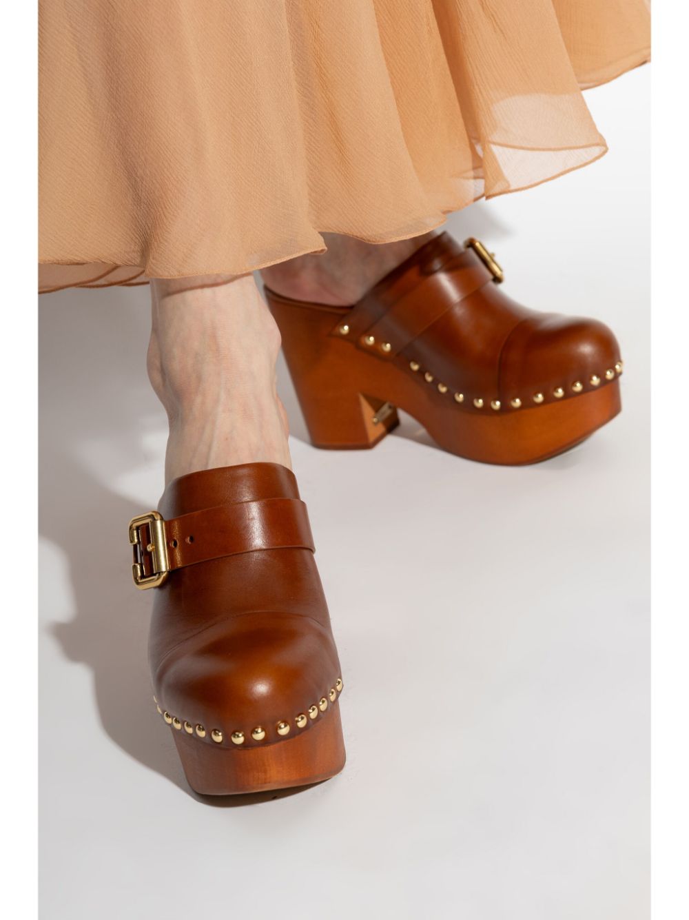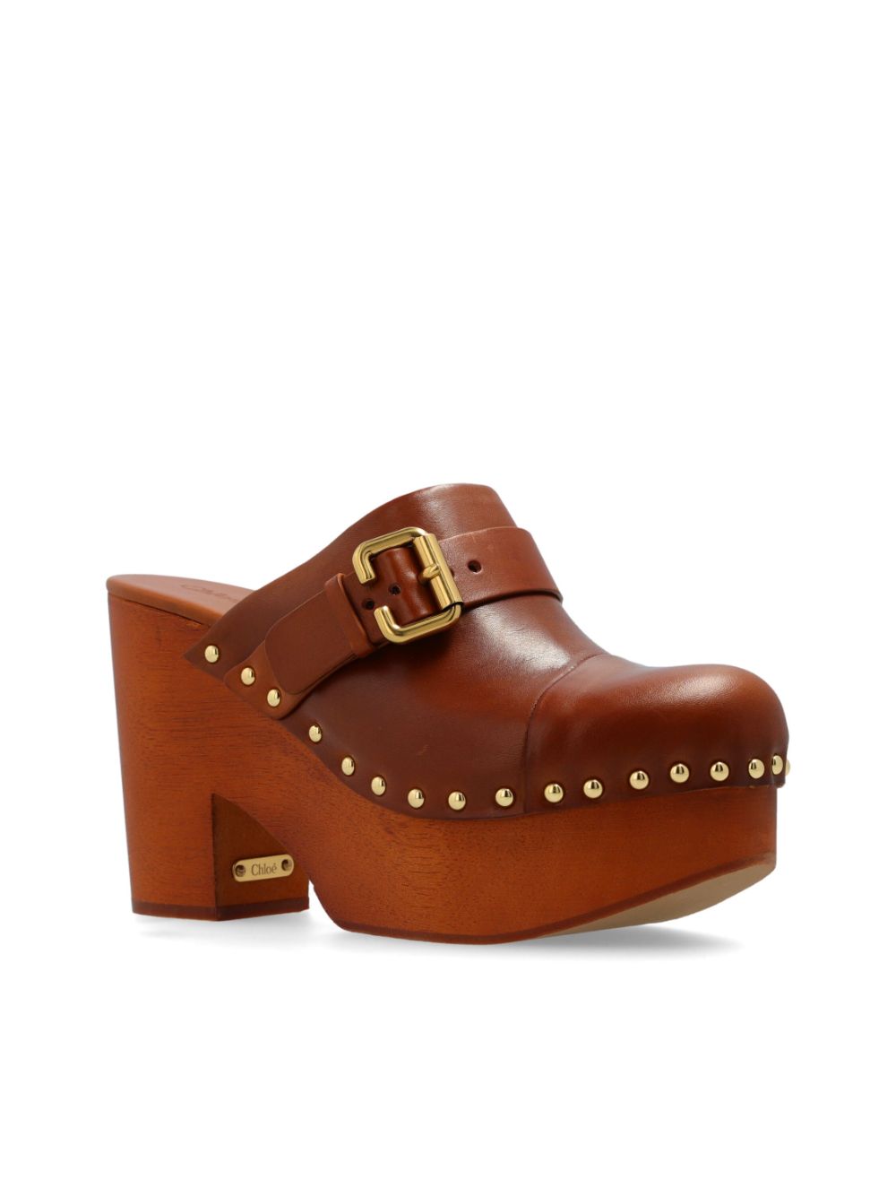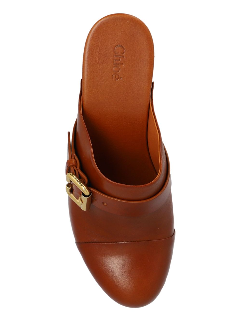 갈색 가죽 슬립 온 스타일 120mm 블록 힐 프론트 버클 고정 둥근 발가락