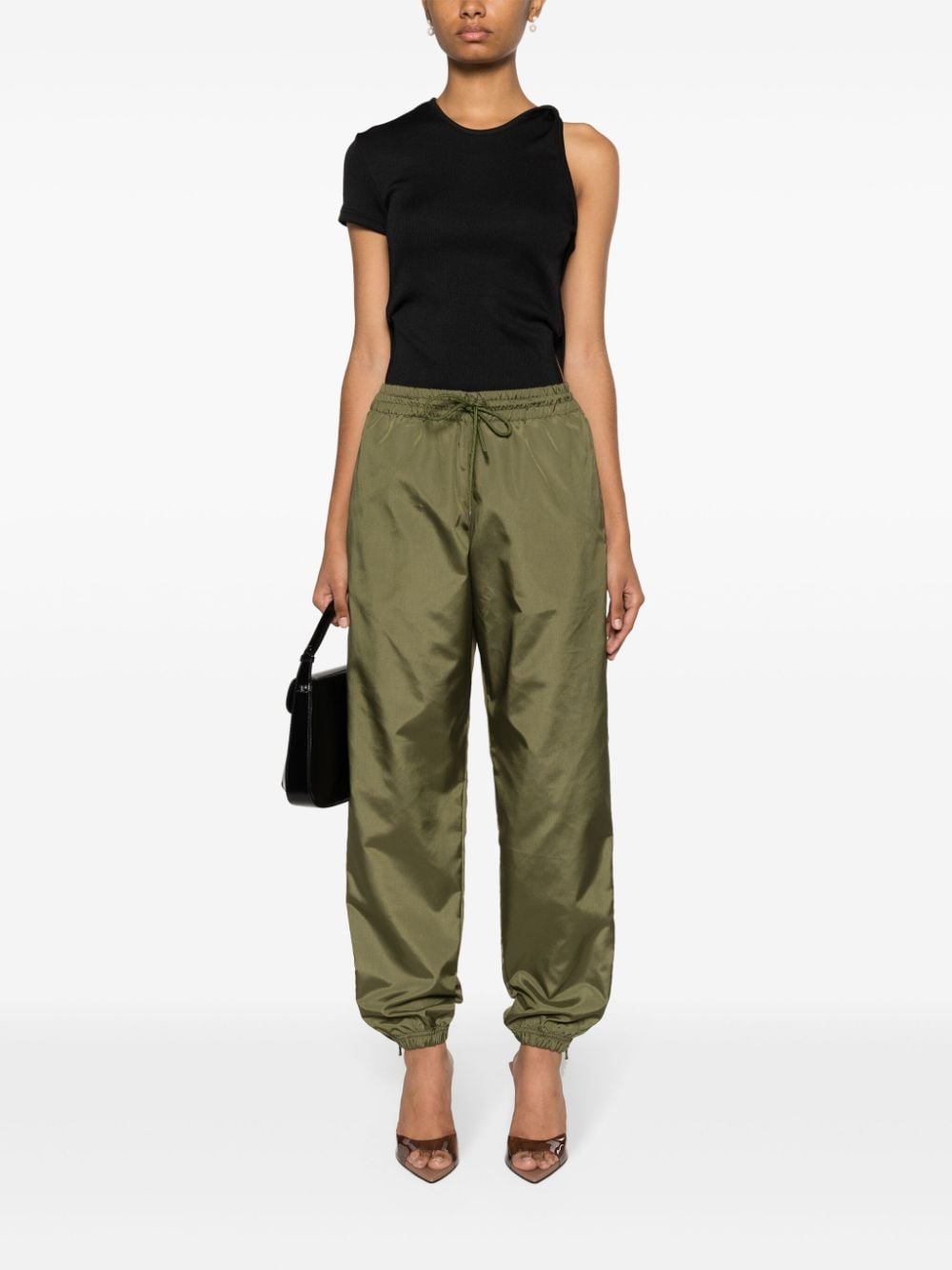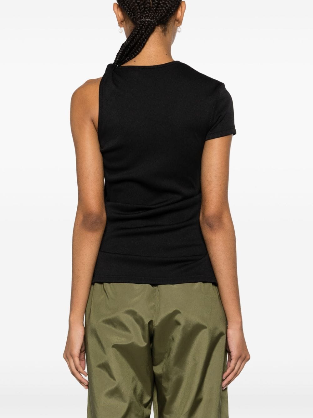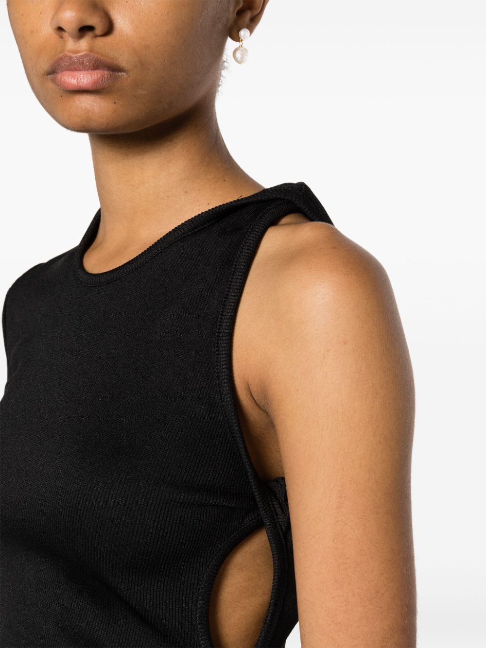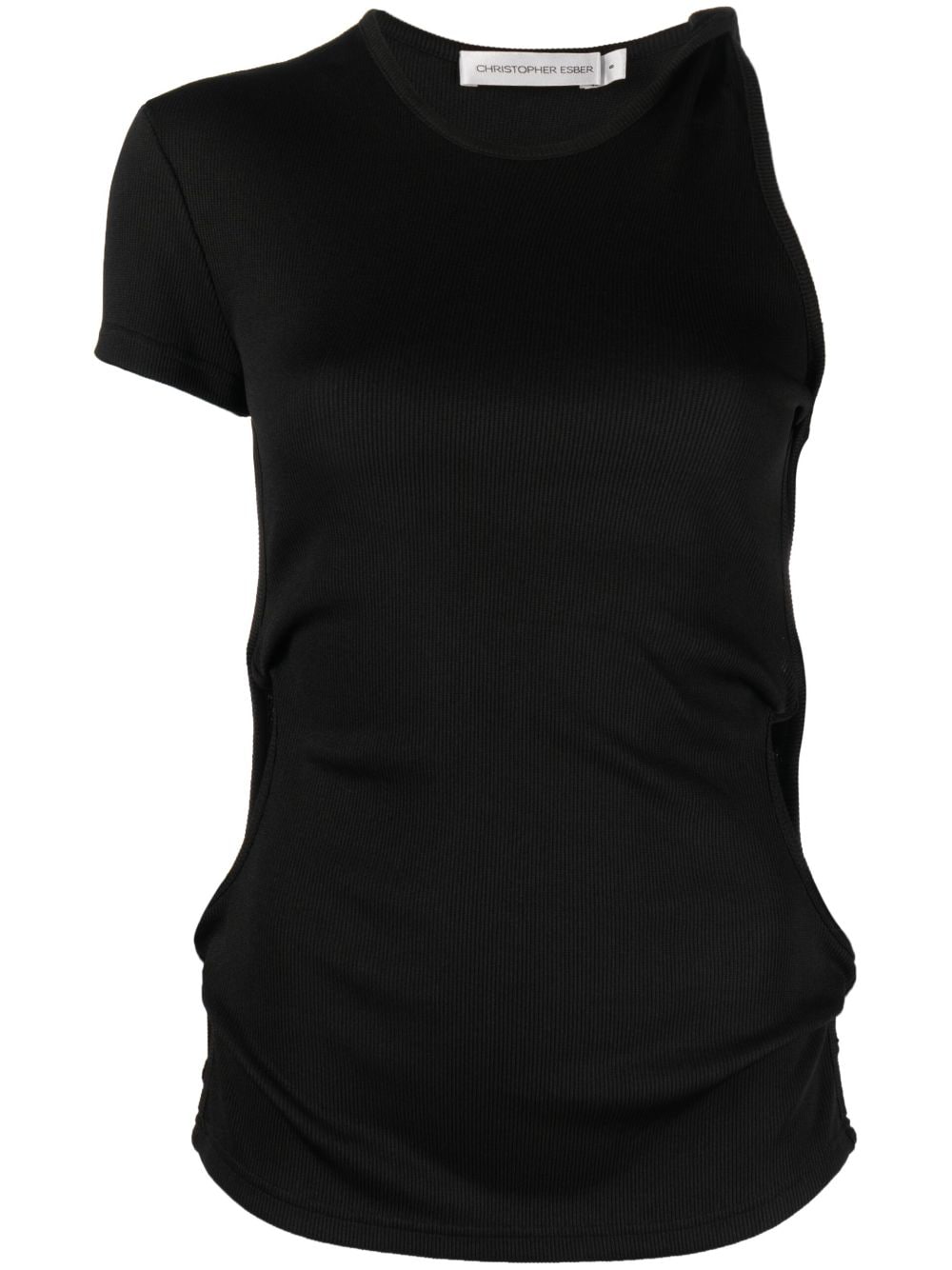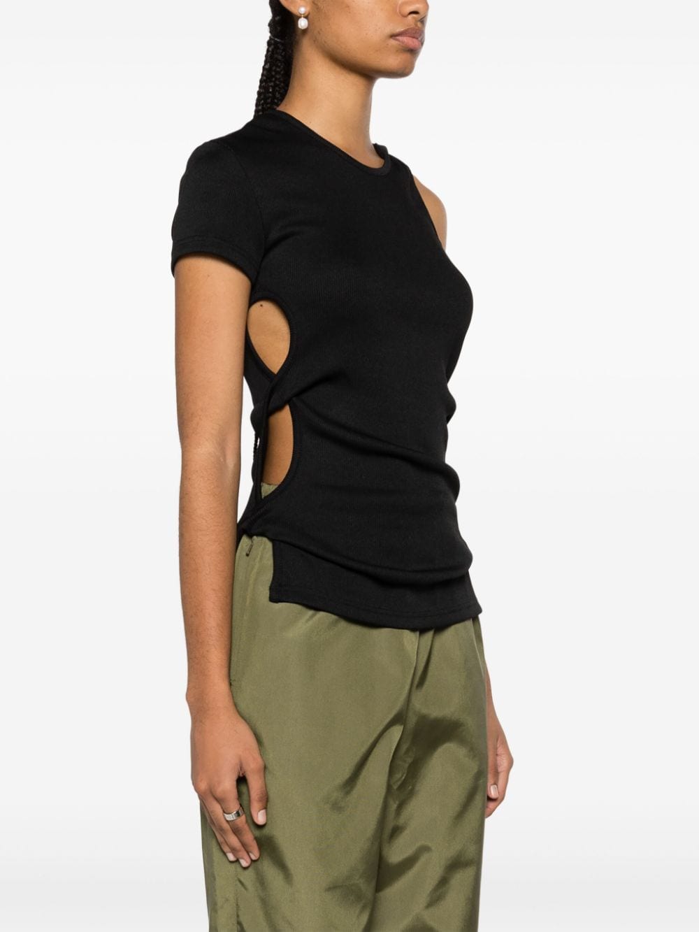 검은 스트레치 디자인 리브 베드 니트 컷 아웃 디테일 트위스트 트위스트 디테일 비대칭 디자인 라운드 목 싱글 짧은 슬리브 짧은 사이드 슬릿 직선 밑단