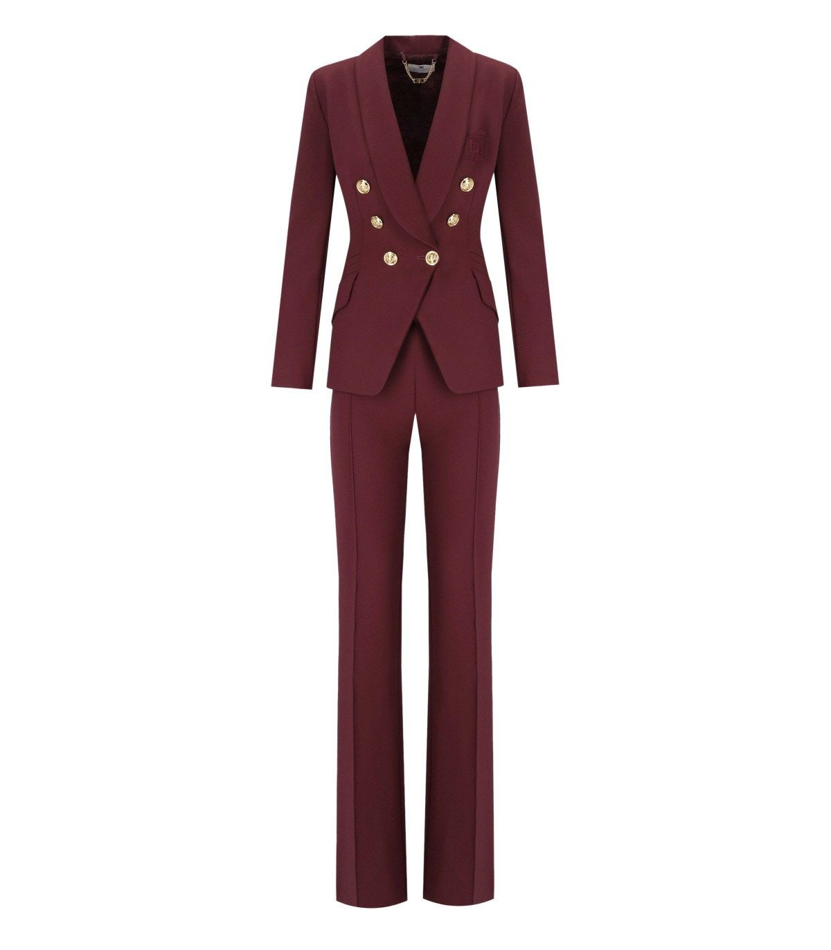 부르고뉴 그늘에서 이중 스트레치 크레페로 만든 엘리자베타 프랜치 (Elisabetta Franchi)의 맞춤형 양복. 웰트 포켓과 자수 플랩이있는 더블 브레스트 재킷이 특징입니다. 황금 금속 버튼으로 장식 된 폐쇄. 모노그램 새틴의 내부 안감. 이 소송은 옆에 보이지 않는 지퍼가있는 Palazzo 바지가 특징입니다. 가슴에 로고 엠블럼. 슬림 한 적합. 모델의 키는 177cm이며 크기 40을 착용합니다. IT. 조성 : 96% 폴리 에스테르 04% 엘라 스탄.