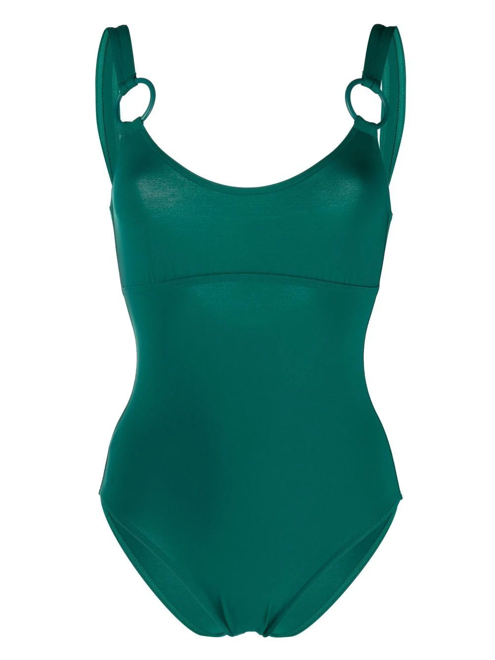 Dark green, stretch design, scoop neck, sleeveless, ring detail, keyhole back and high cut leg. Swimwear must be tried on with your own undergarment.