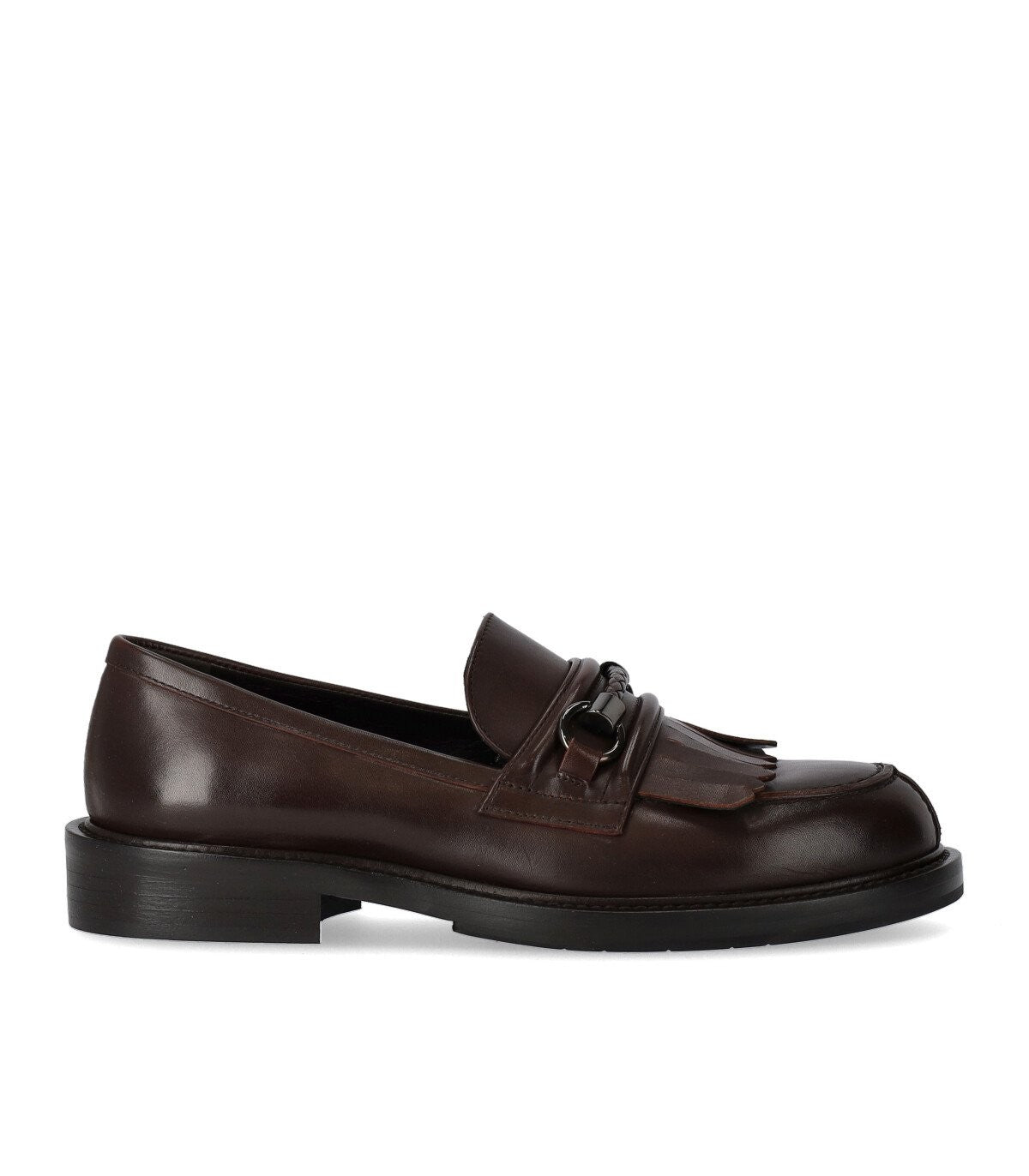 Guglielmo Rotta의 Priska Loafer는 갈색 가죽으로 만들어졌으며 말 비트와 프린지로 장식되어 있습니다. 가죽 안감과 삽입. 가죽 밑창, 높이 3cm.